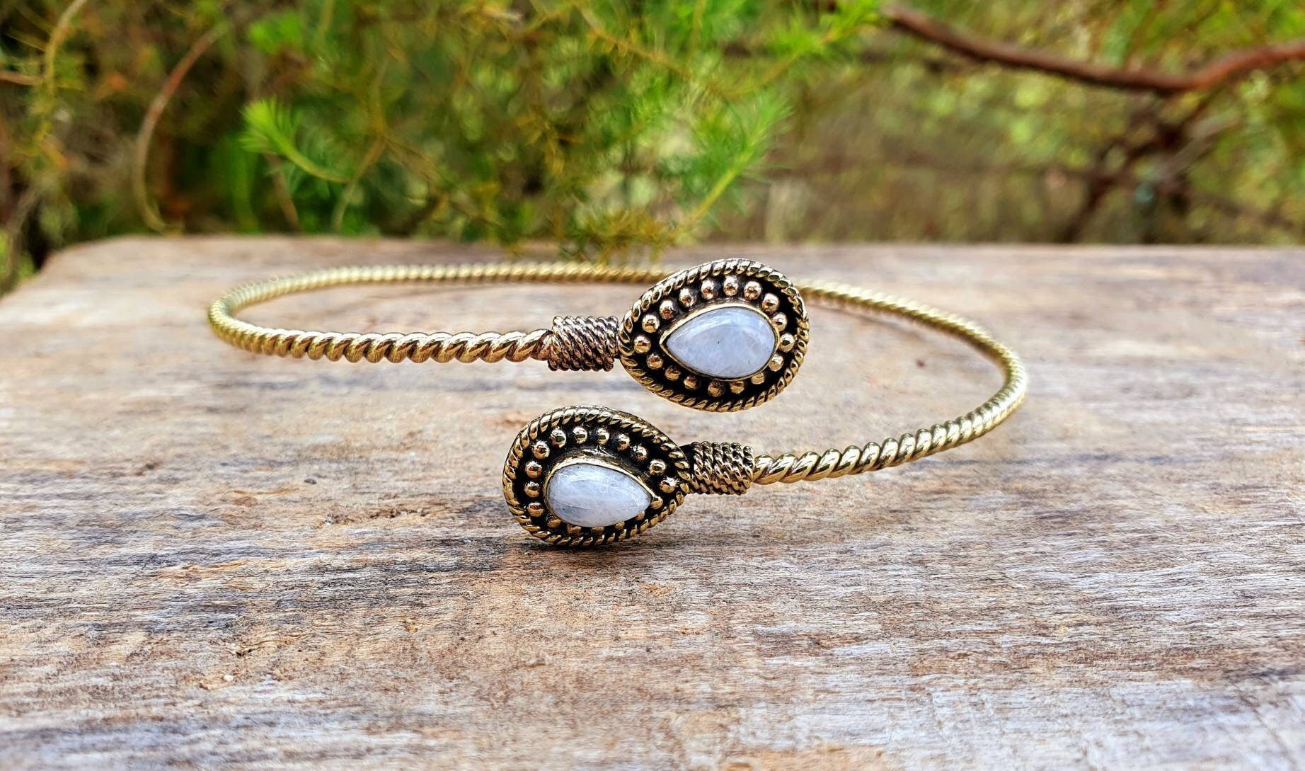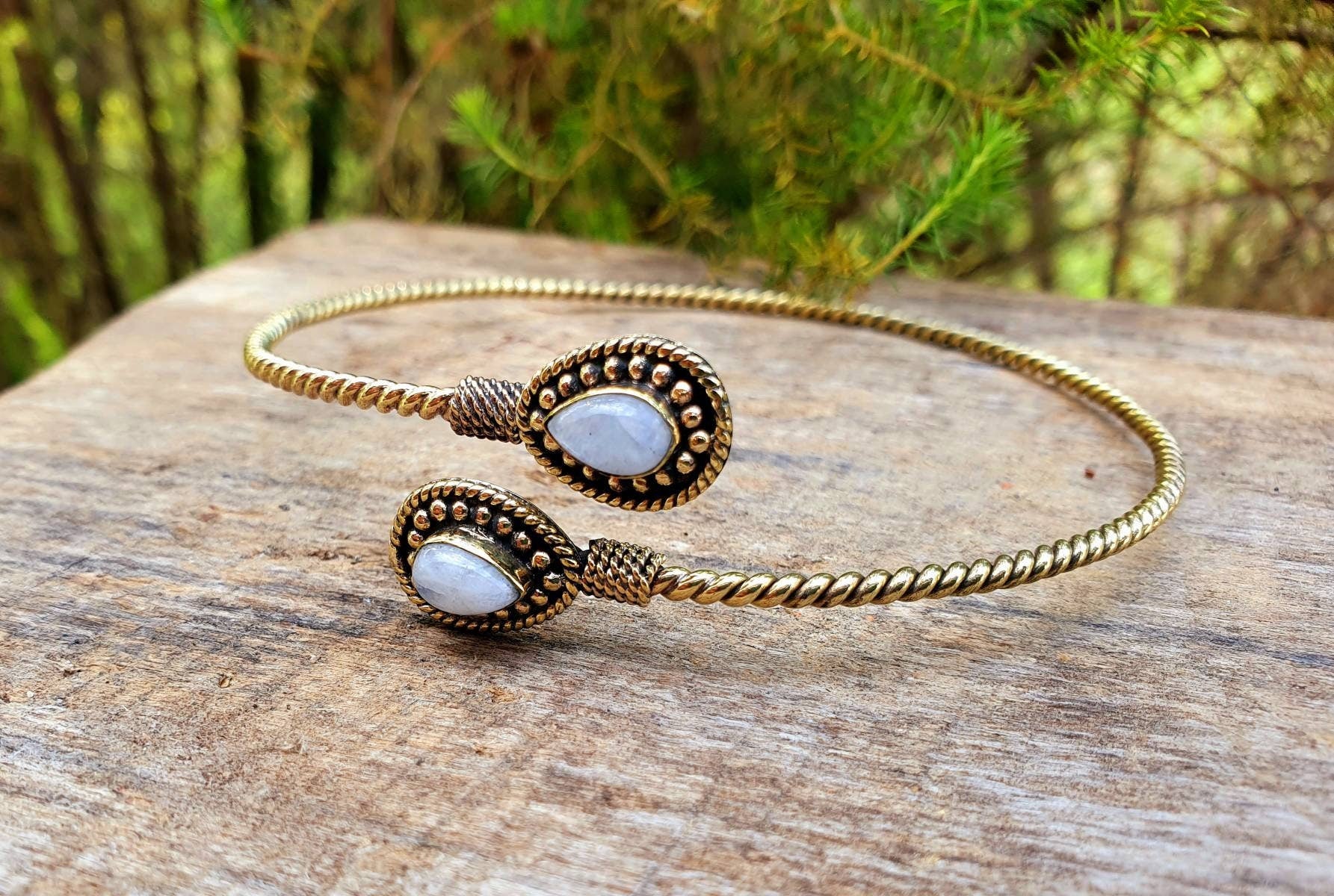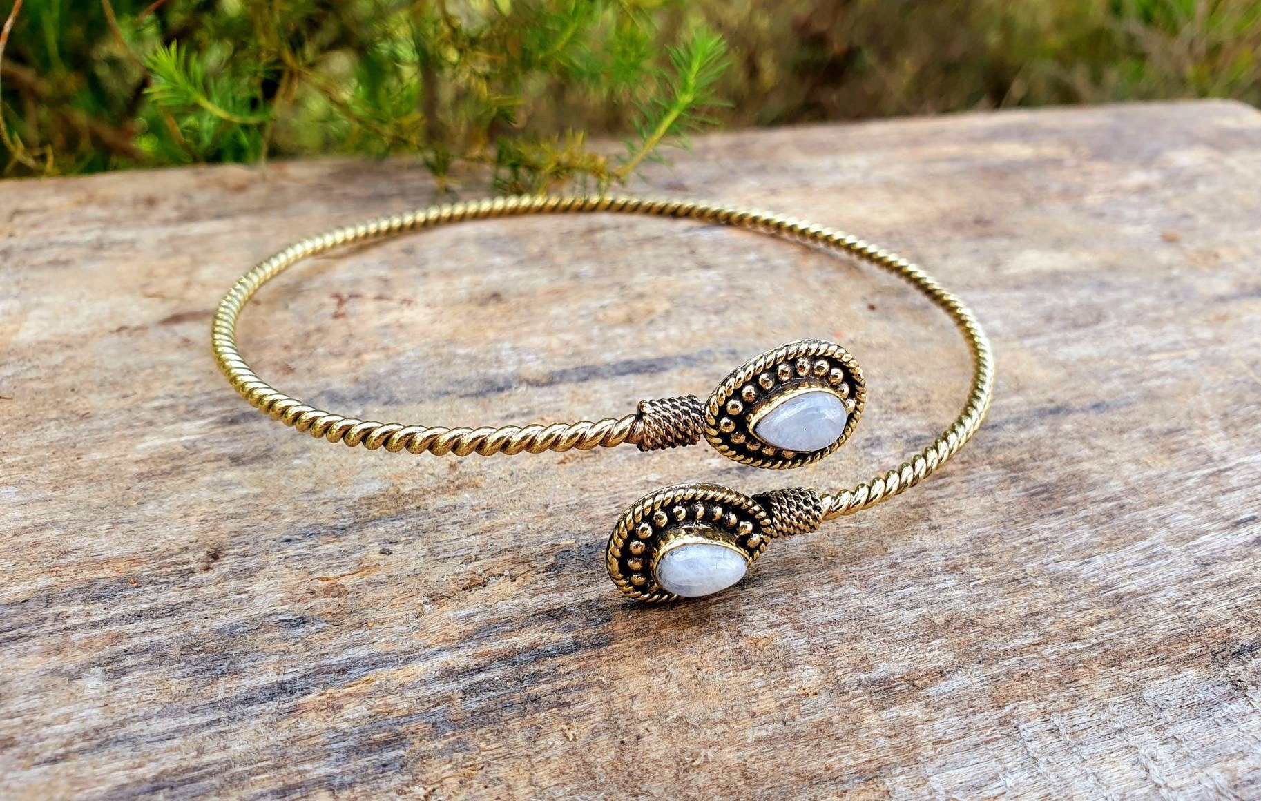 Beautiful spiral golden arm bracelet and moonstone.