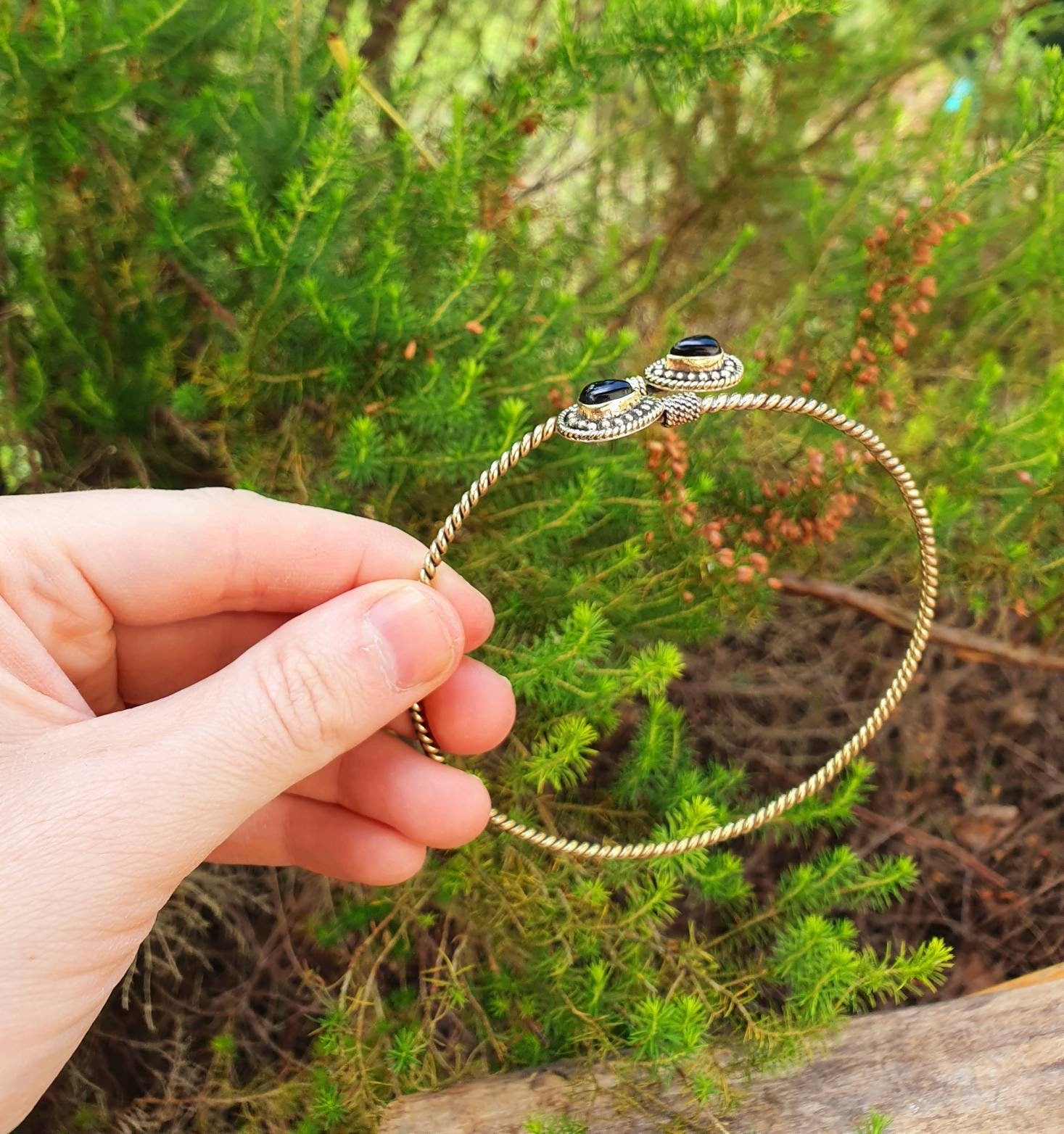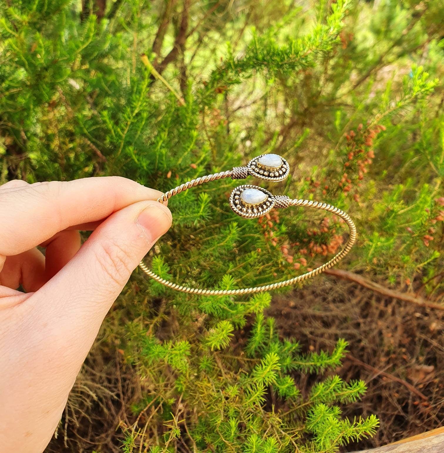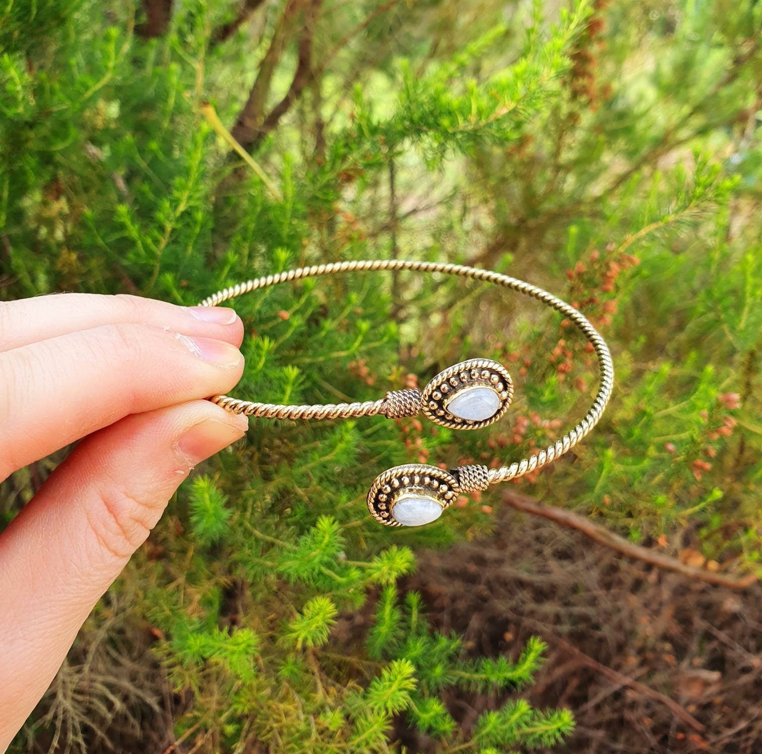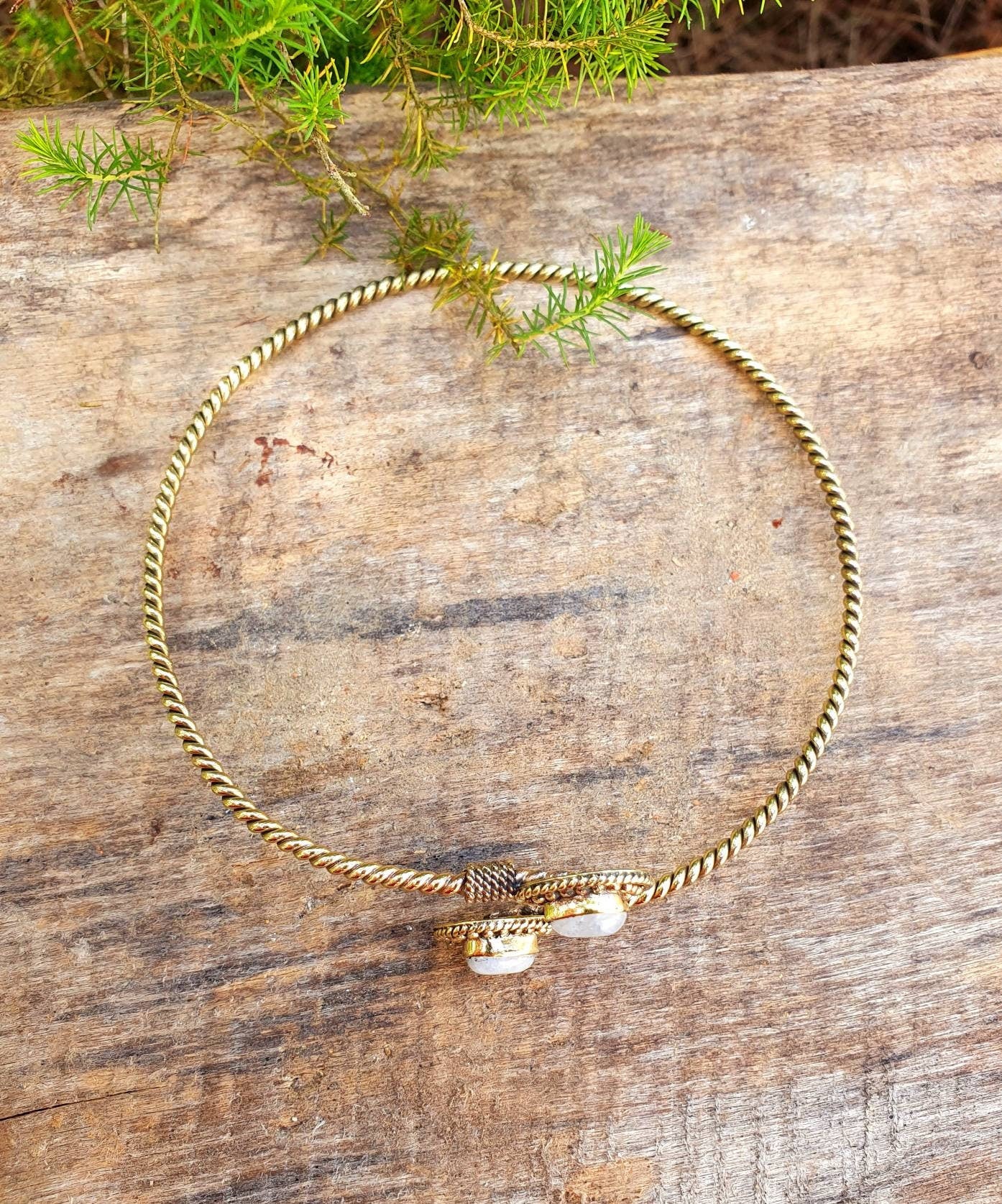 Beautiful spiral golden arm bracelet and moonstone.