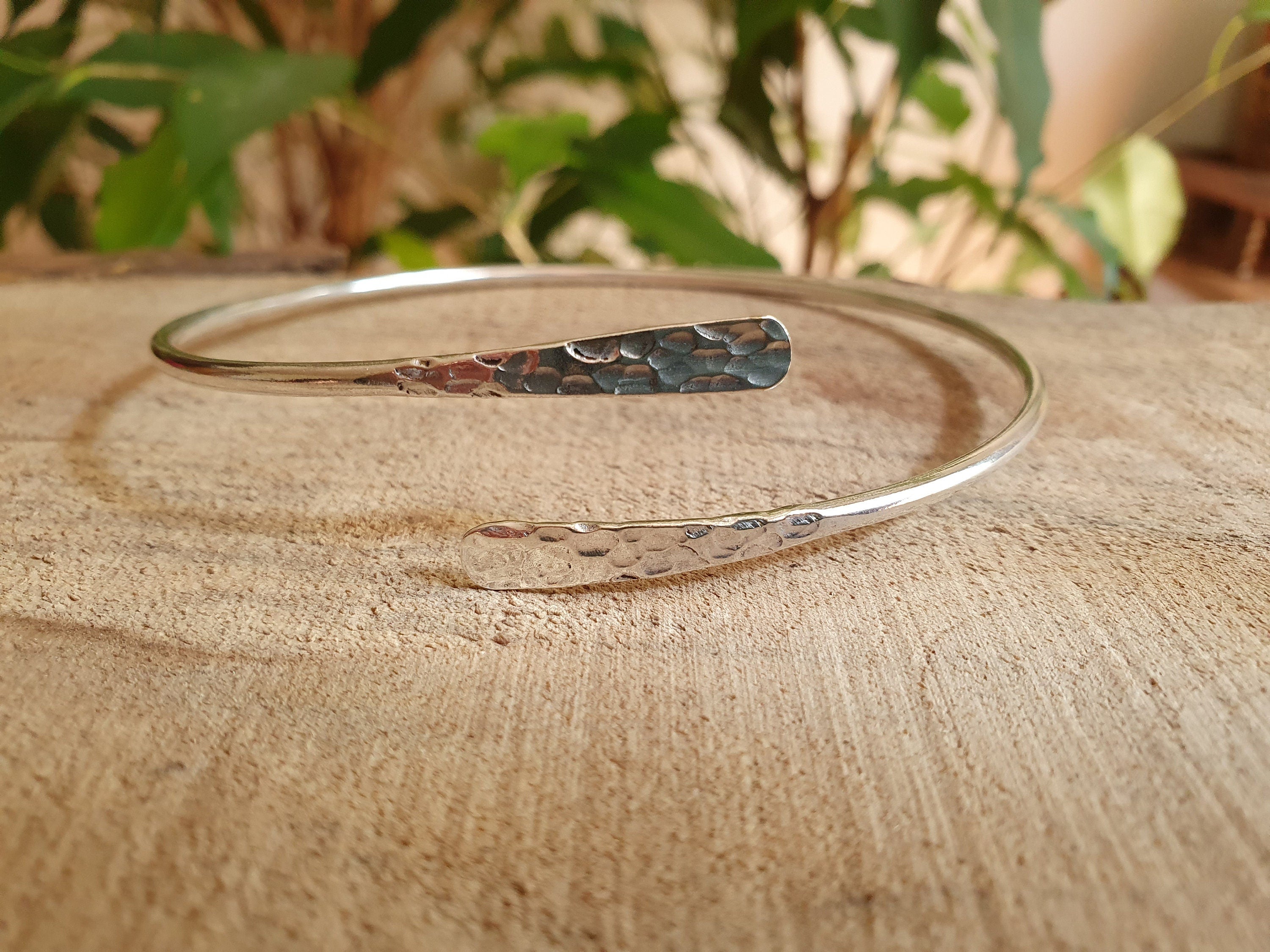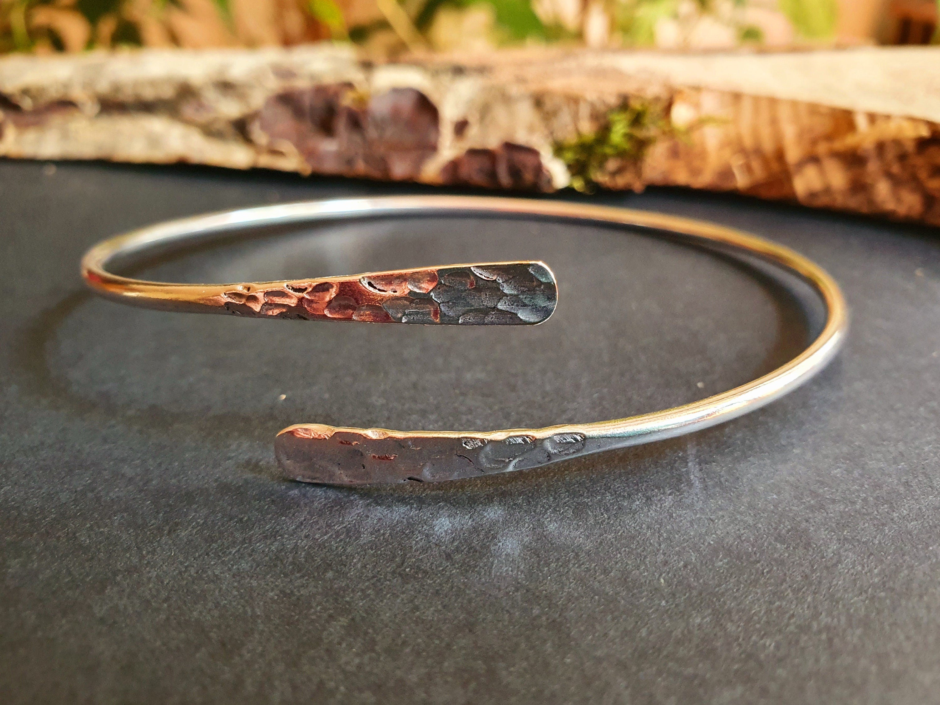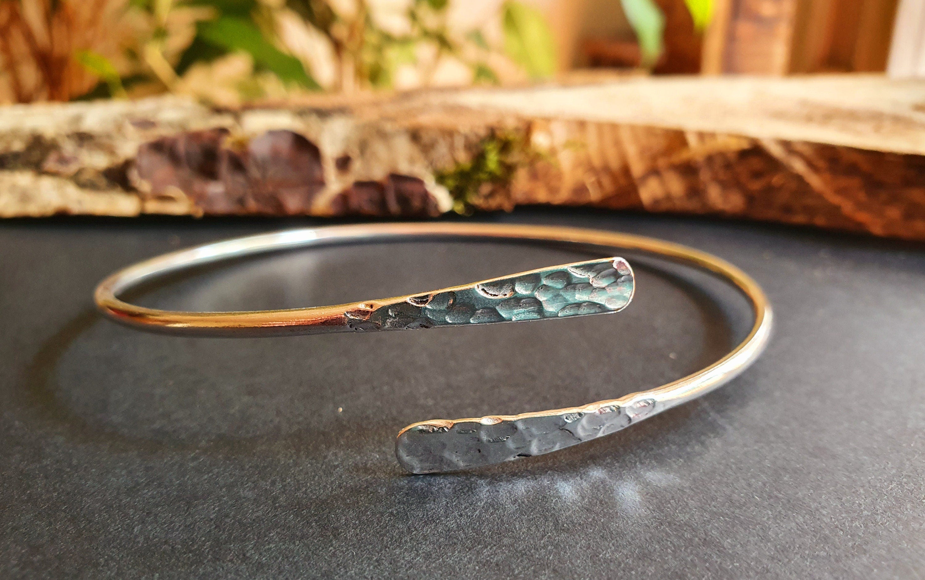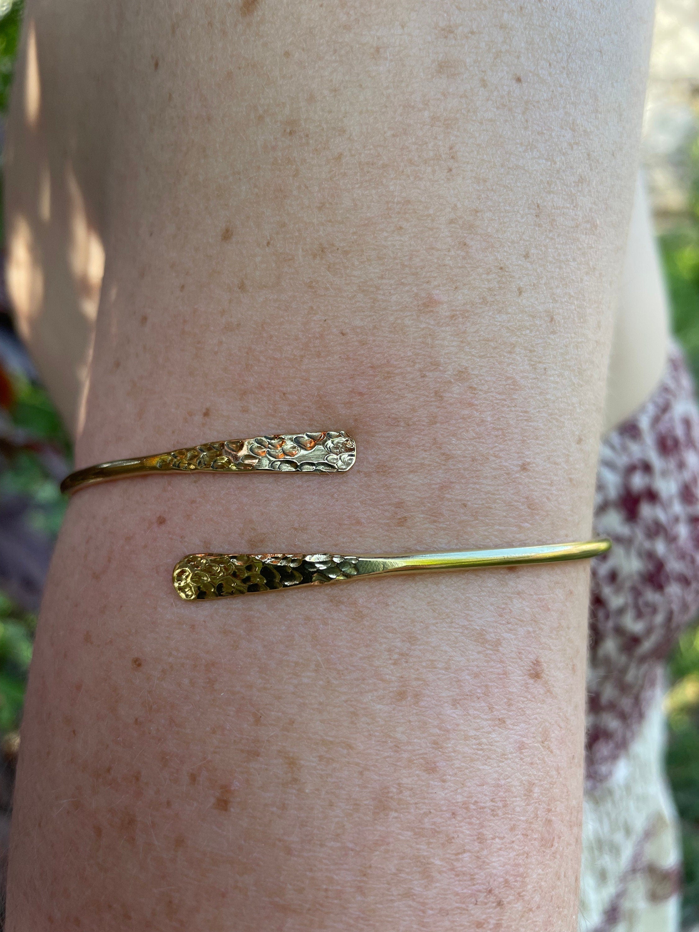 Beautiful spiral silver plated arm bracelet with hammered brass effect.