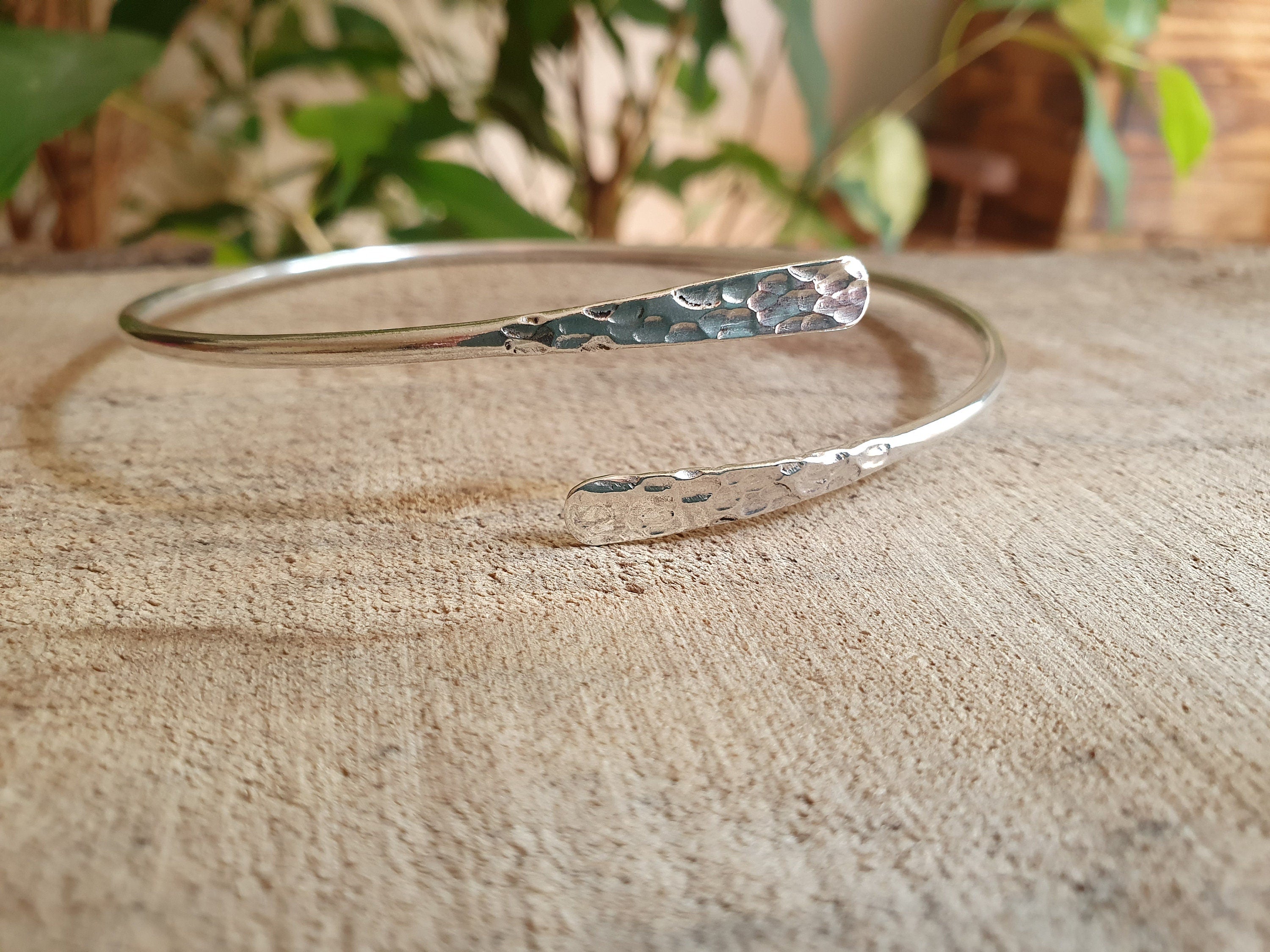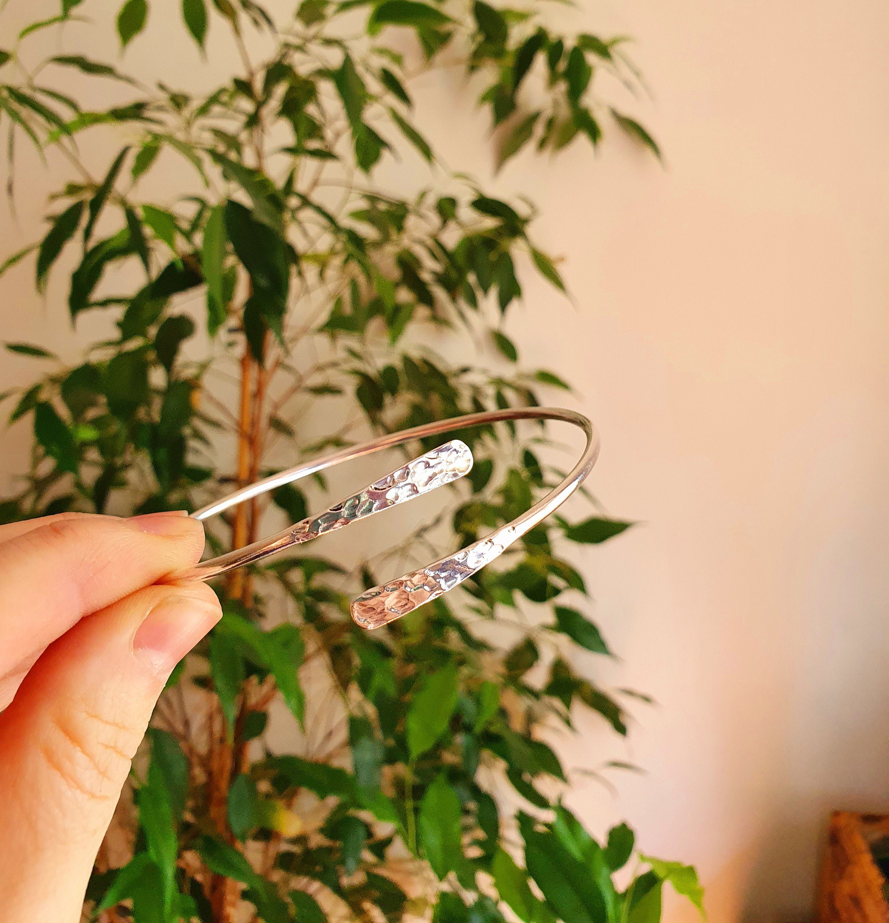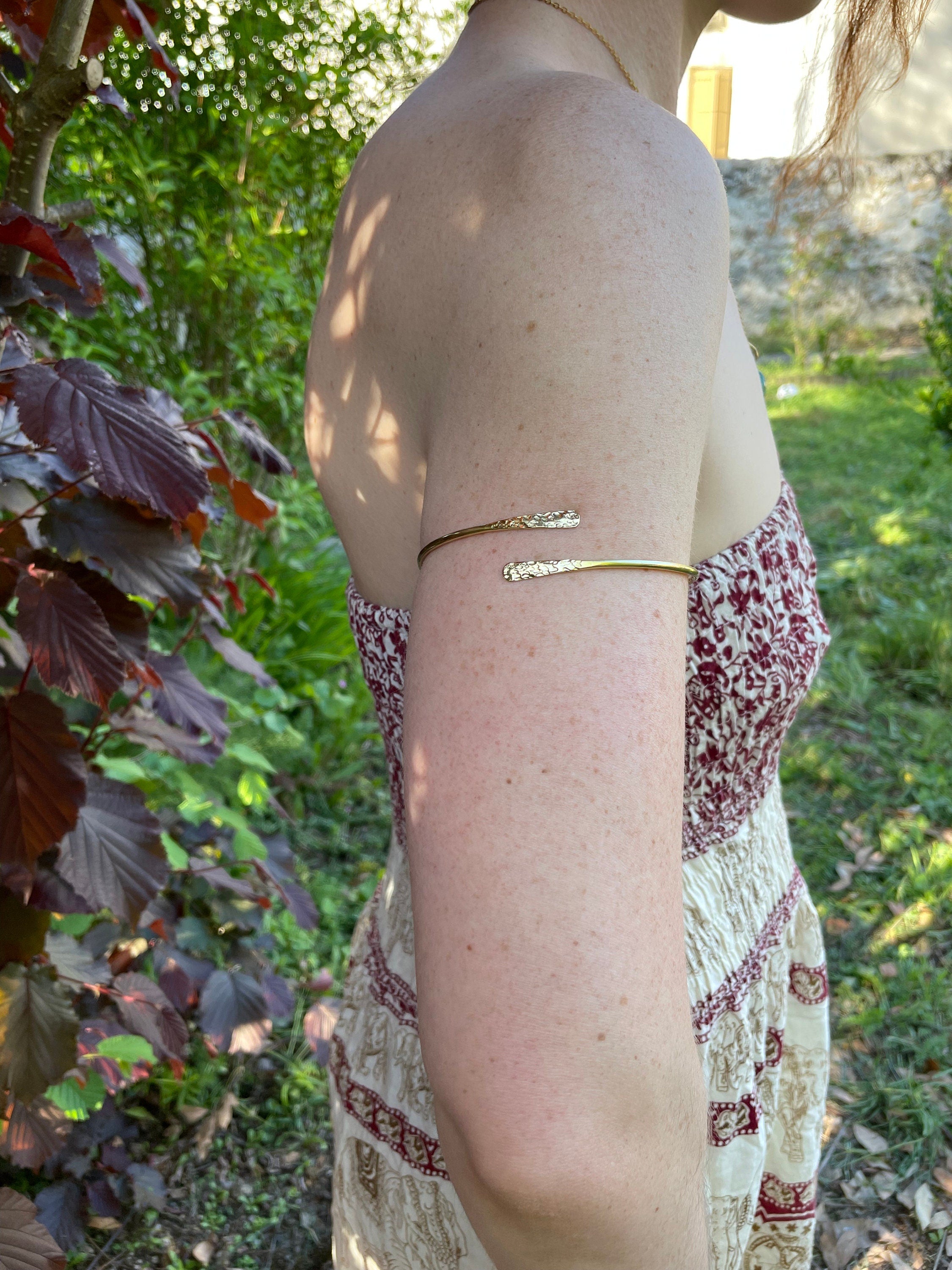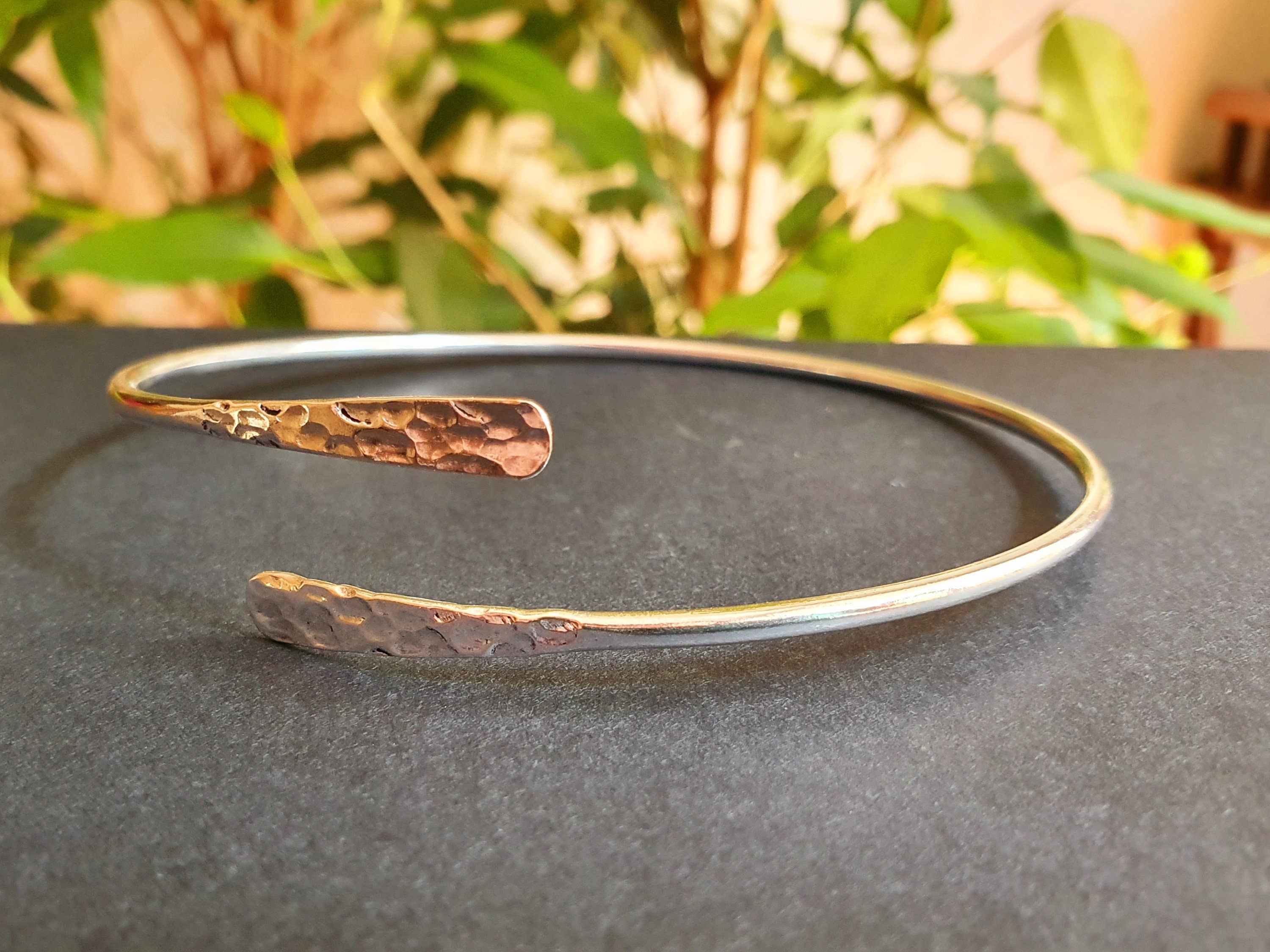 Beautiful spiral silver plated arm bracelet with hammered brass effect.