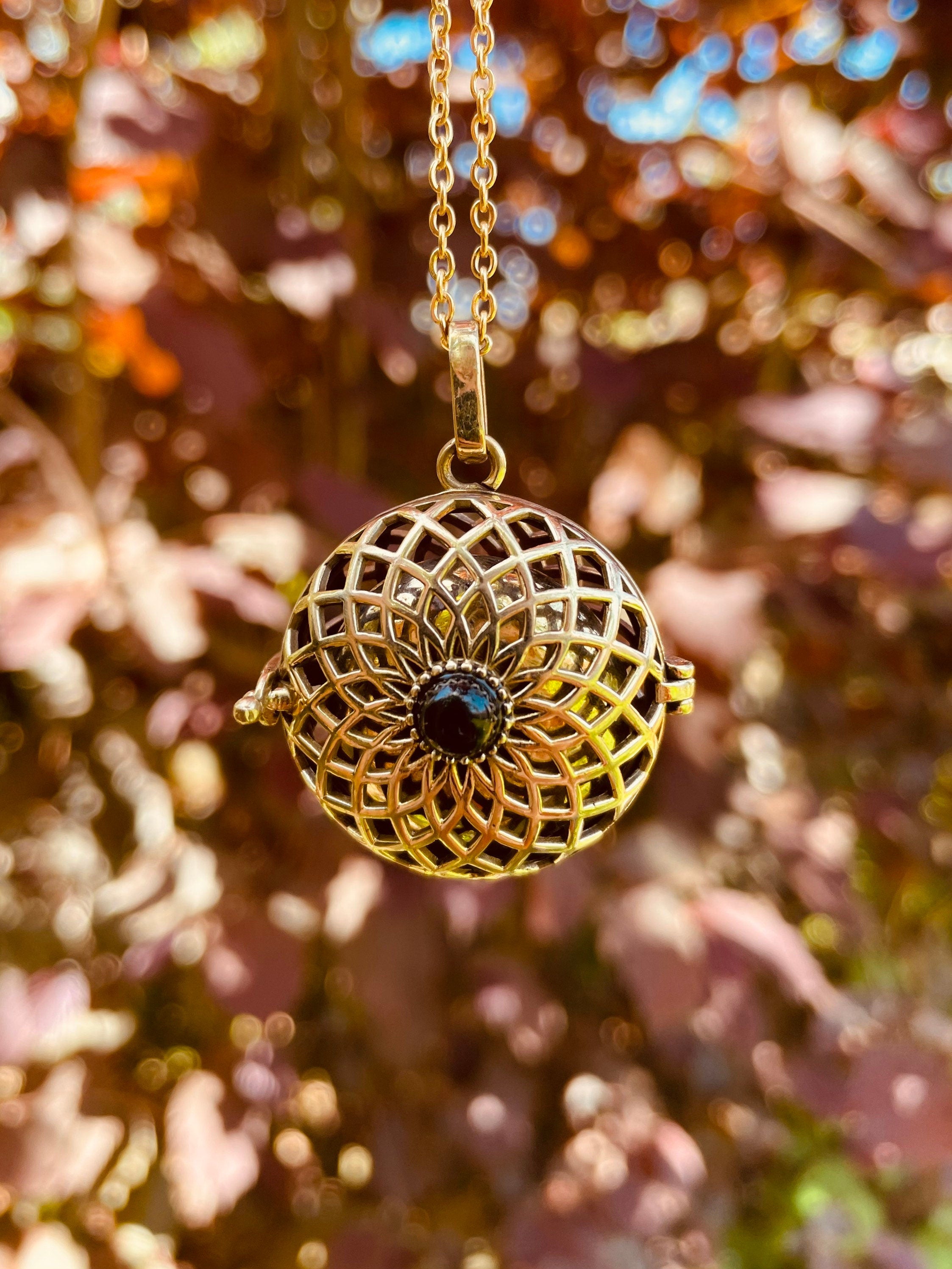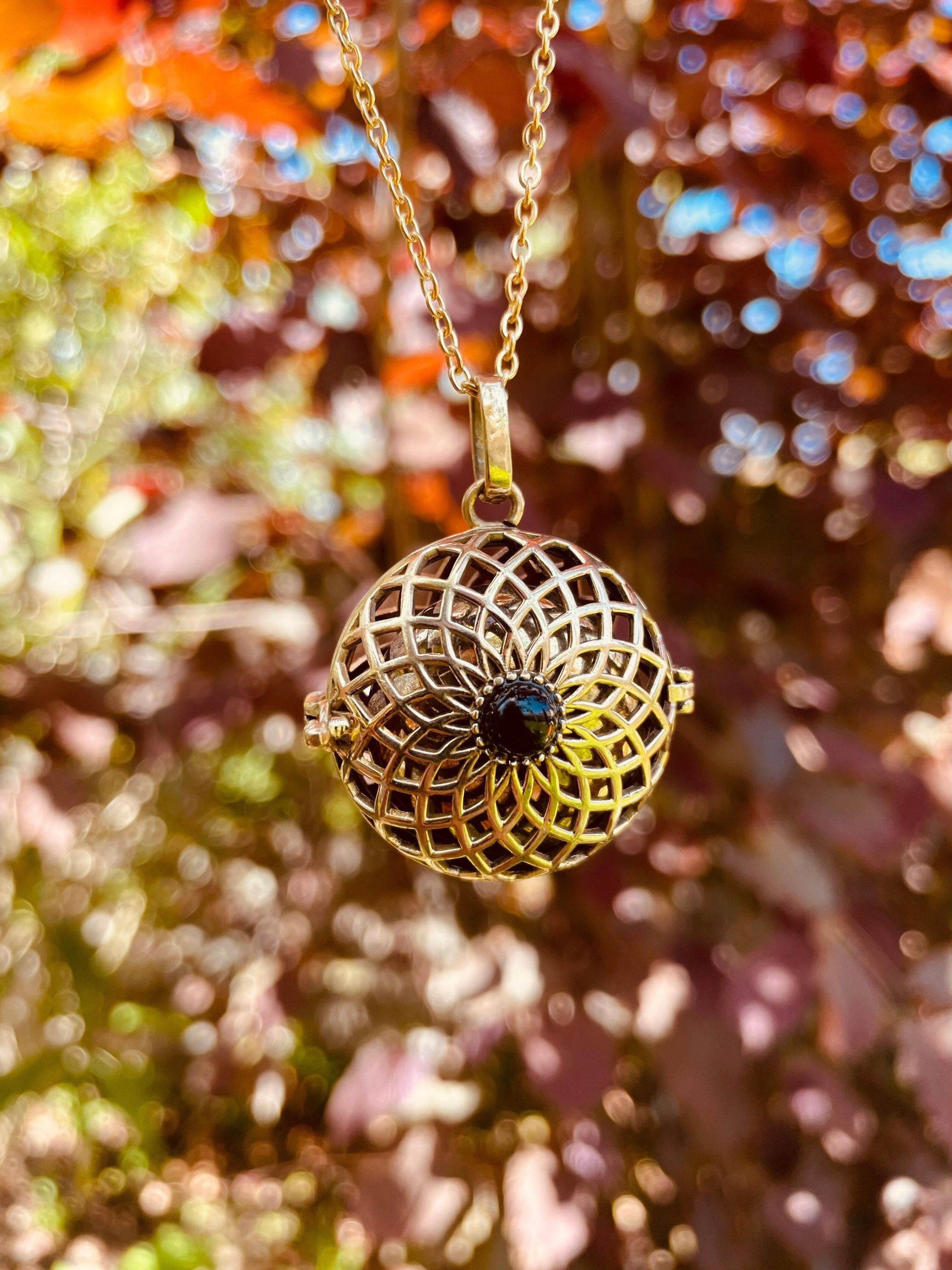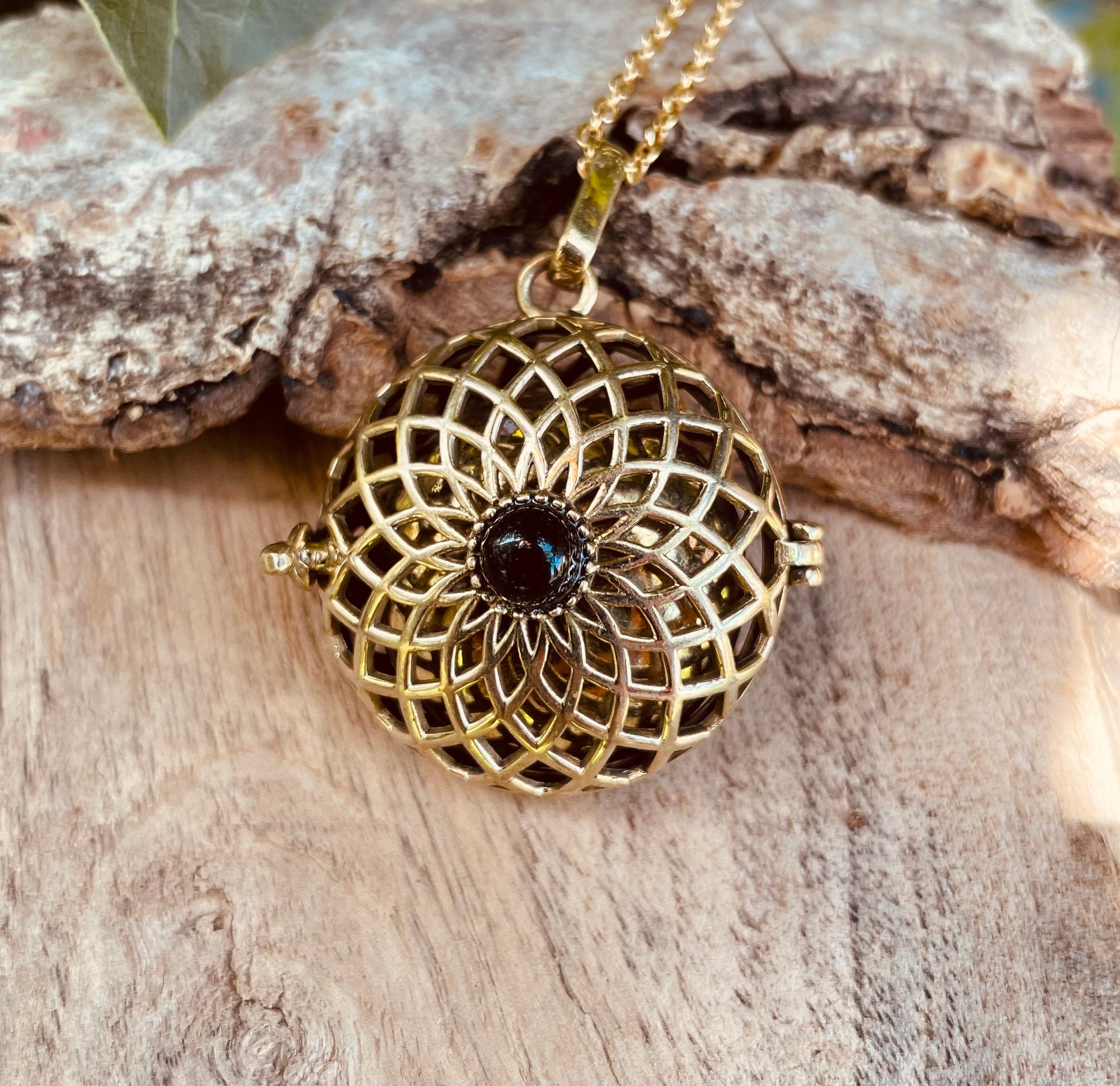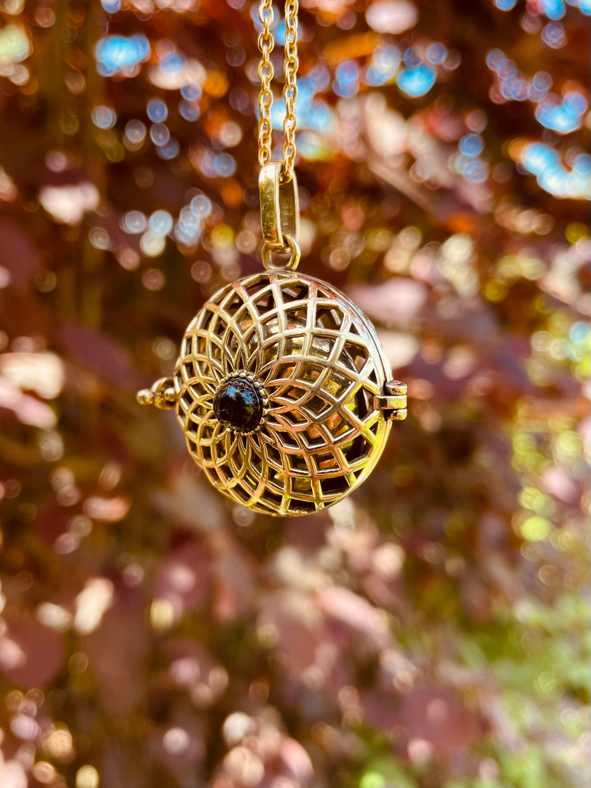 Inside this beautiful brass pendant is a brass bell which makes a soft chiming sound as it moves.