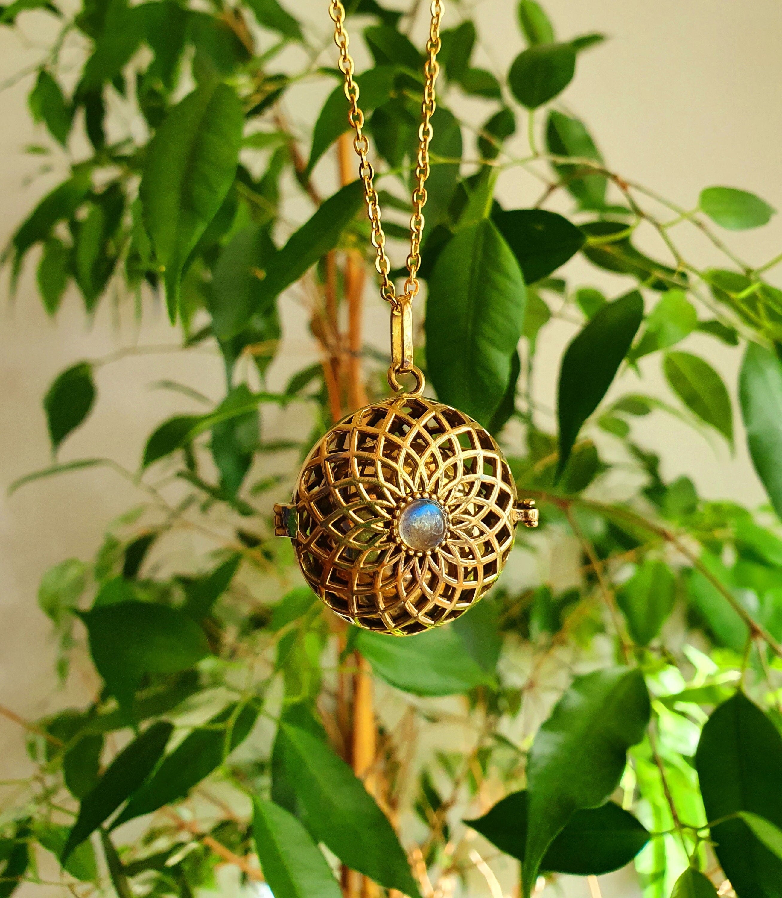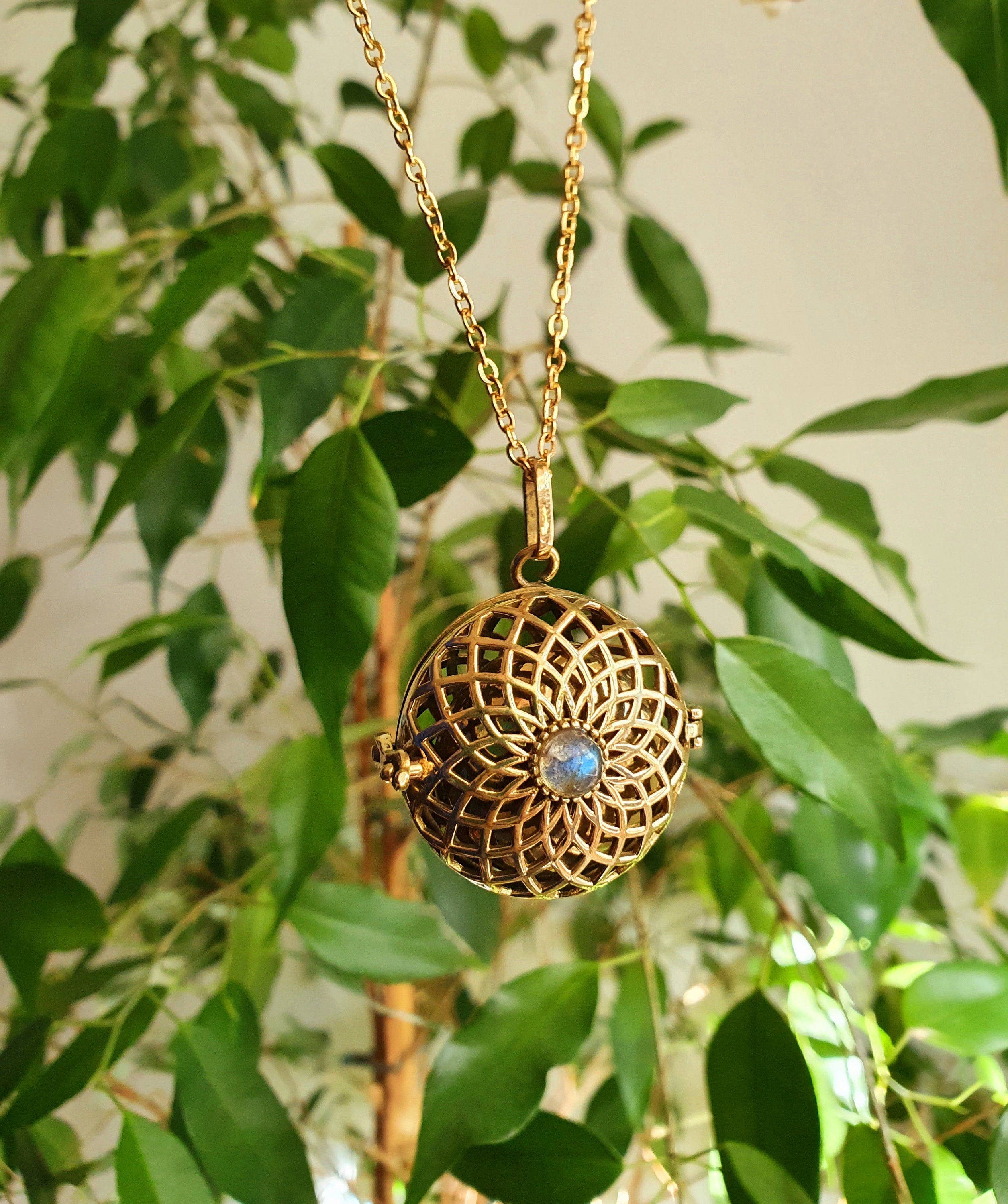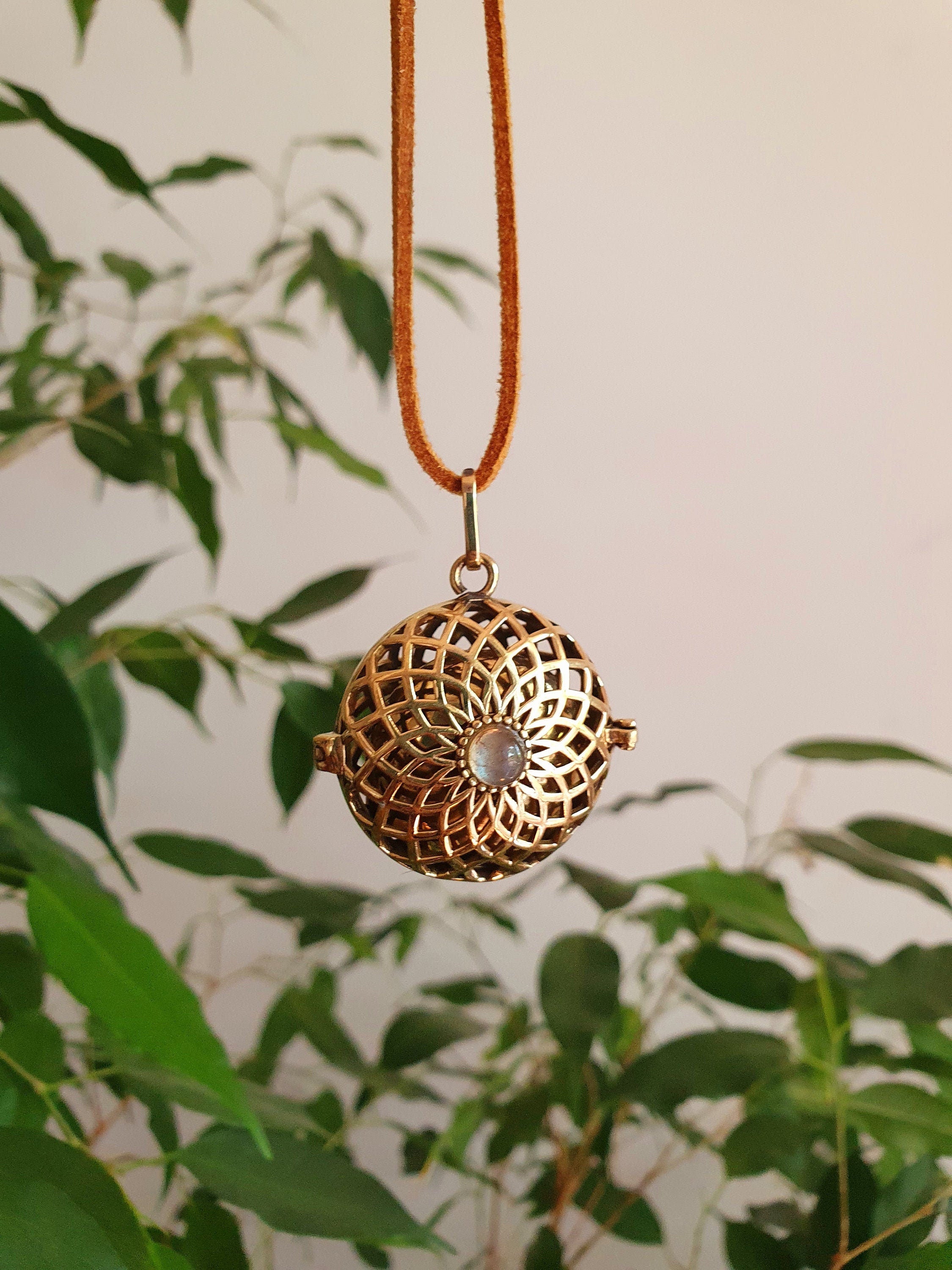 Inside this beautiful brass pendant is a brass bell which makes a soft chiming sound as it moves.