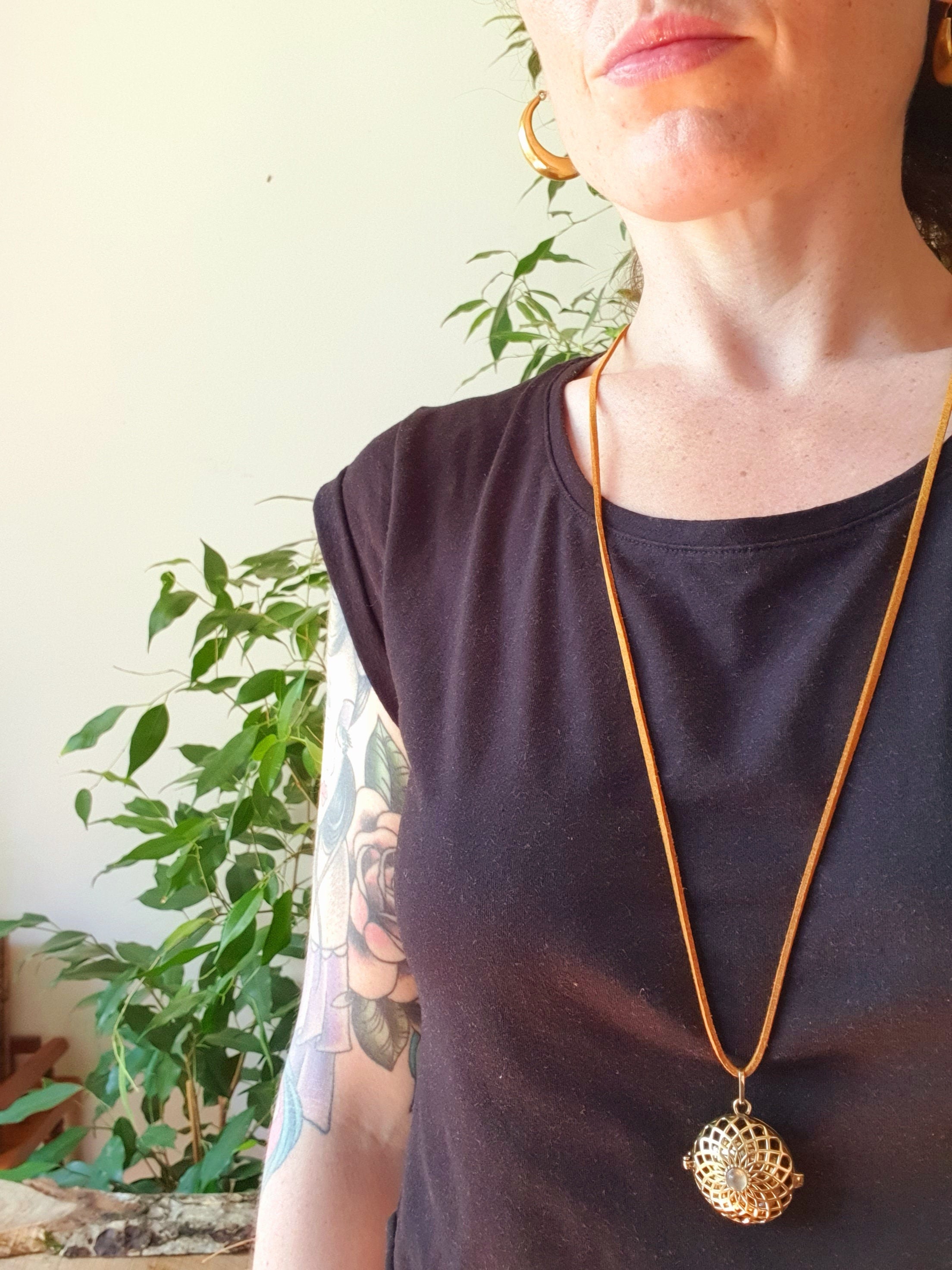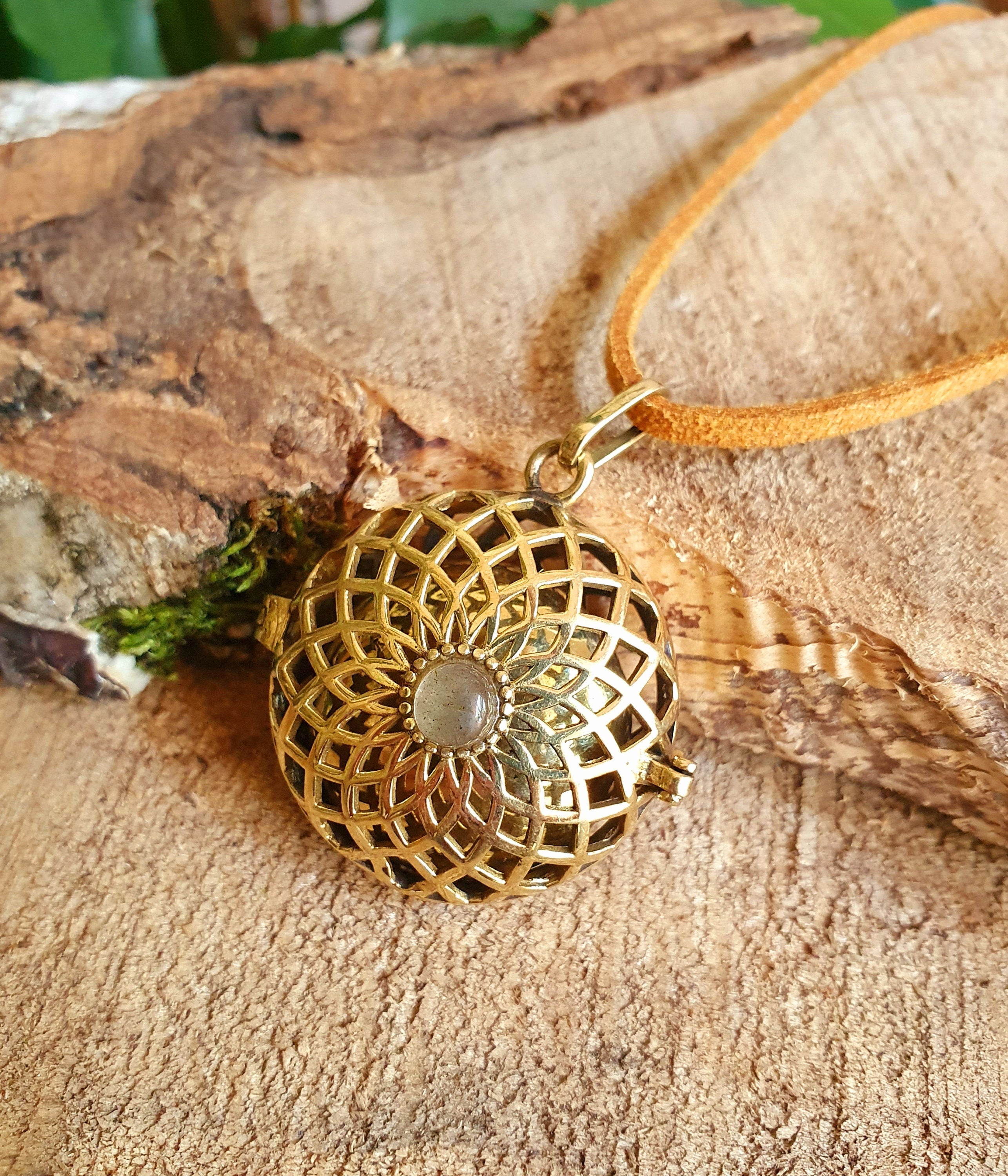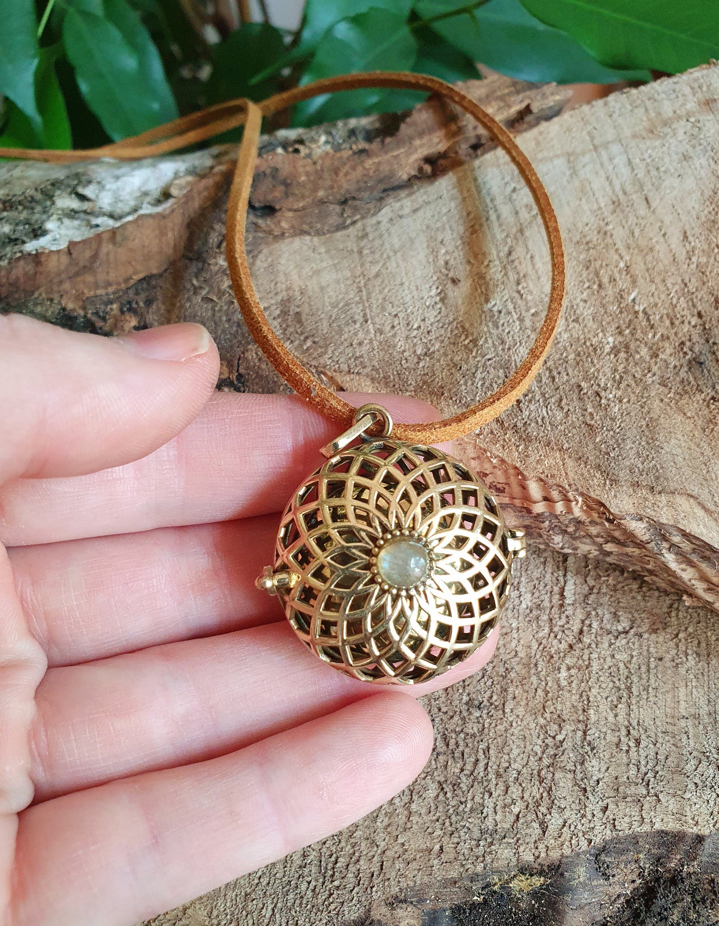 Inside this beautiful brass pendant is a brass bell which makes a soft chiming sound as it moves.