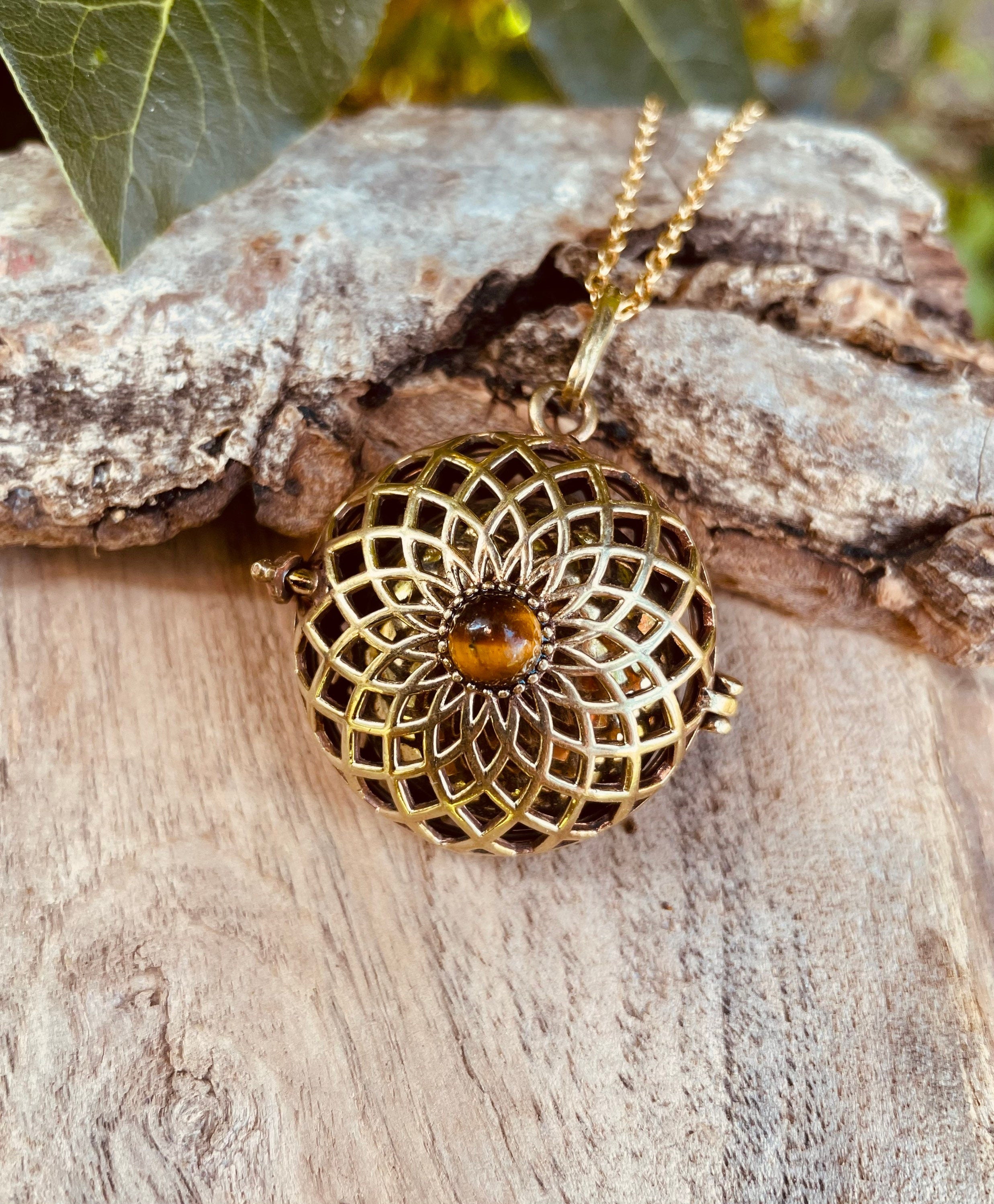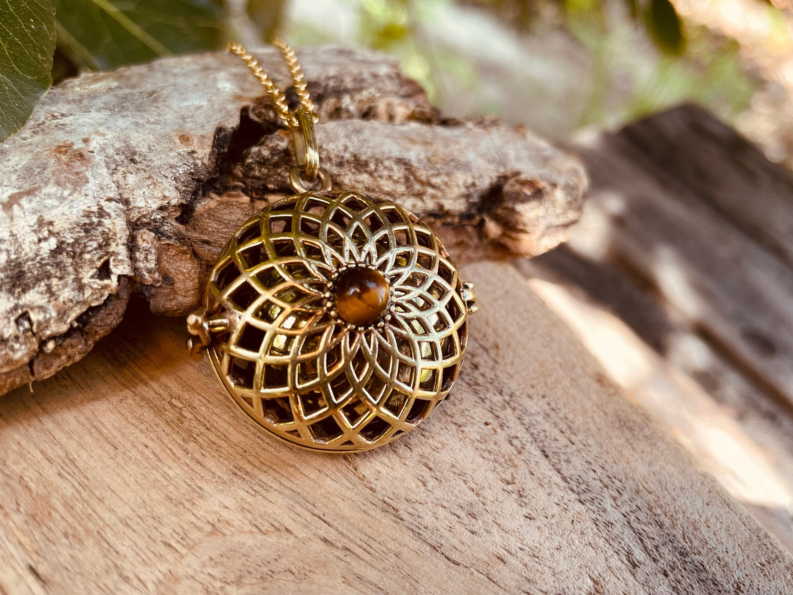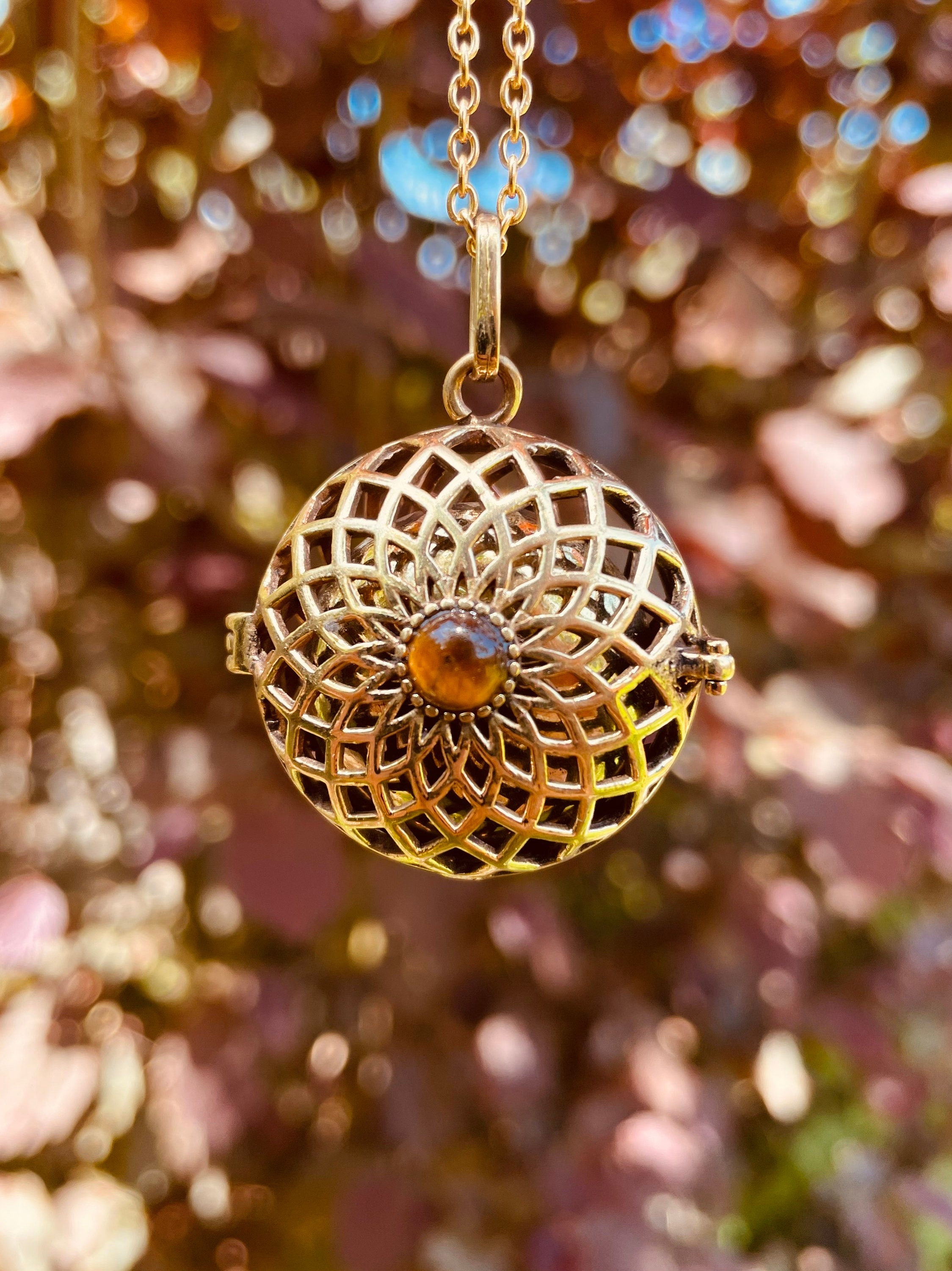 Inside this beautiful brass pendant is a brass bell which makes a soft chiming sound as it moves.
