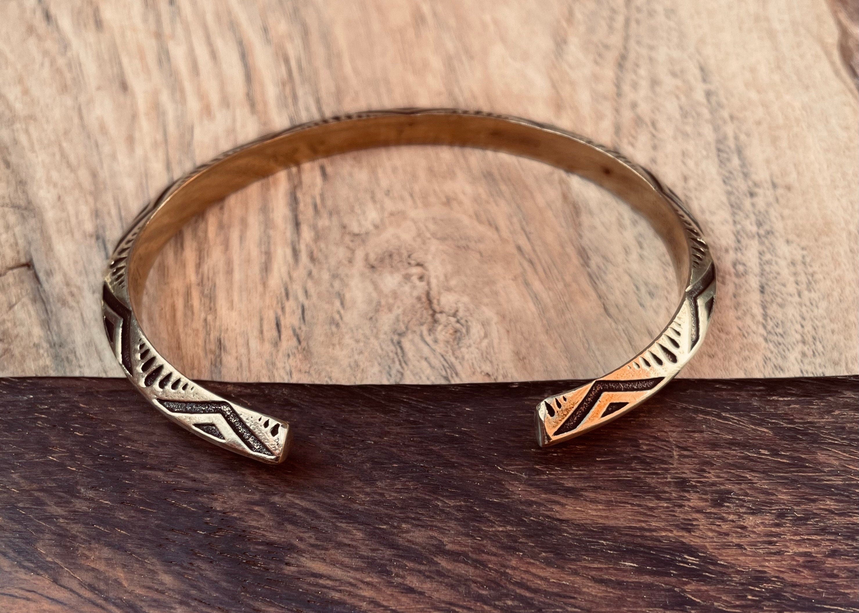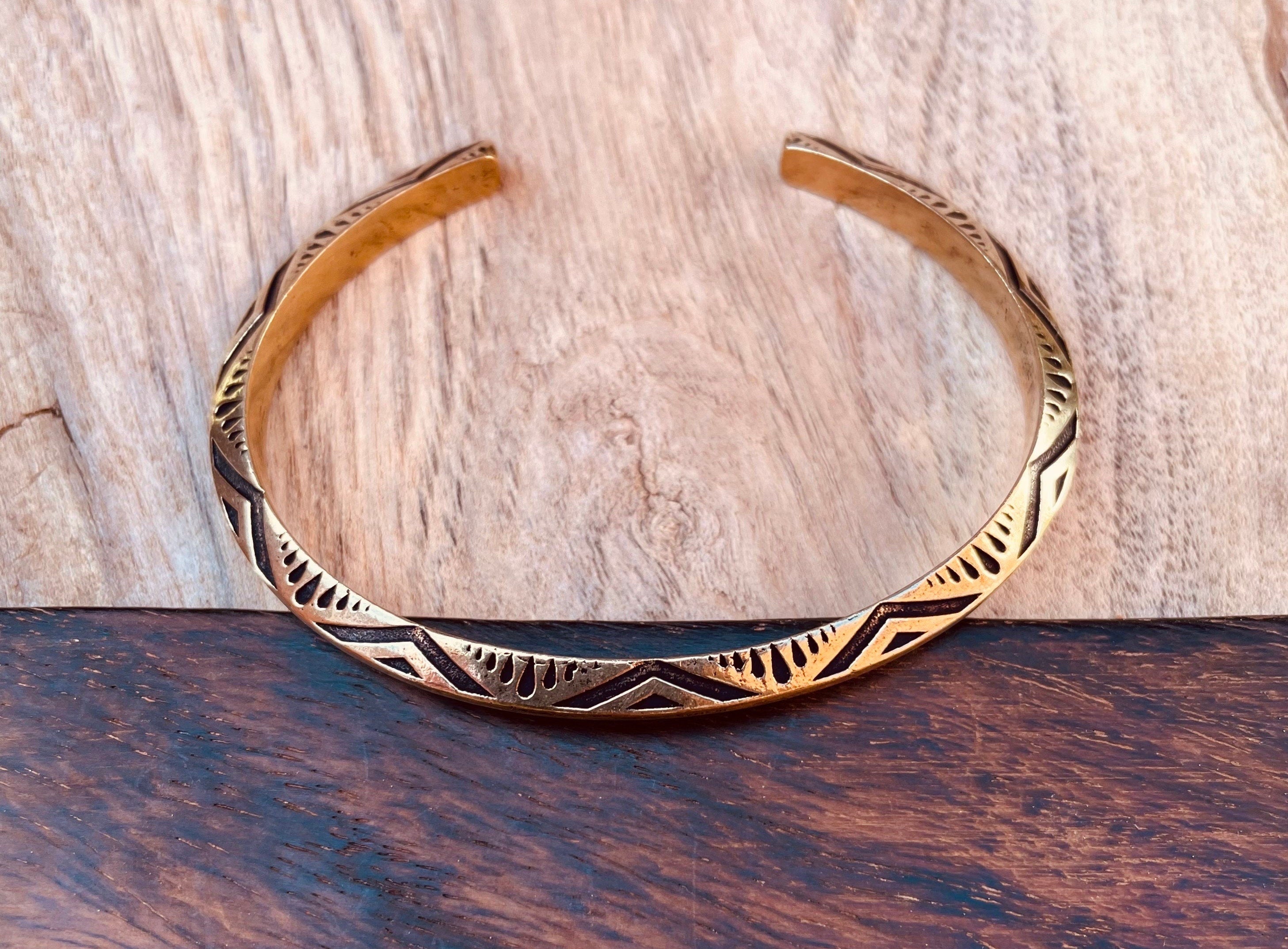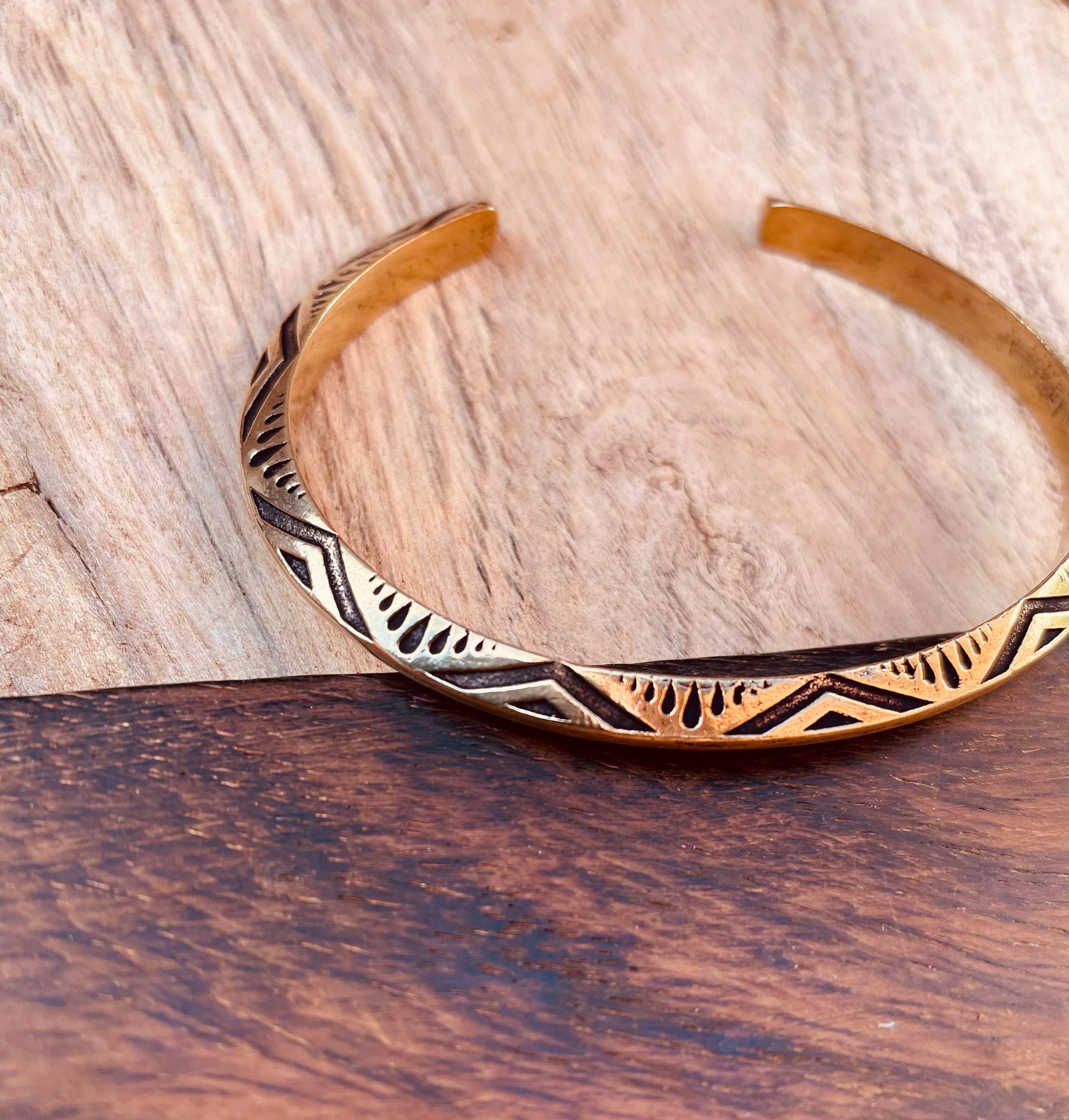 Aztec inspired brass bracelet. The design has a solid, high quality feel.