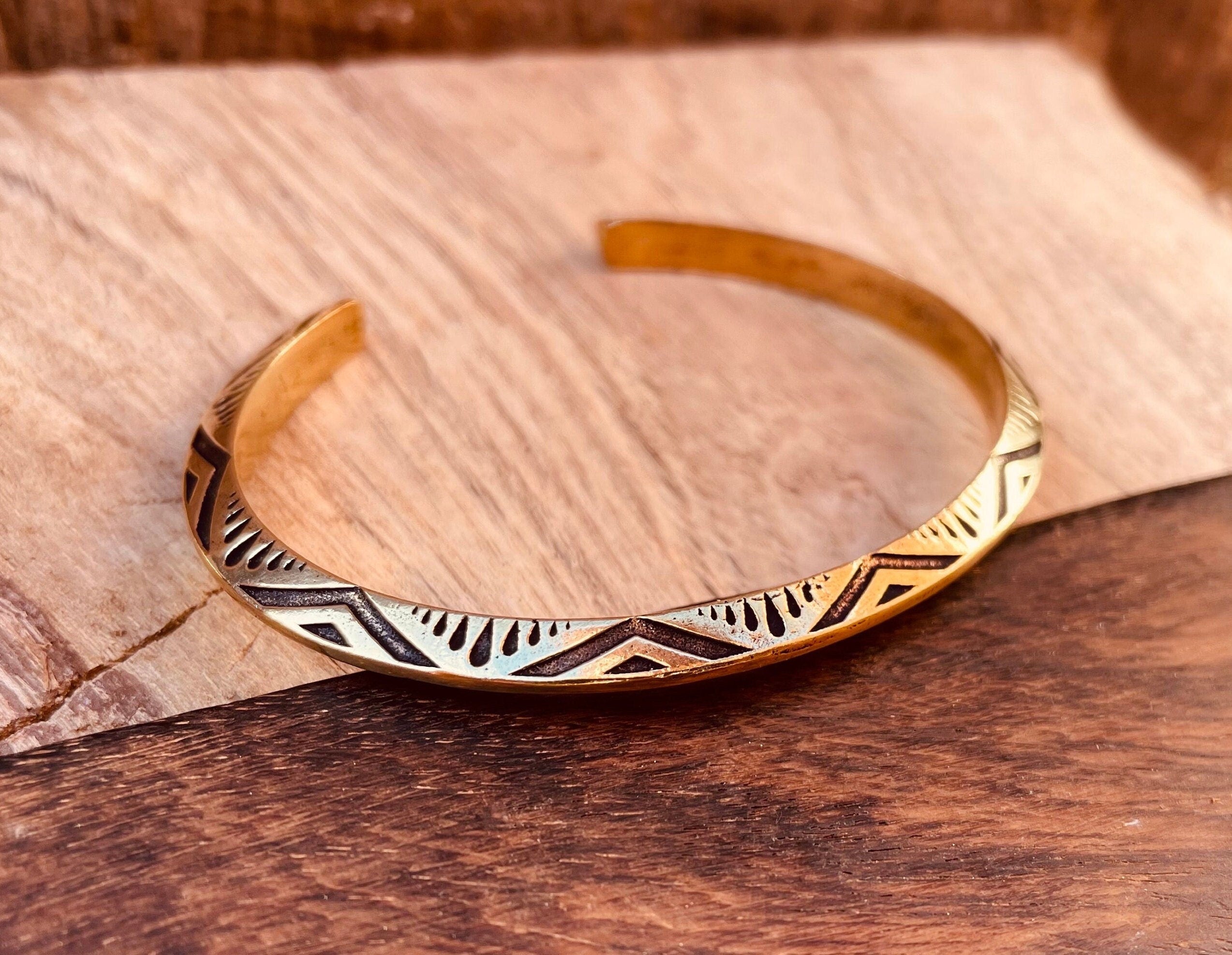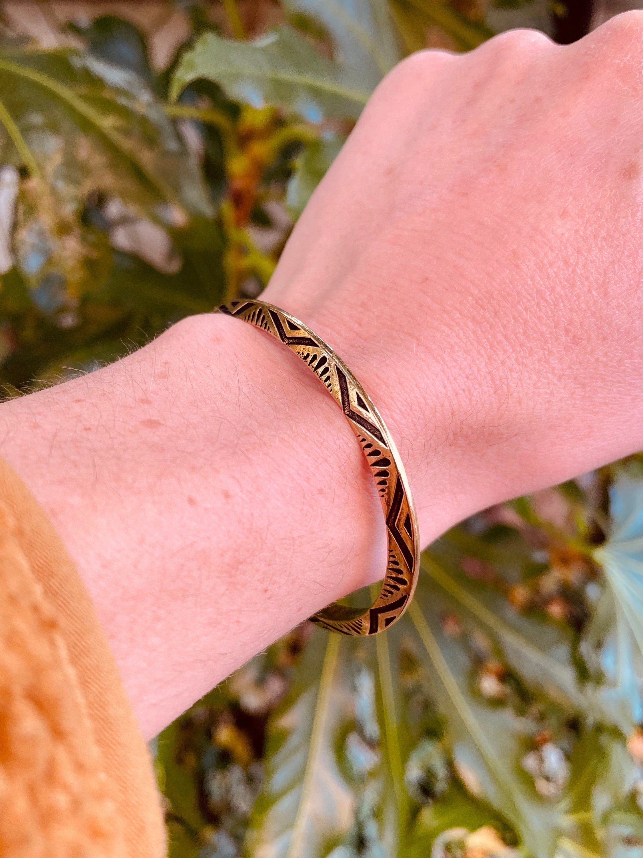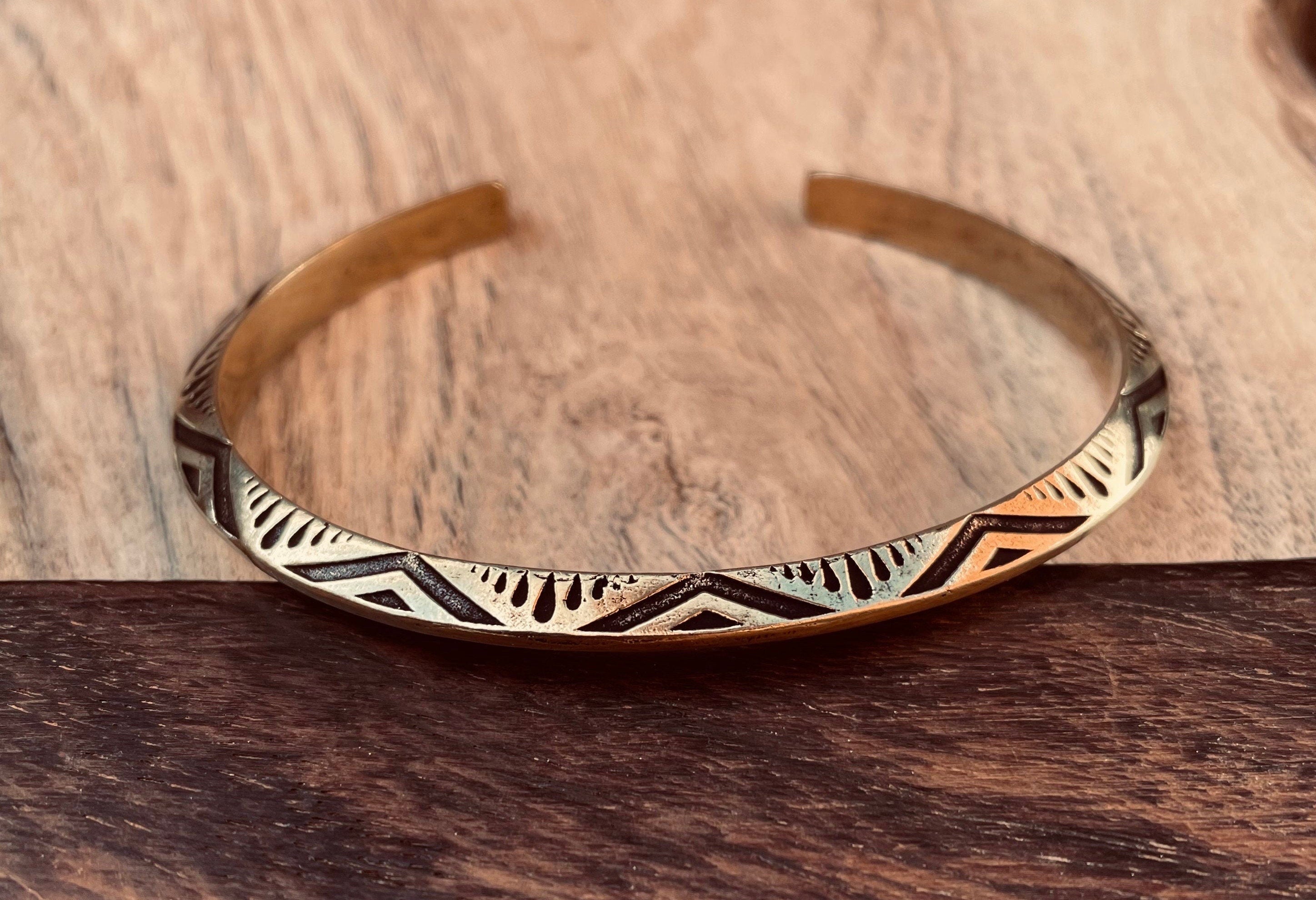 Aztec inspired brass bracelet. The design has a solid, high quality feel.