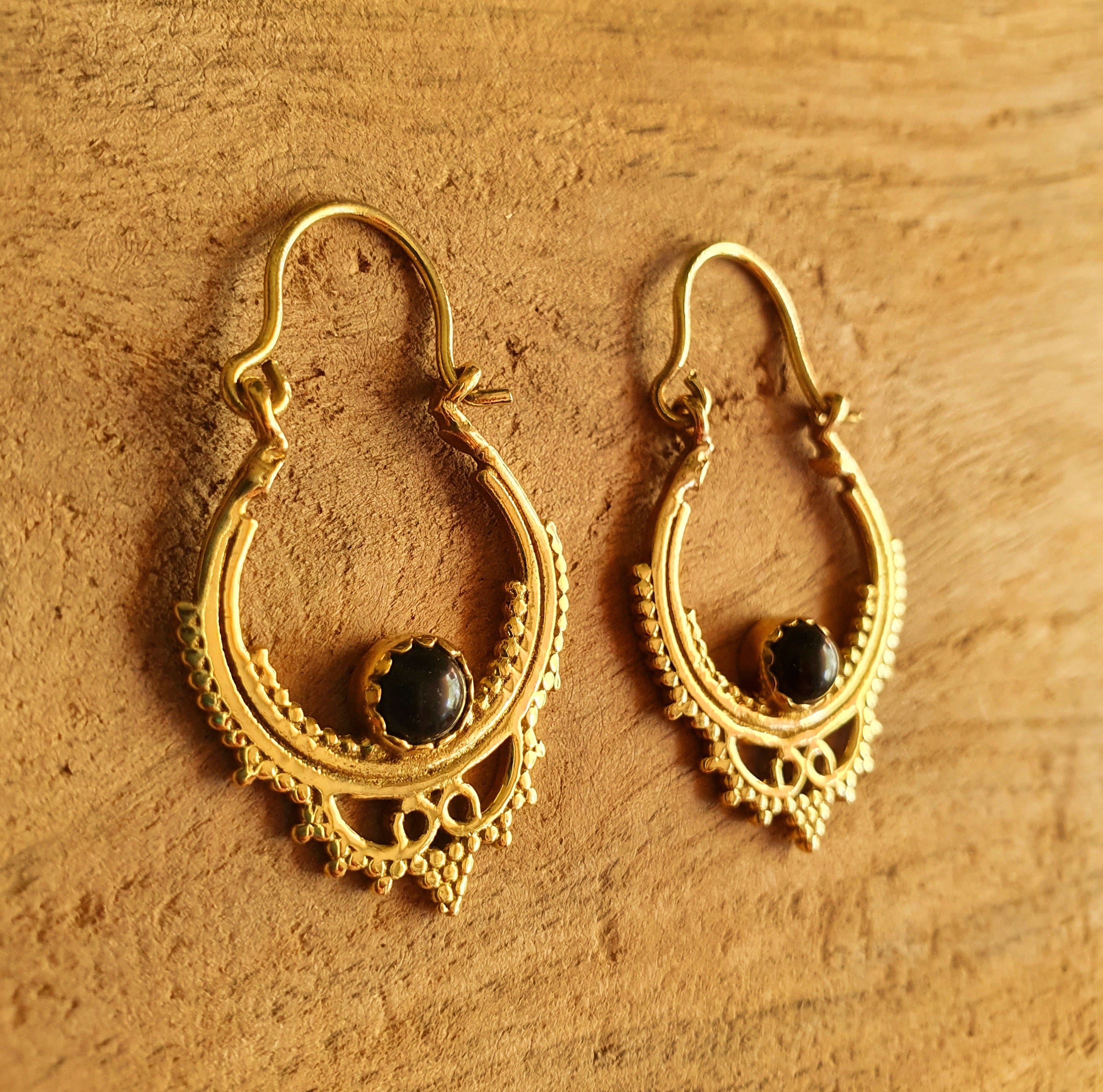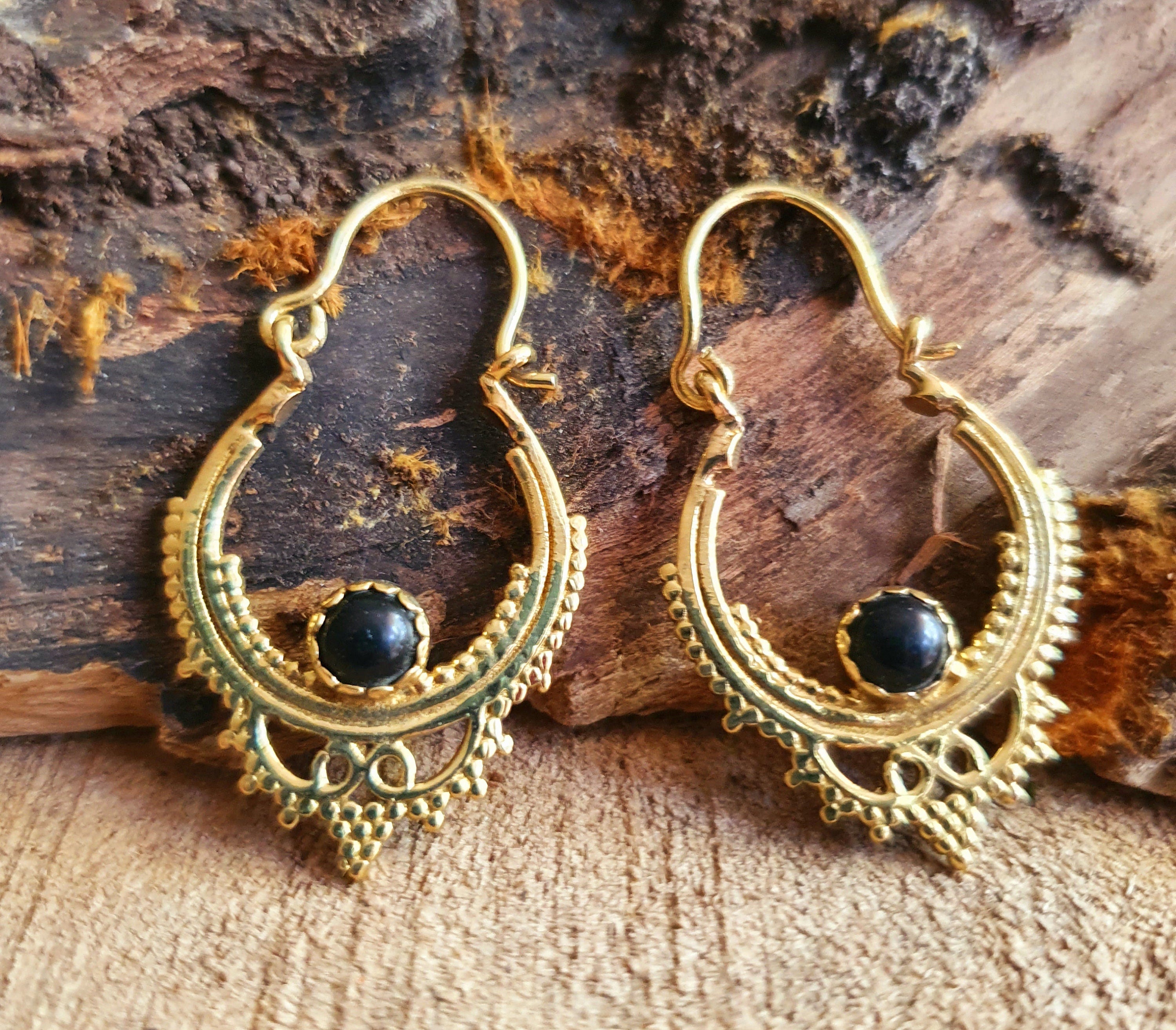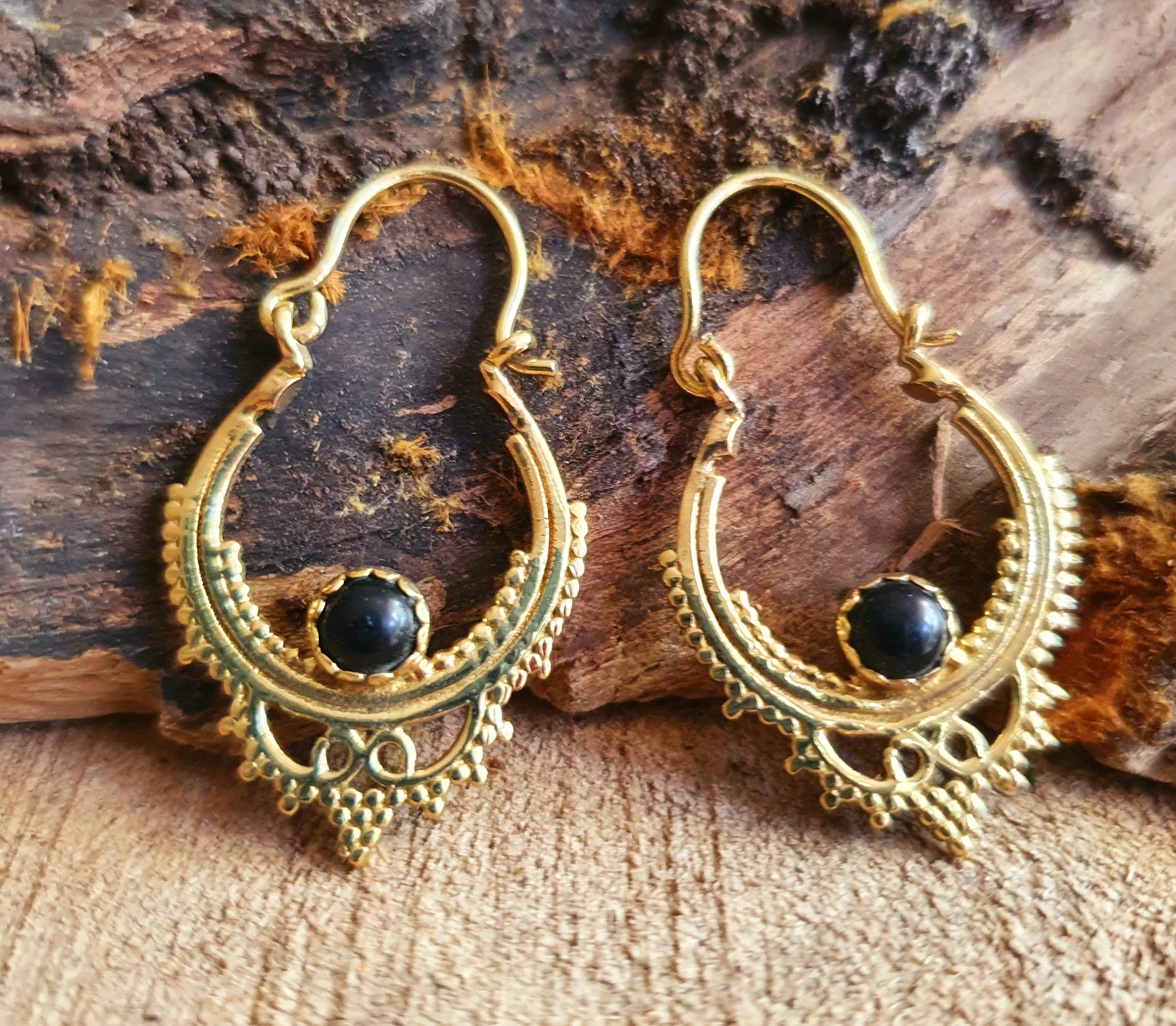 Black Onyx Small Boho Hoops Brass Earrings