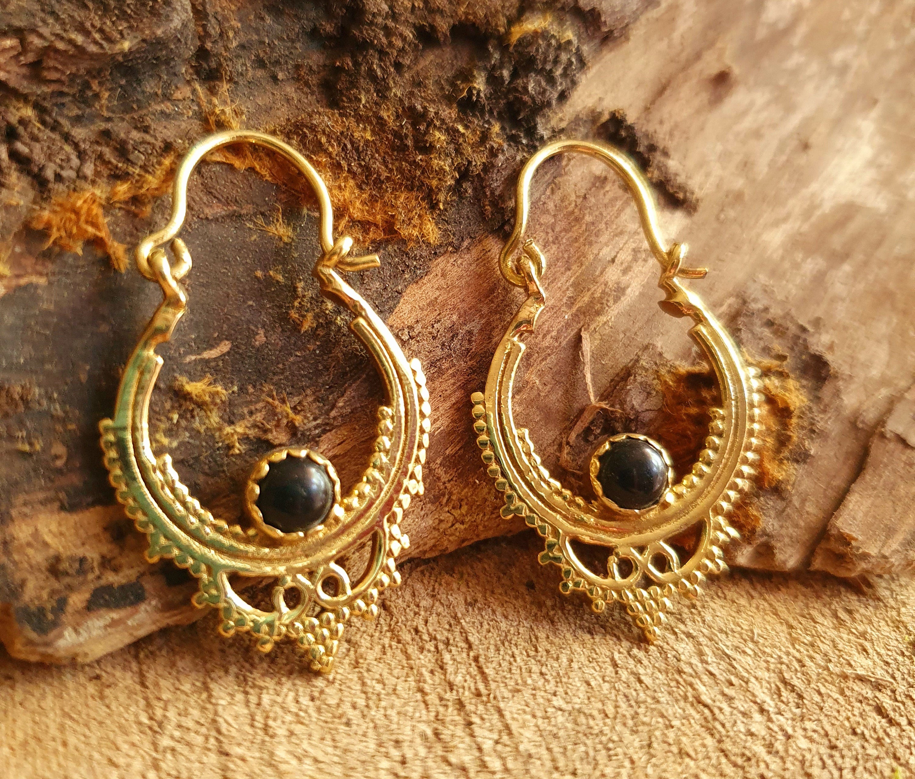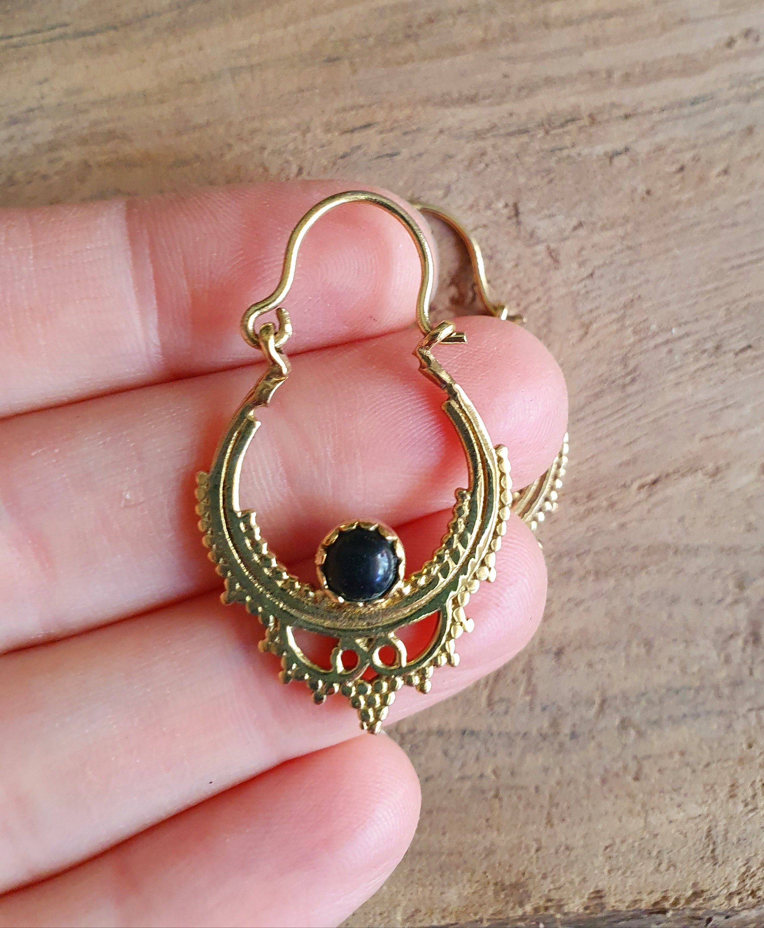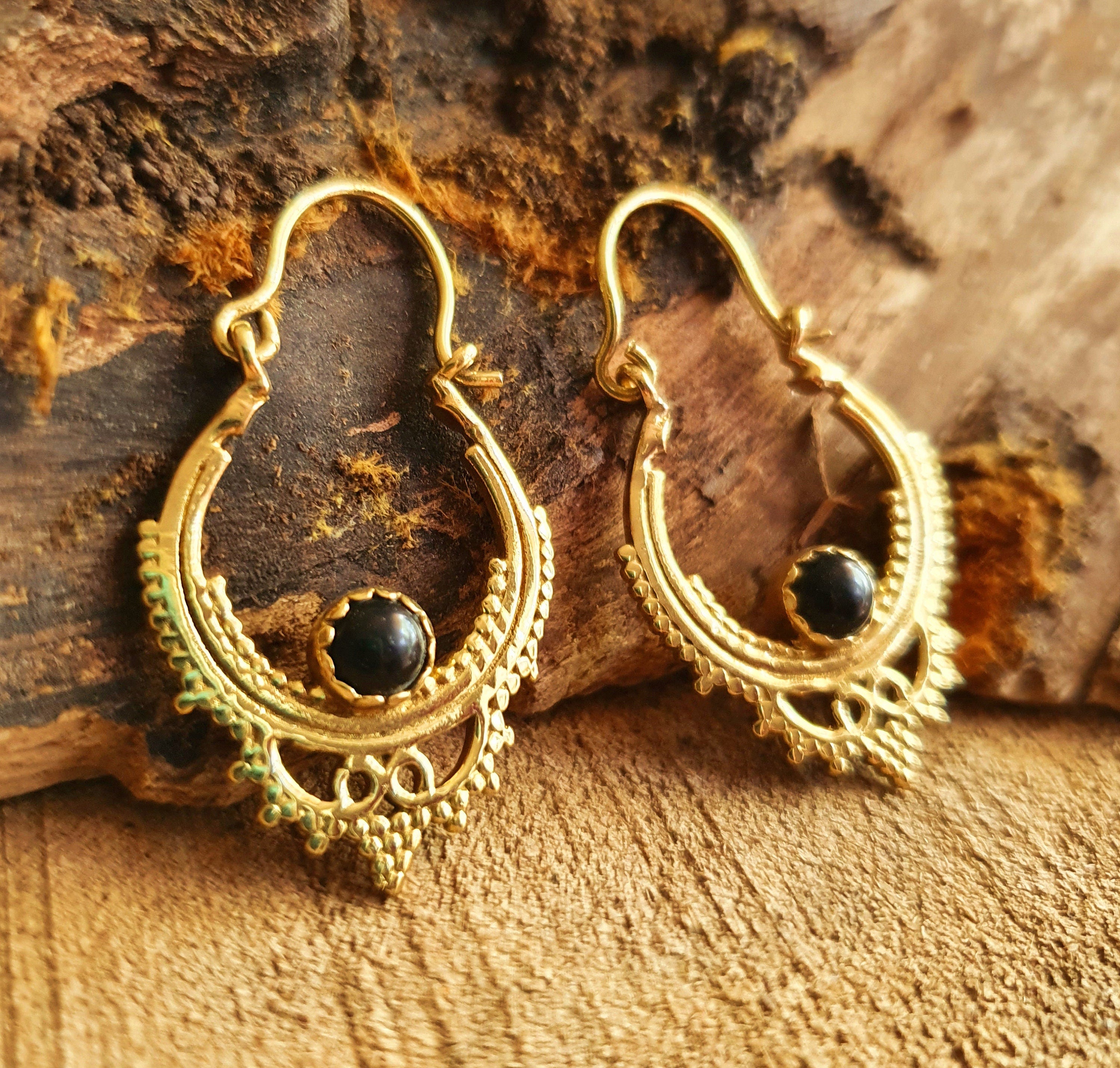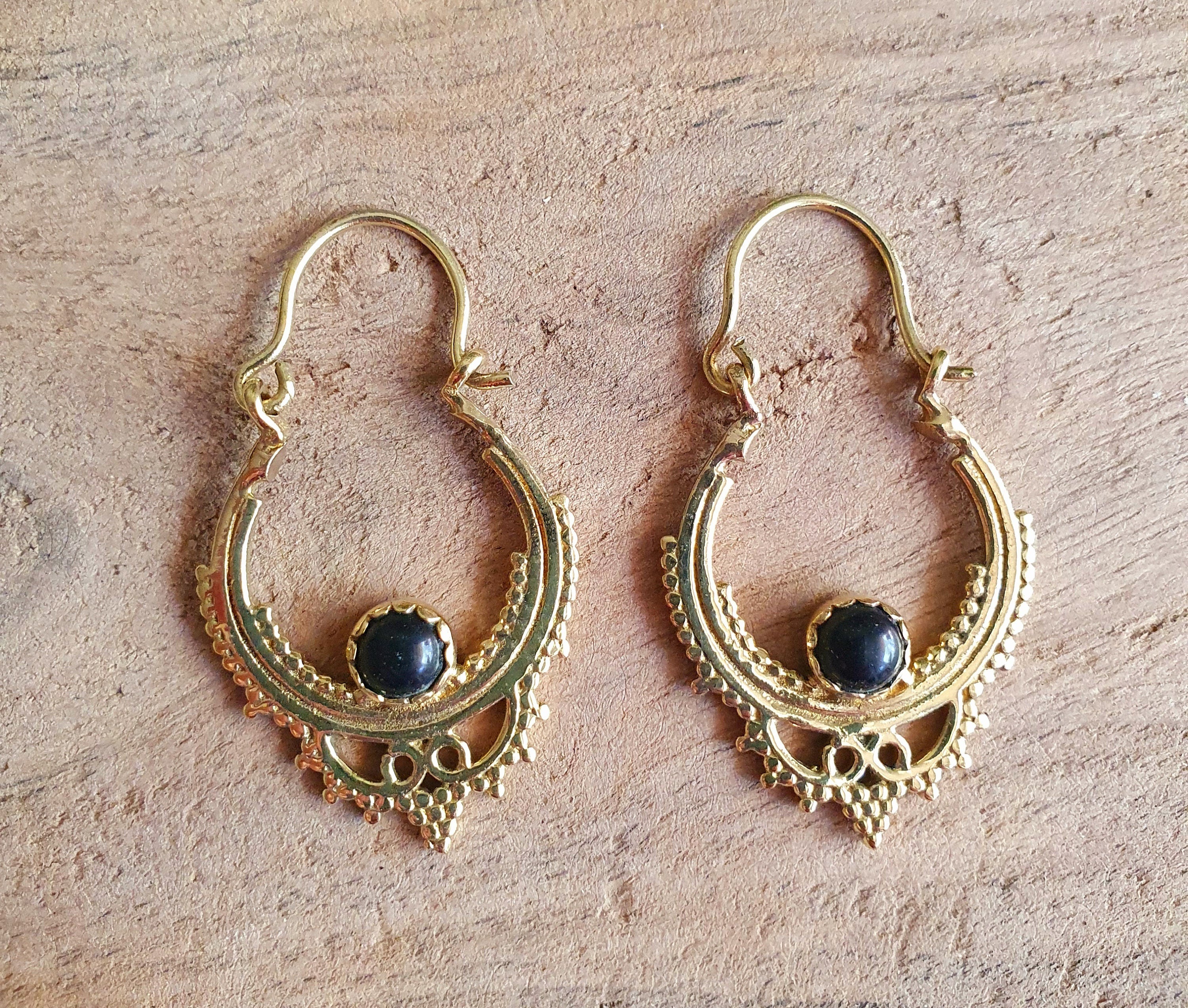 Black Onyx Small Boho Hoops Brass Earrings