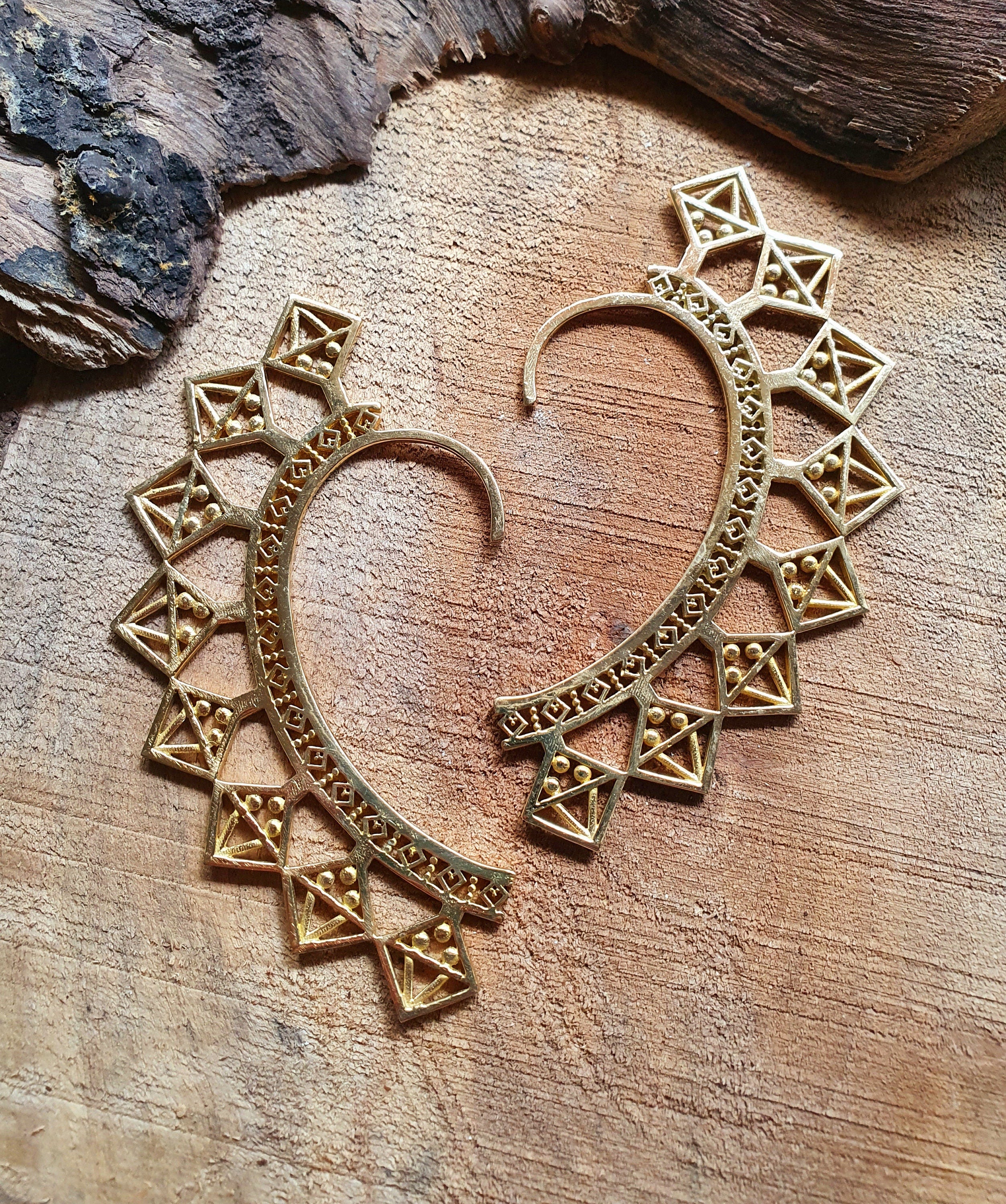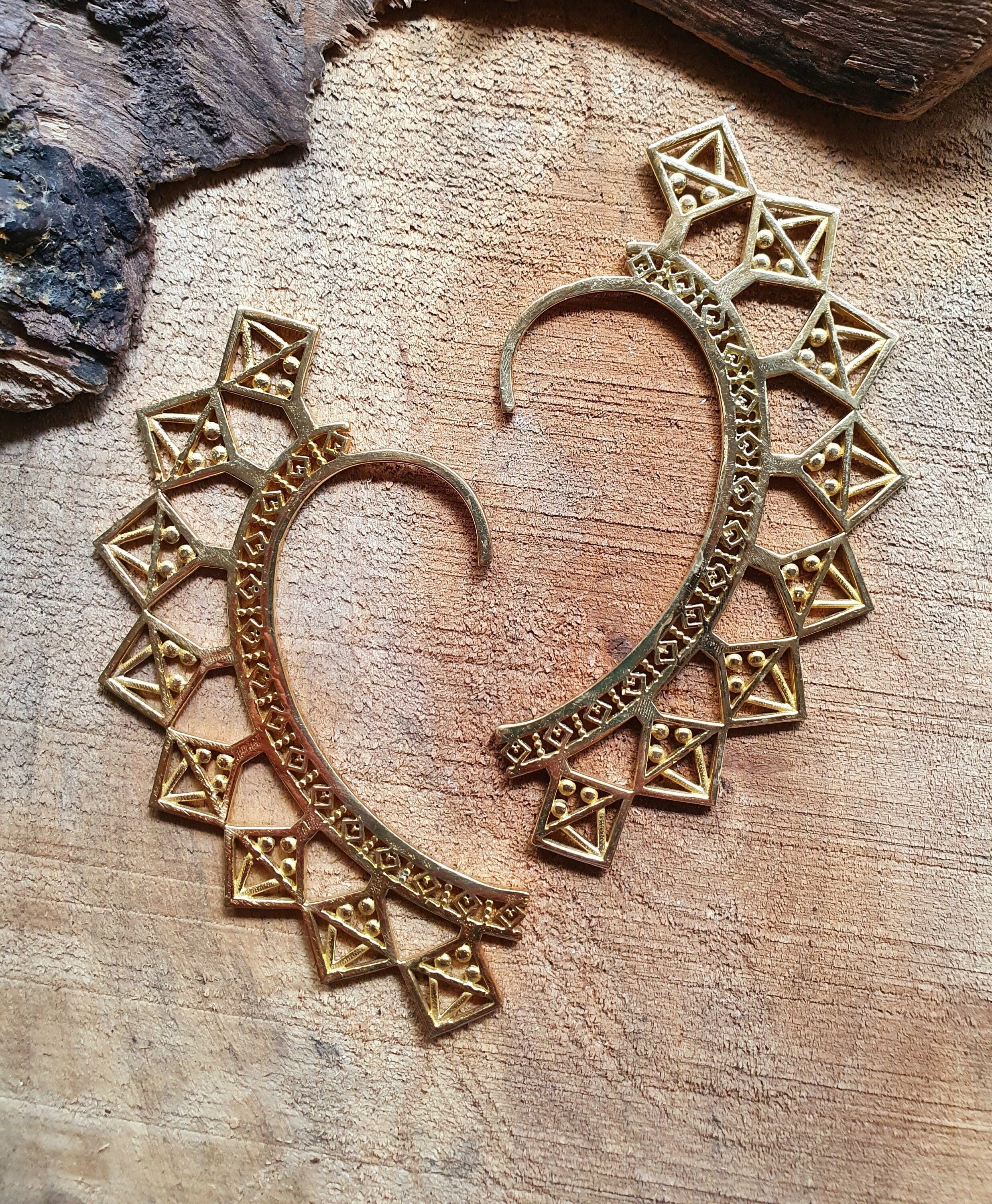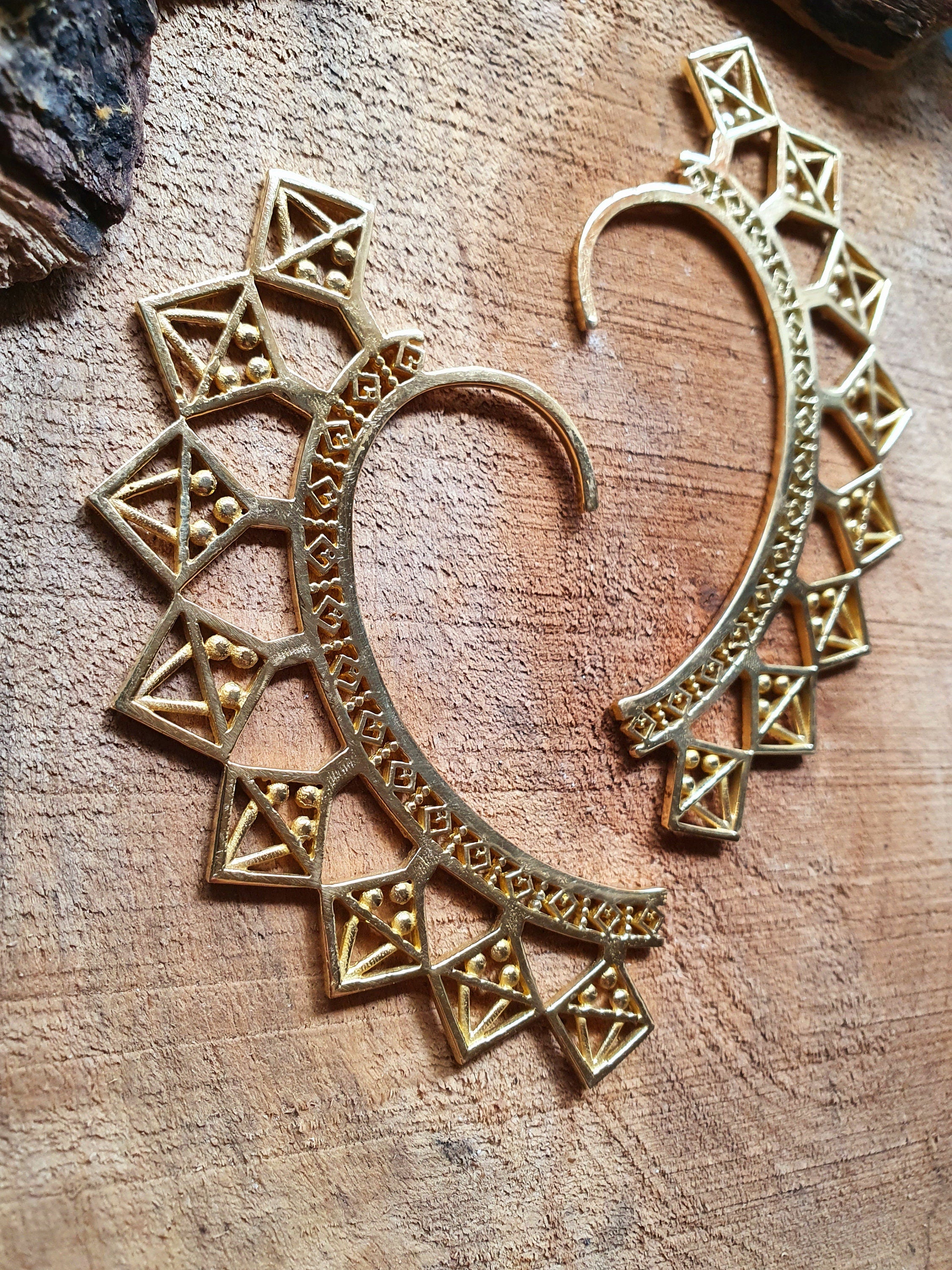 Ear cuff in solid brass with decorative aztec triangles design.