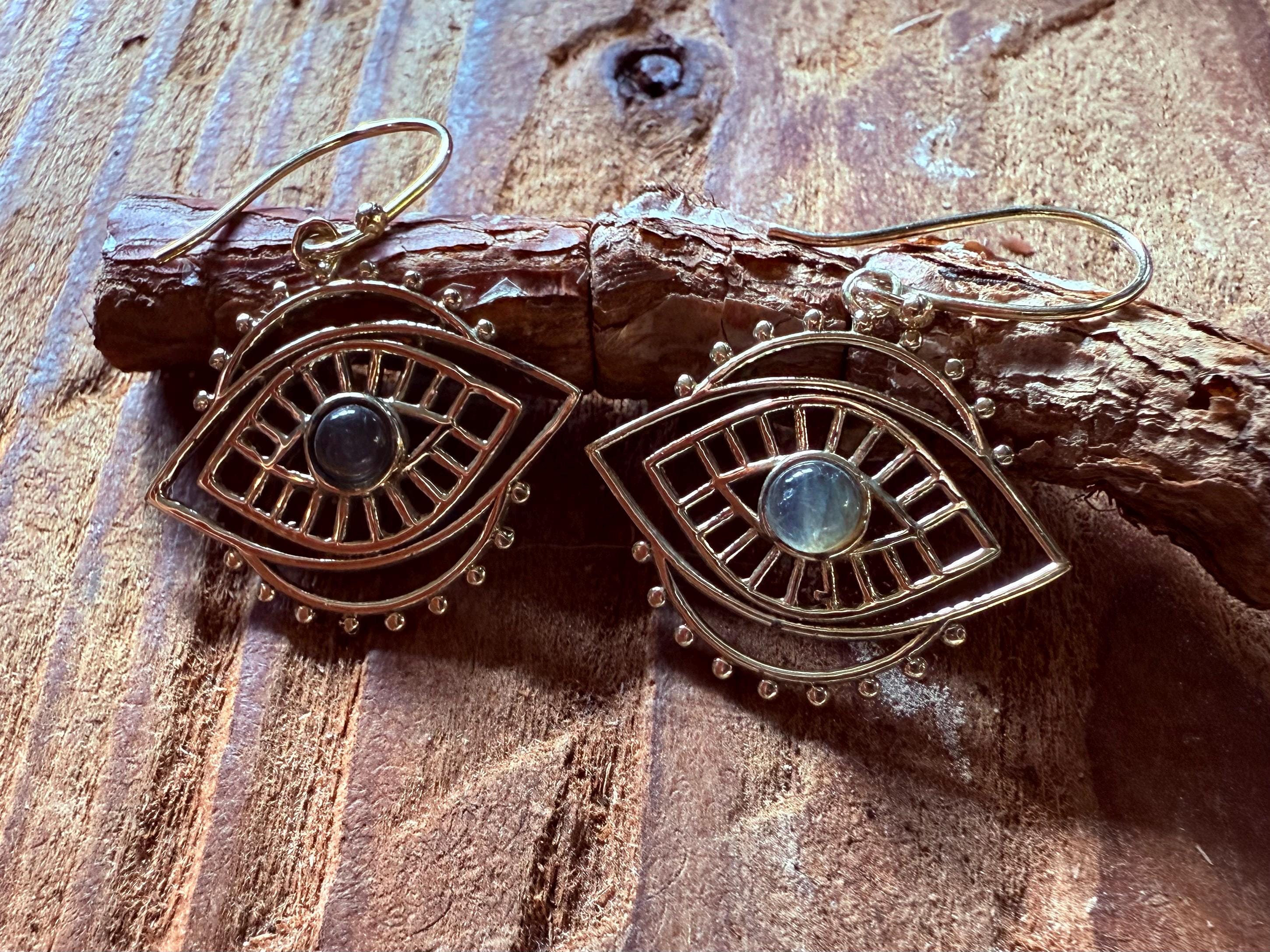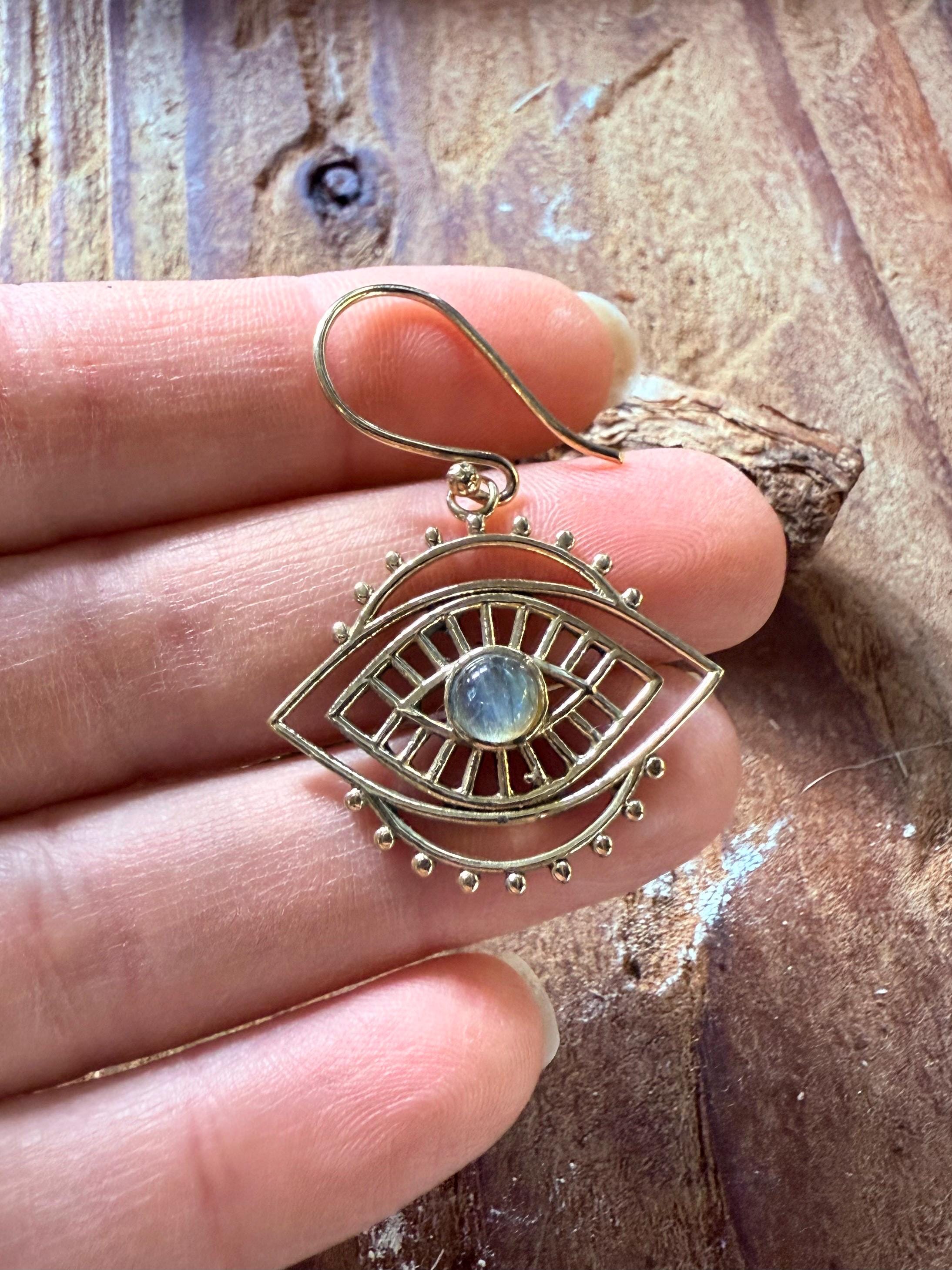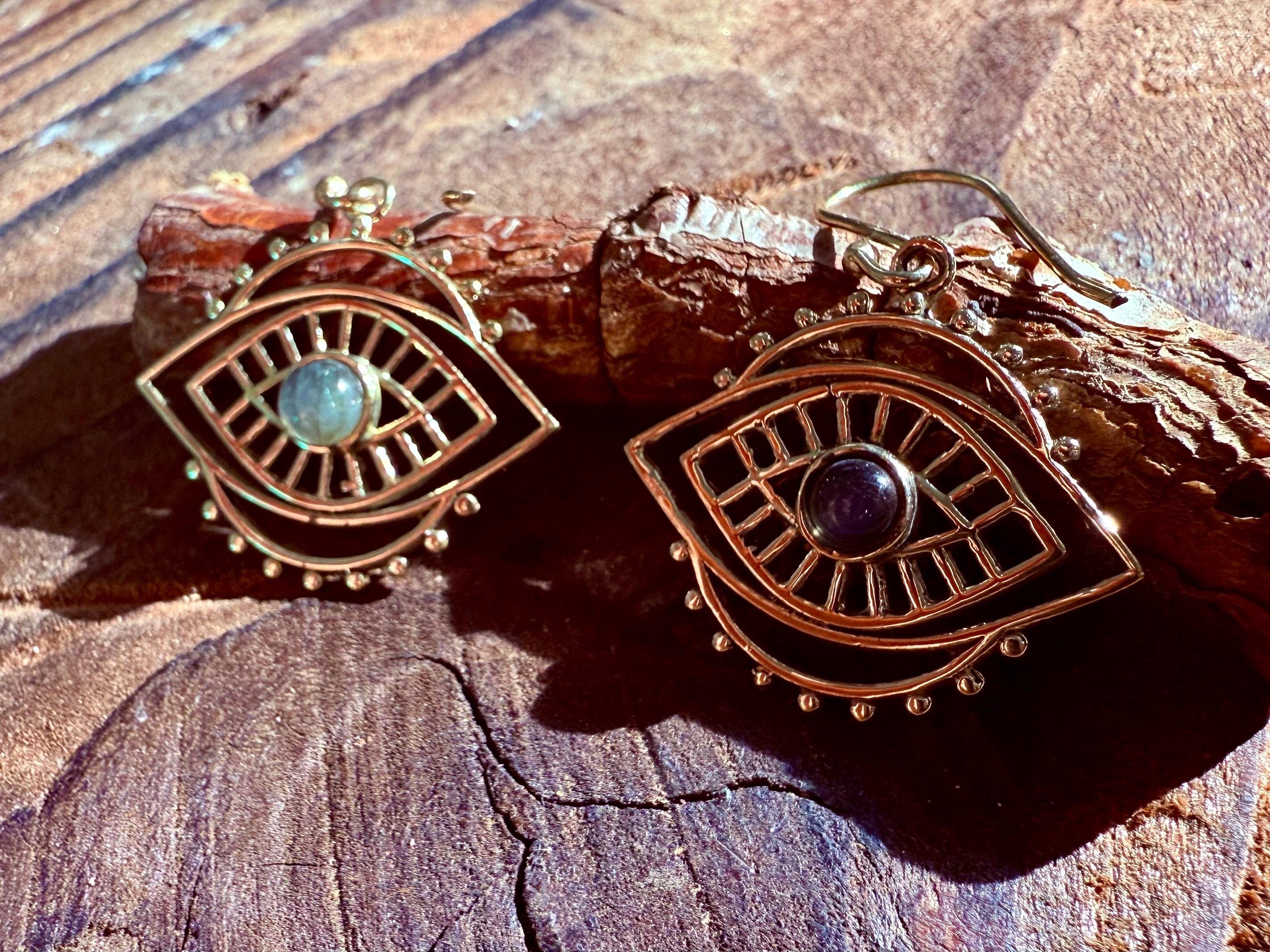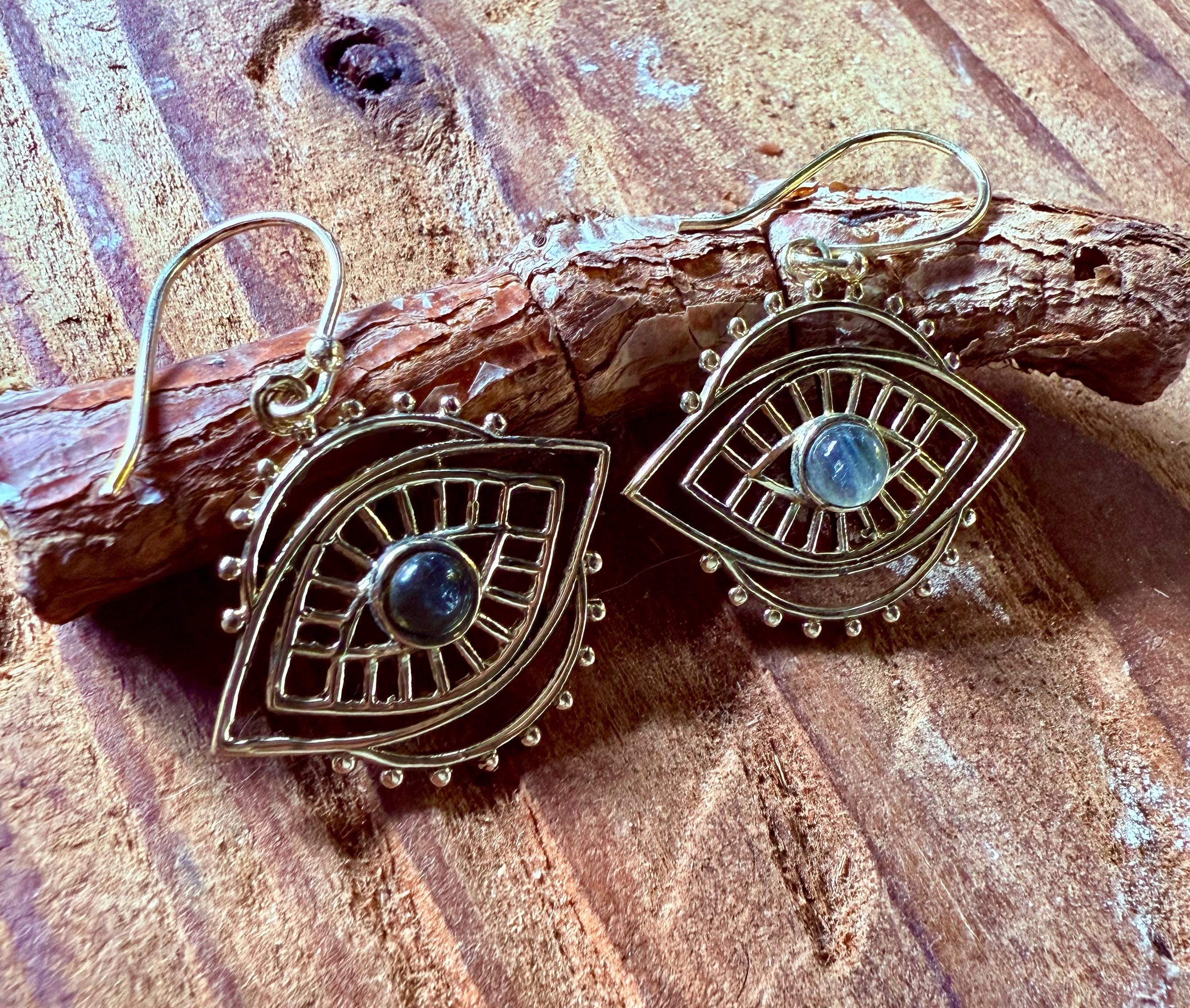 Brass Evil Eye Earrings with Labradorite - Spiritual Protection Jewellery
