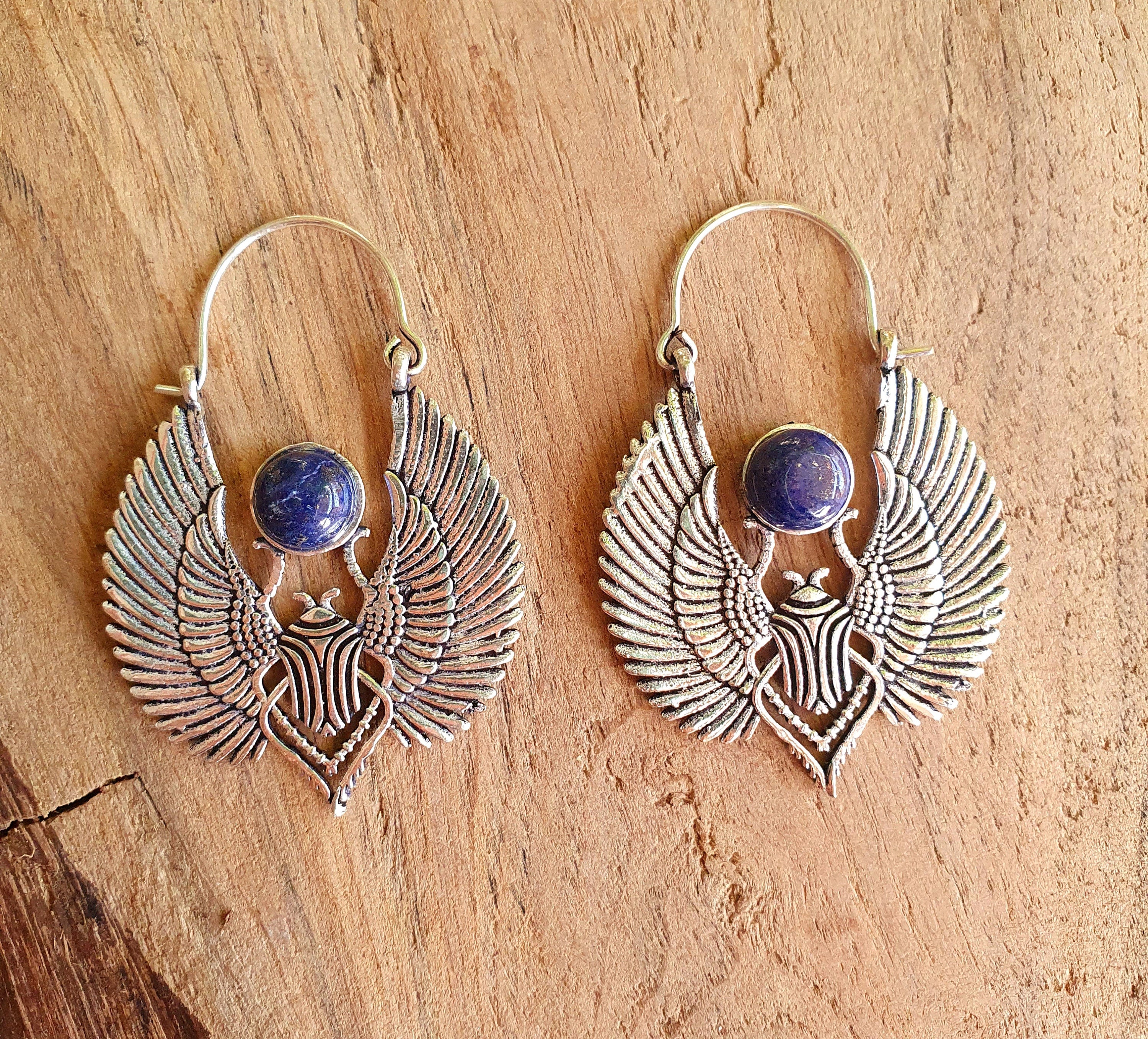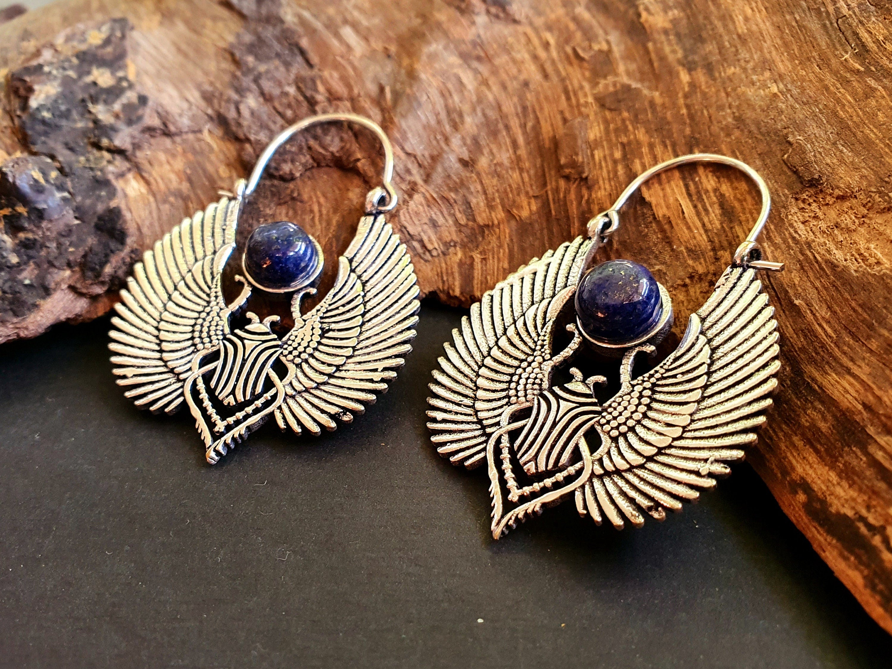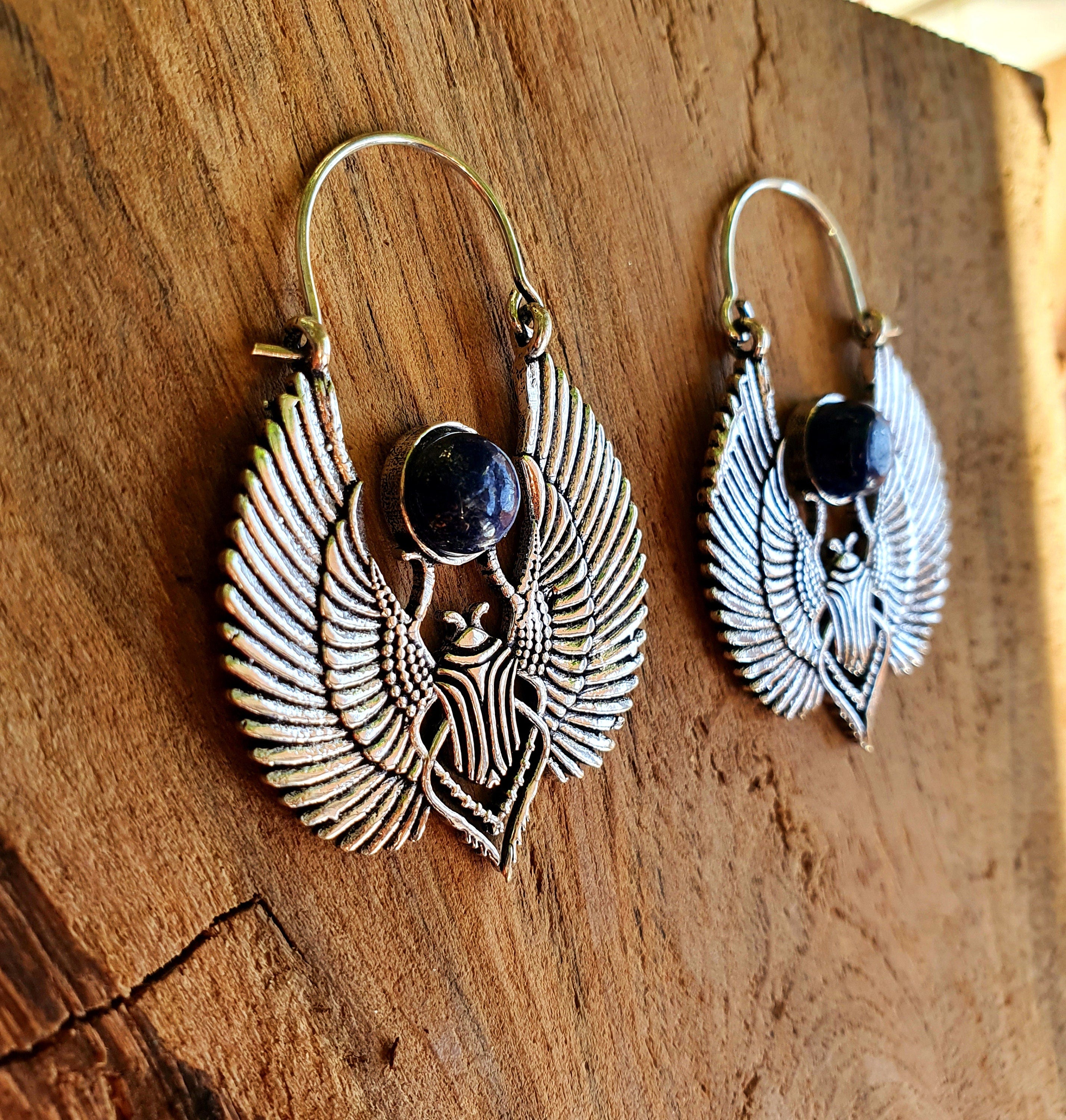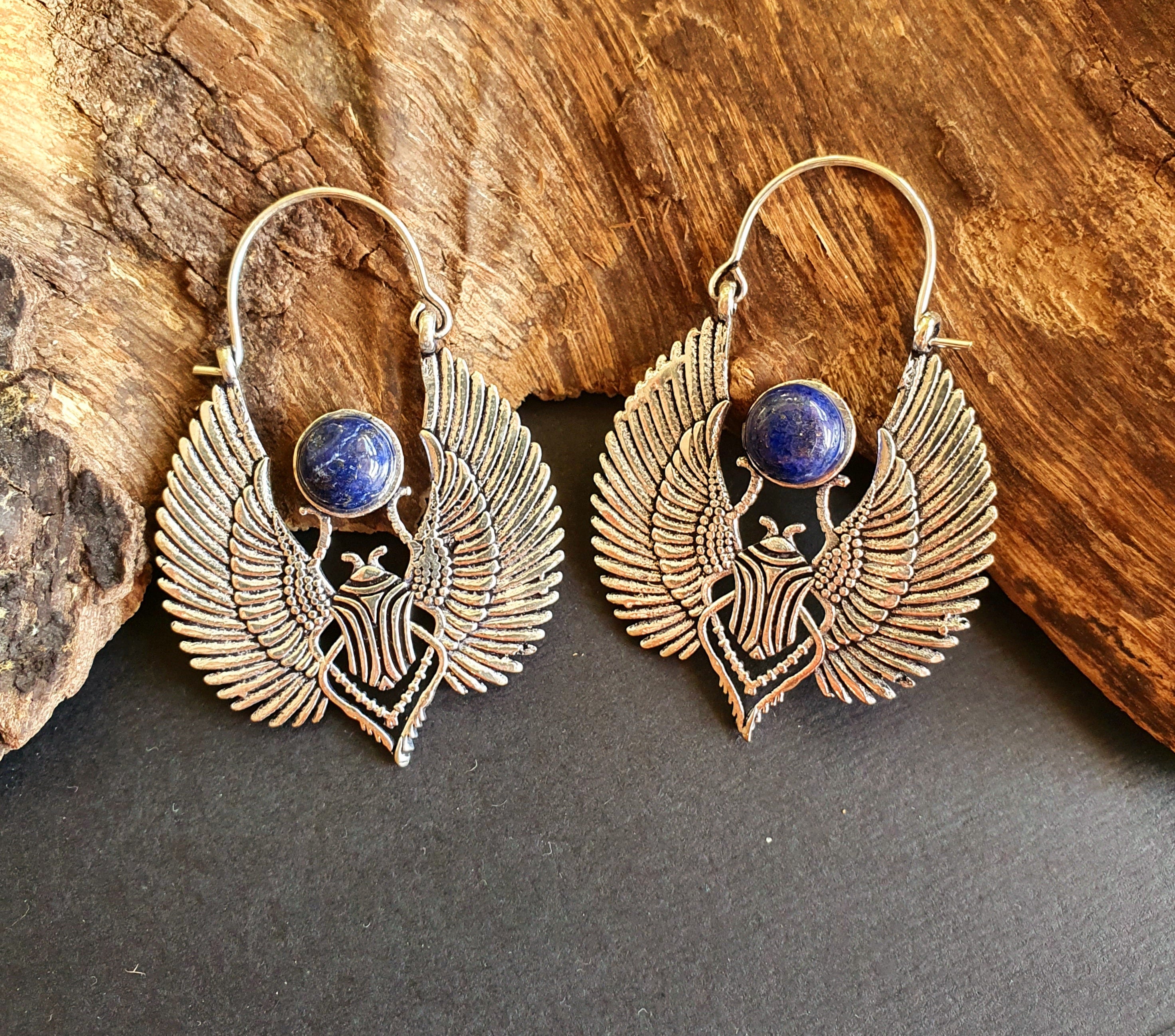 Silver Scarab Earrings Ancient Egypt Lapis Lazuli & Brass