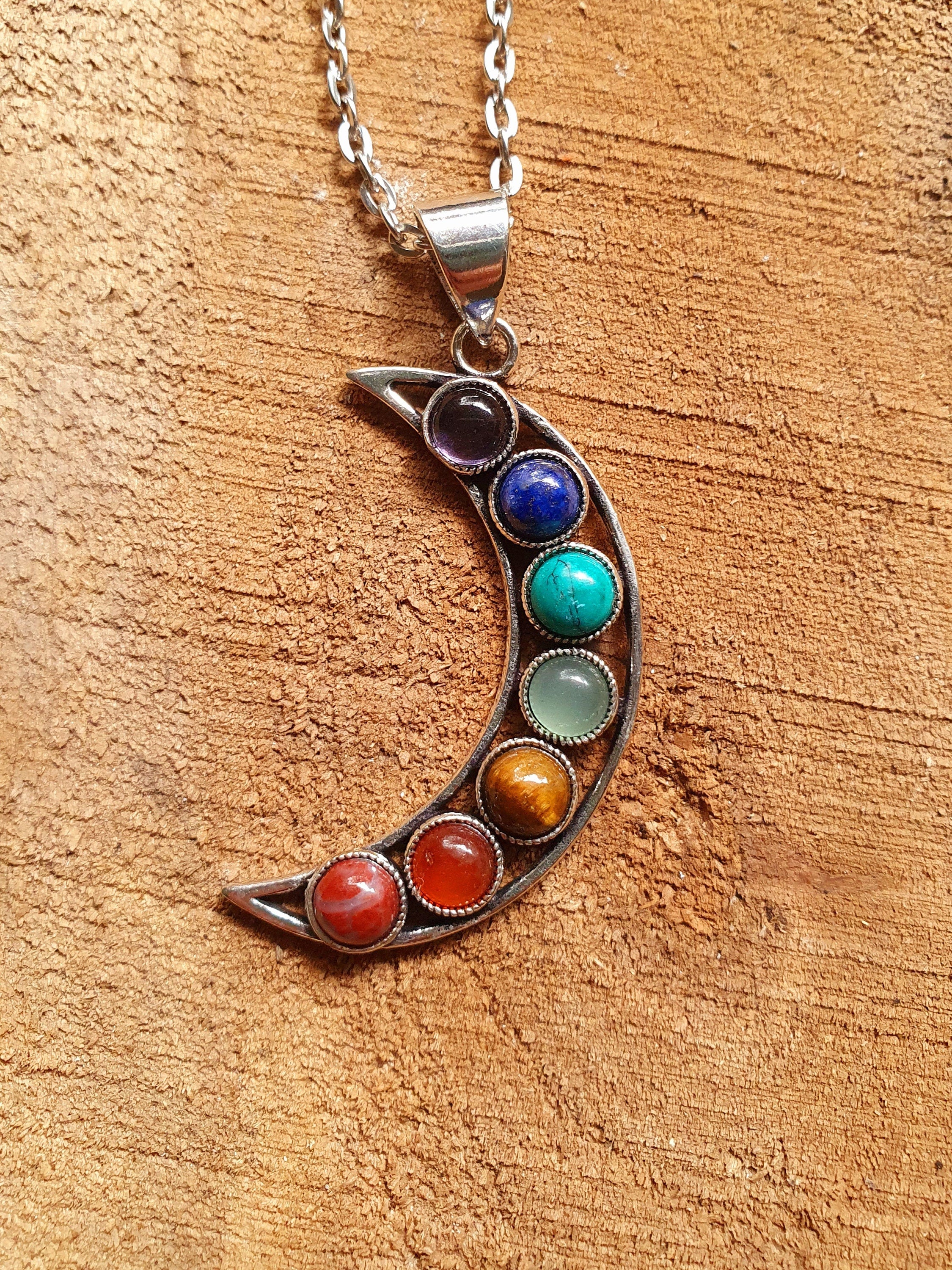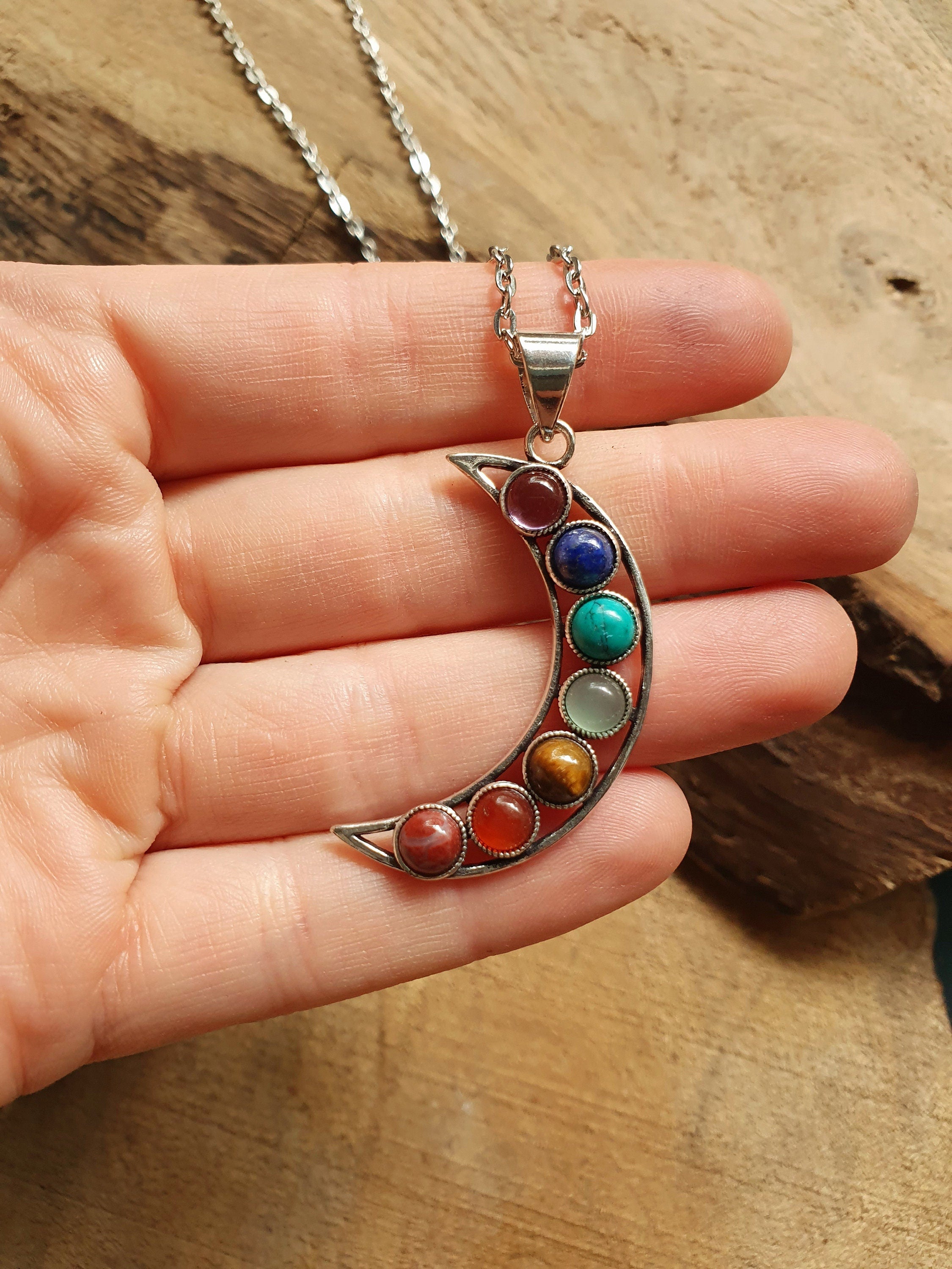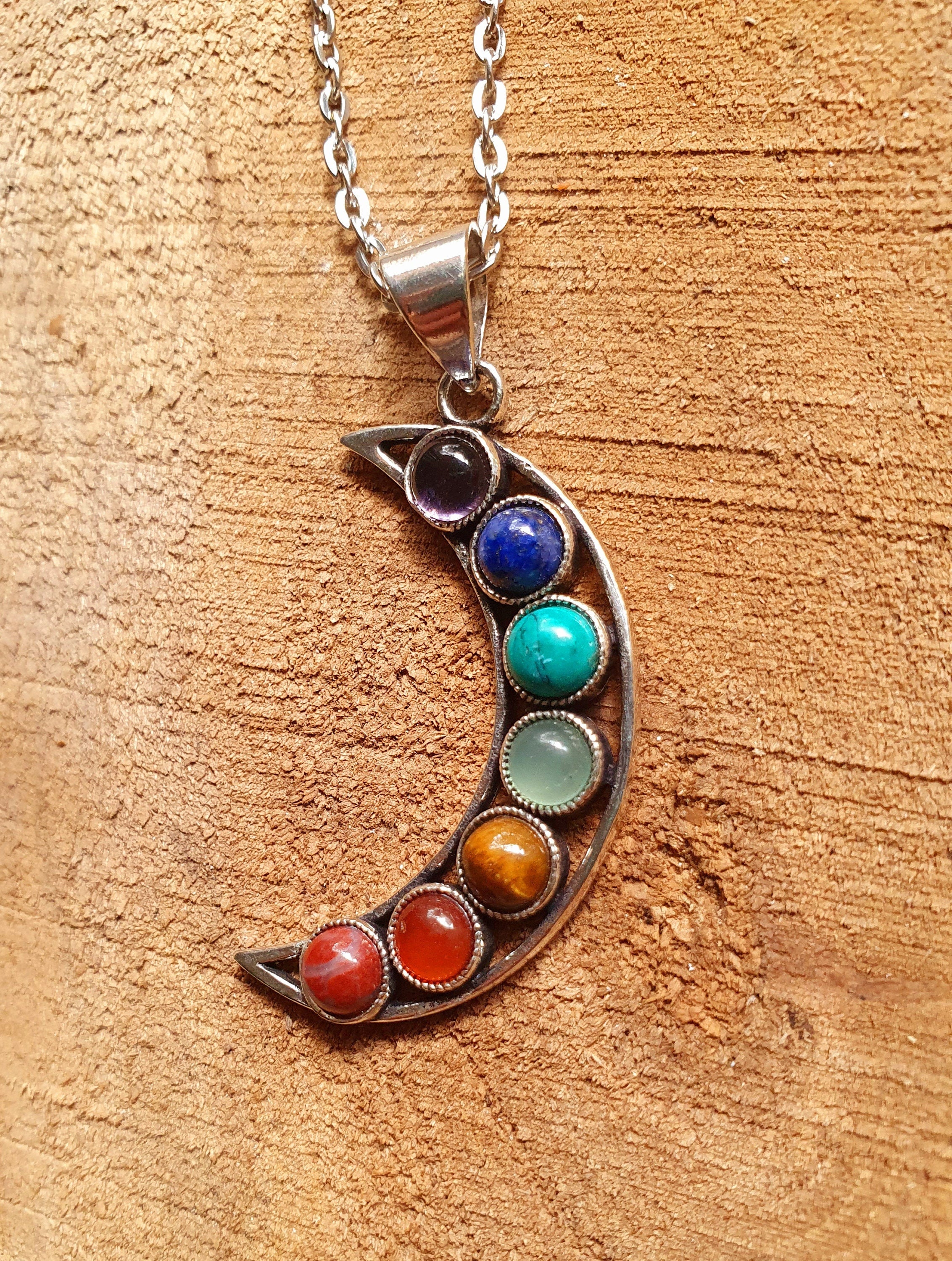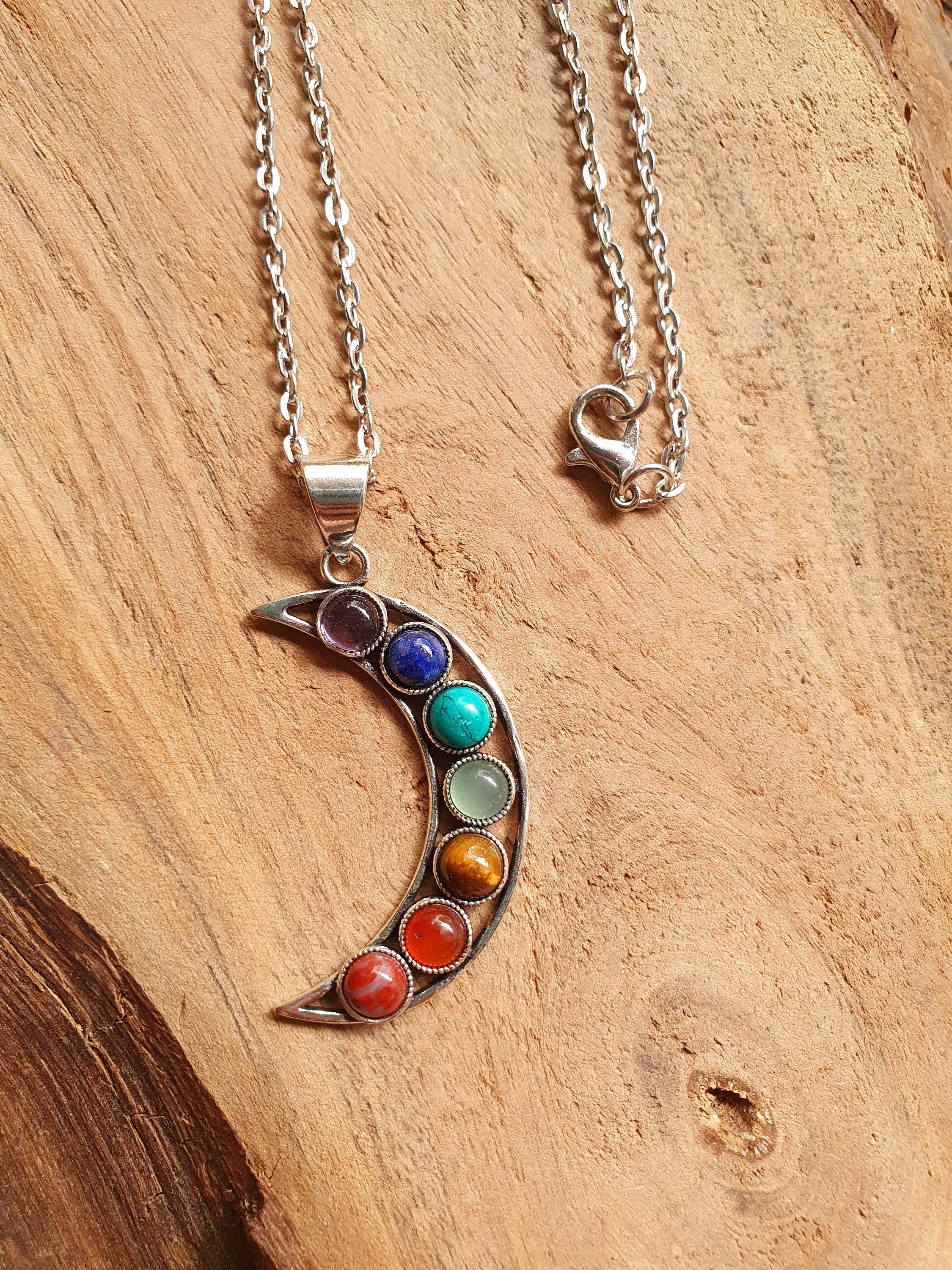Moon & Seven Chakras necklace on hypoallergenic stainless steel chain.