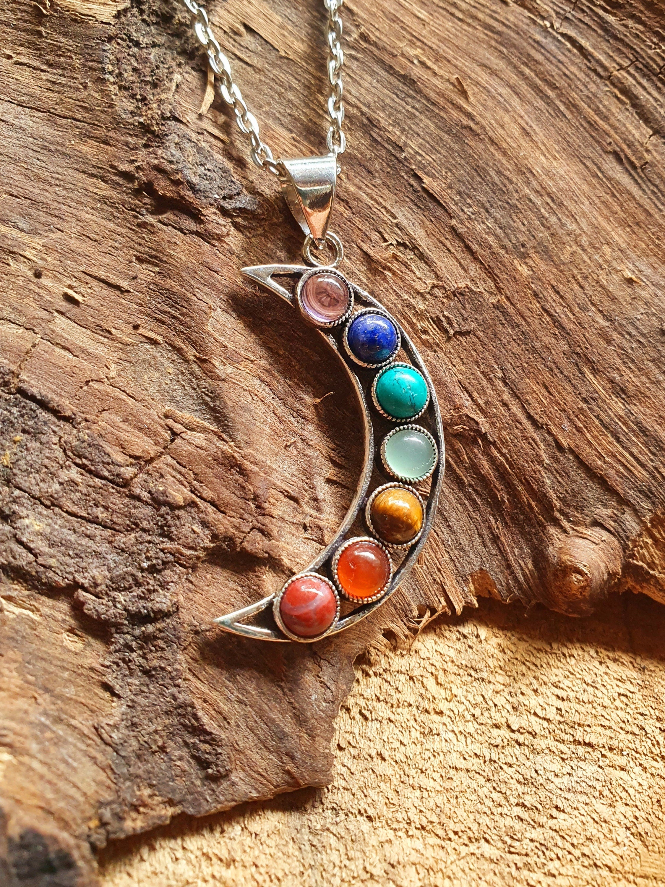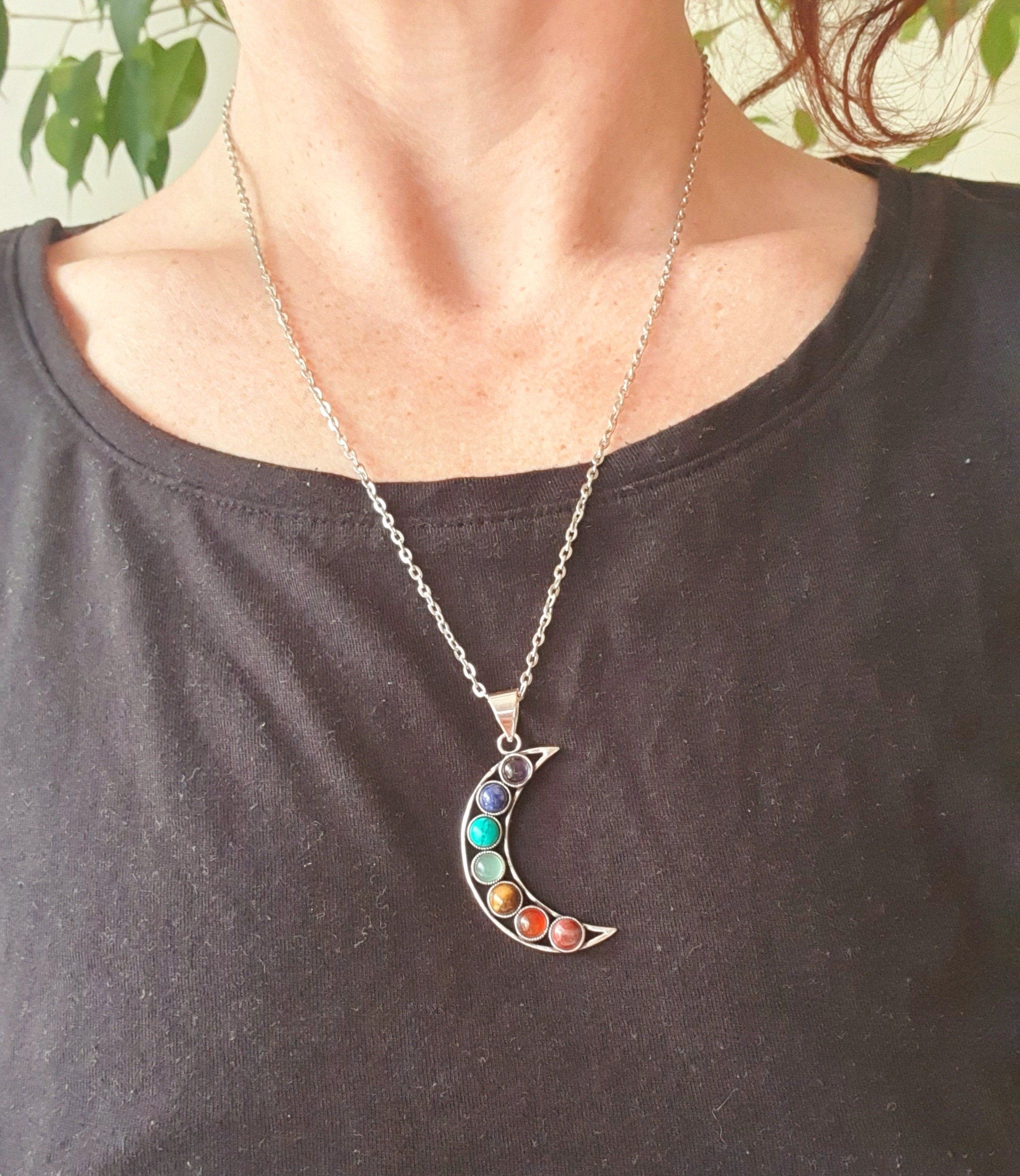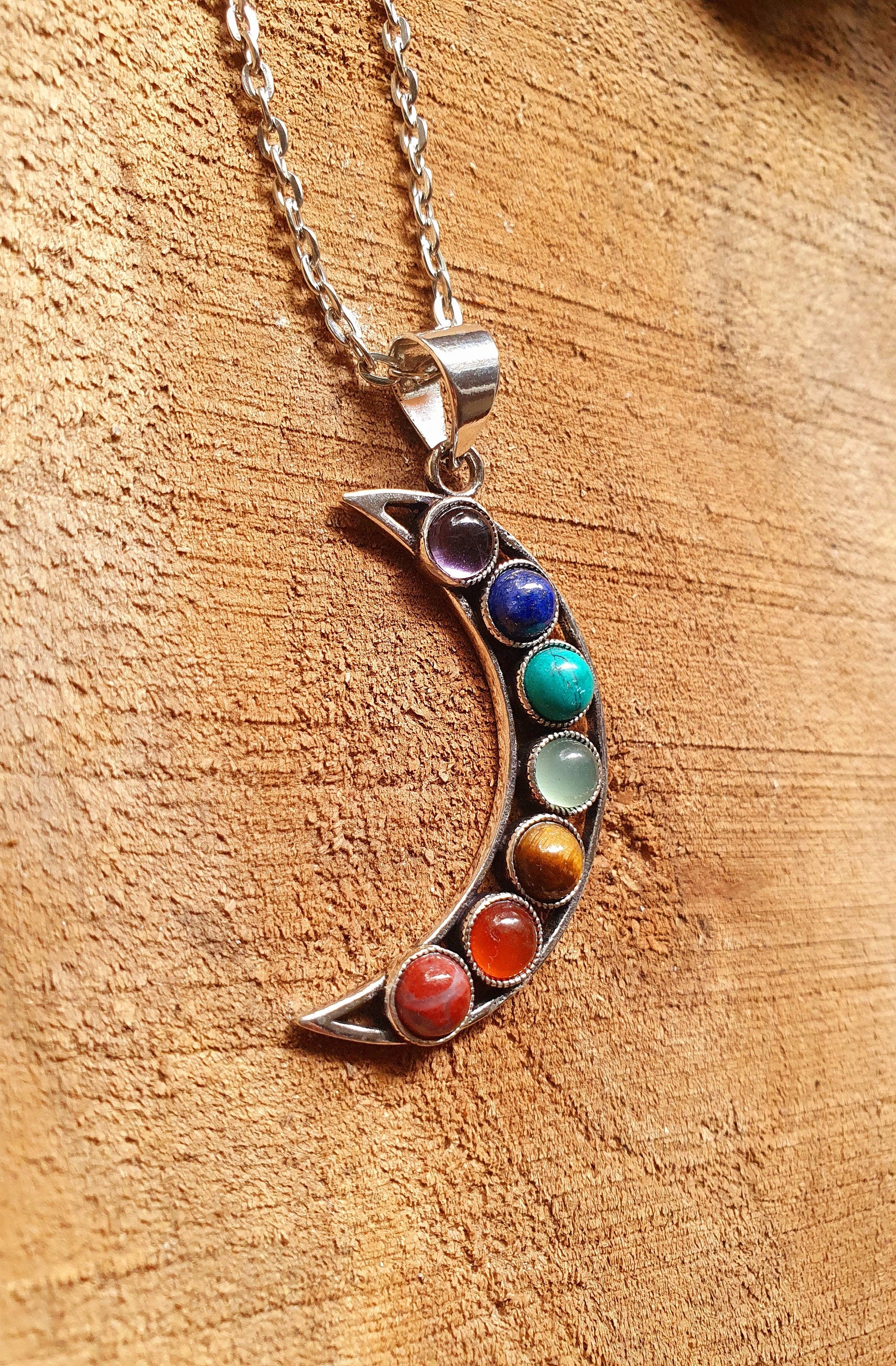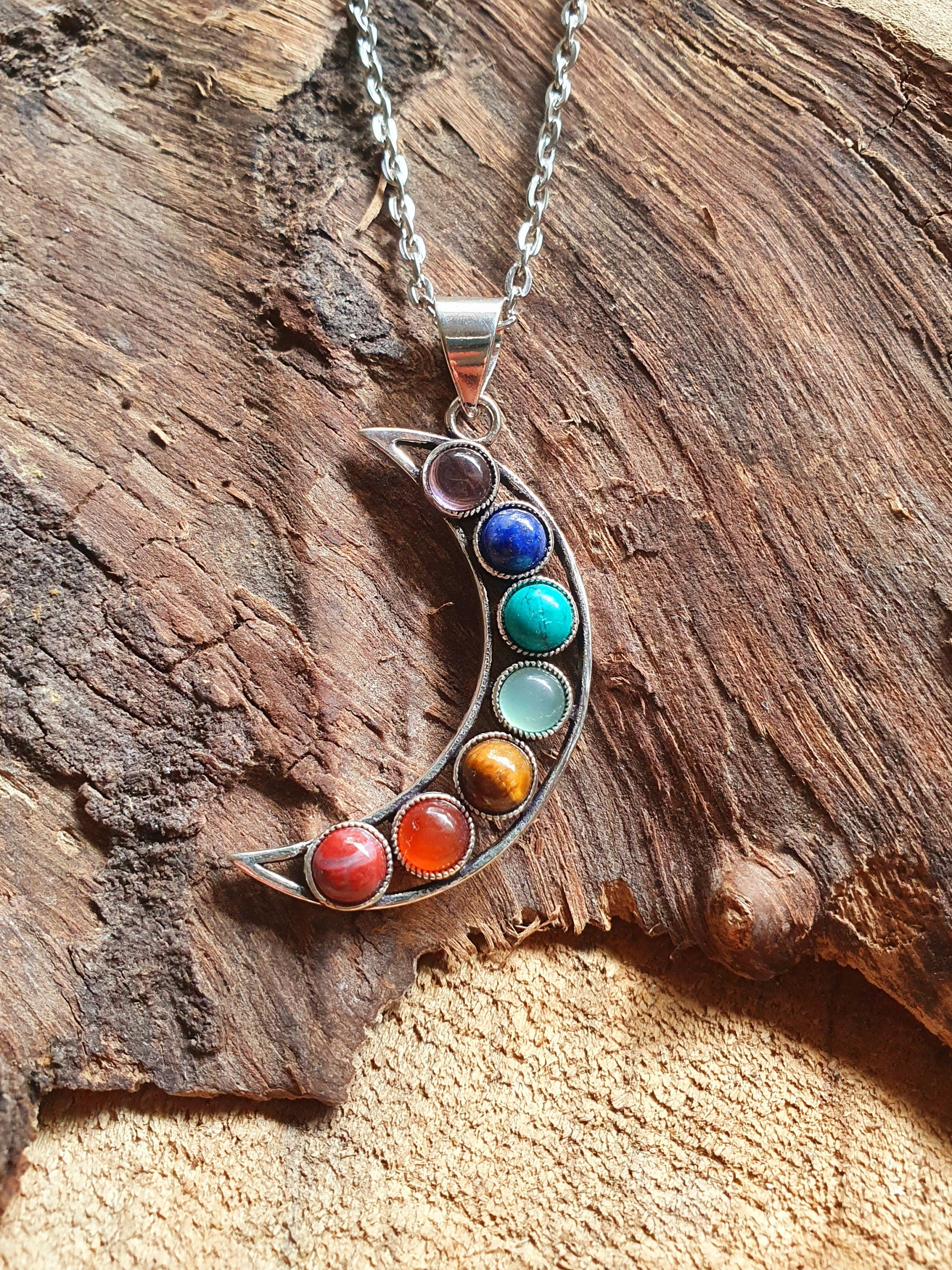 Moon & Seven Chakras necklace on hypoallergenic stainless steel chain.