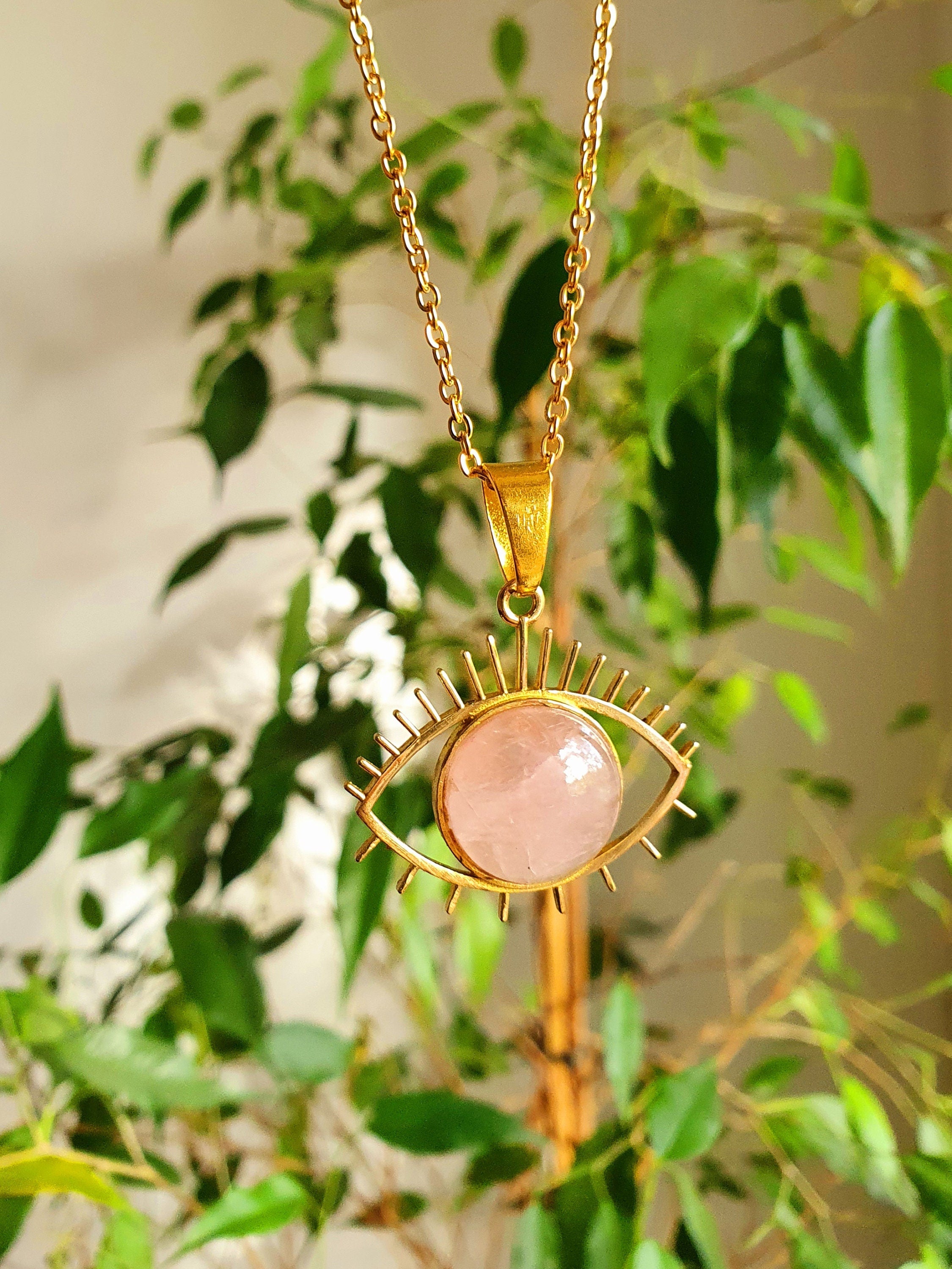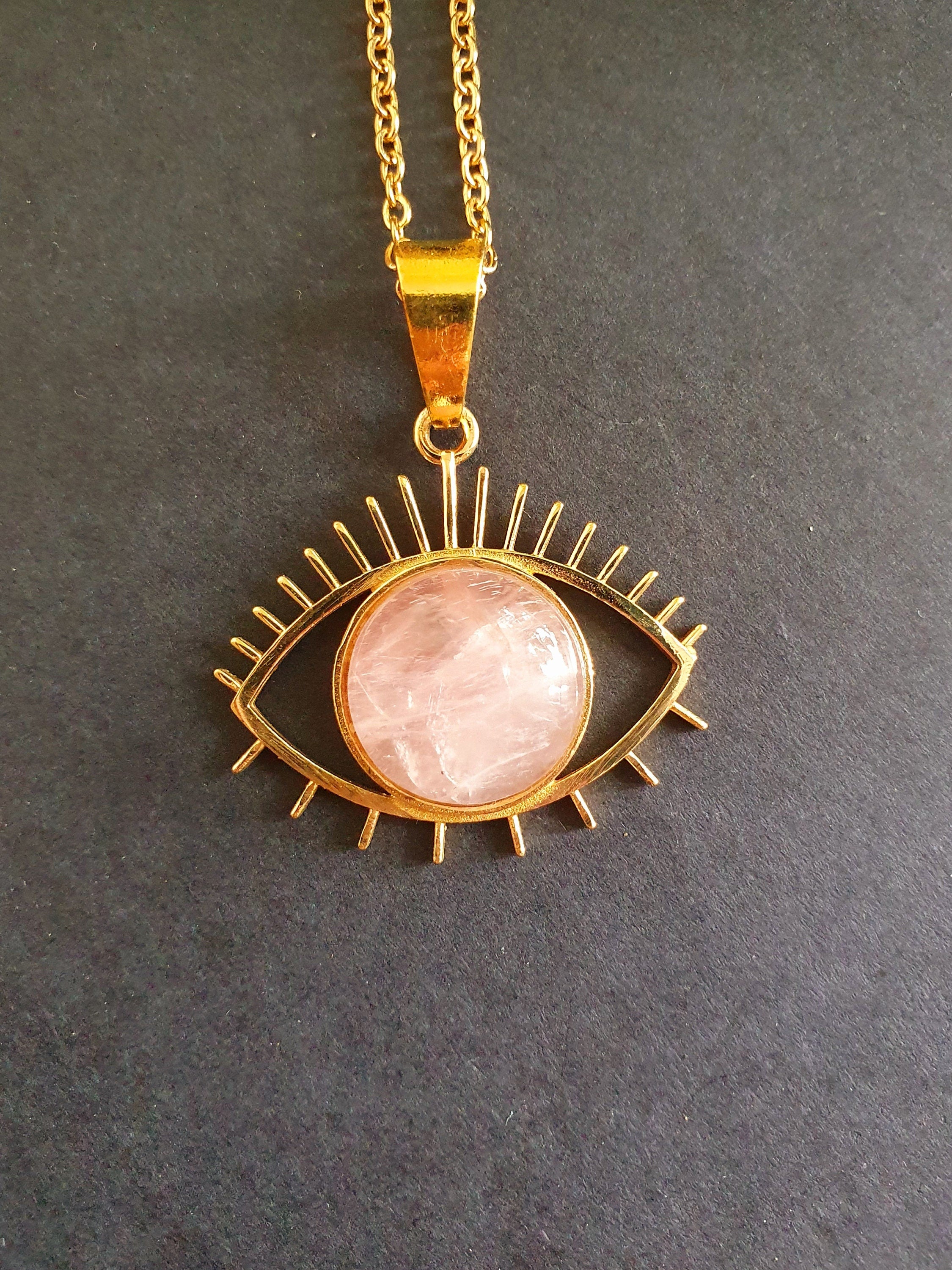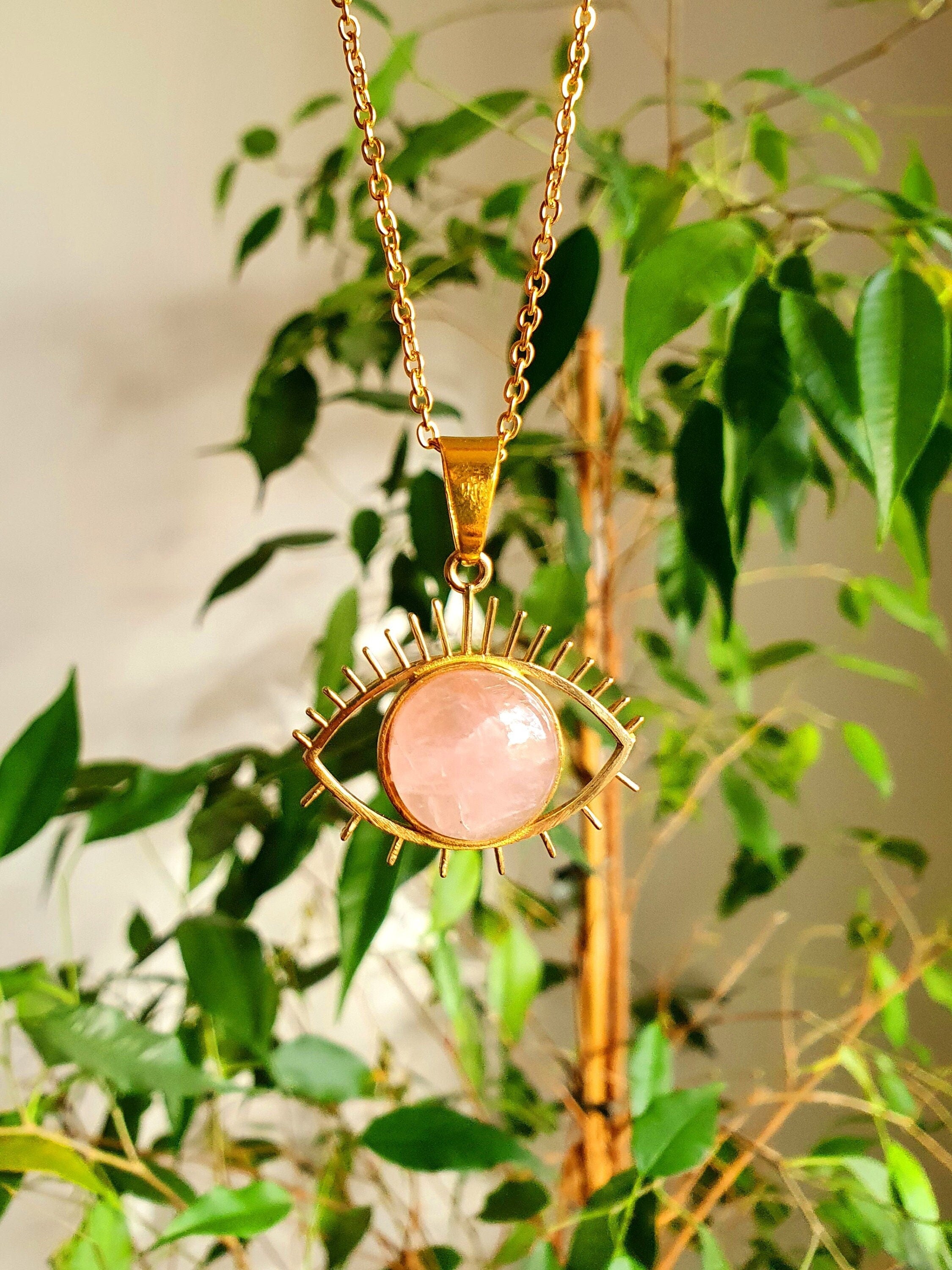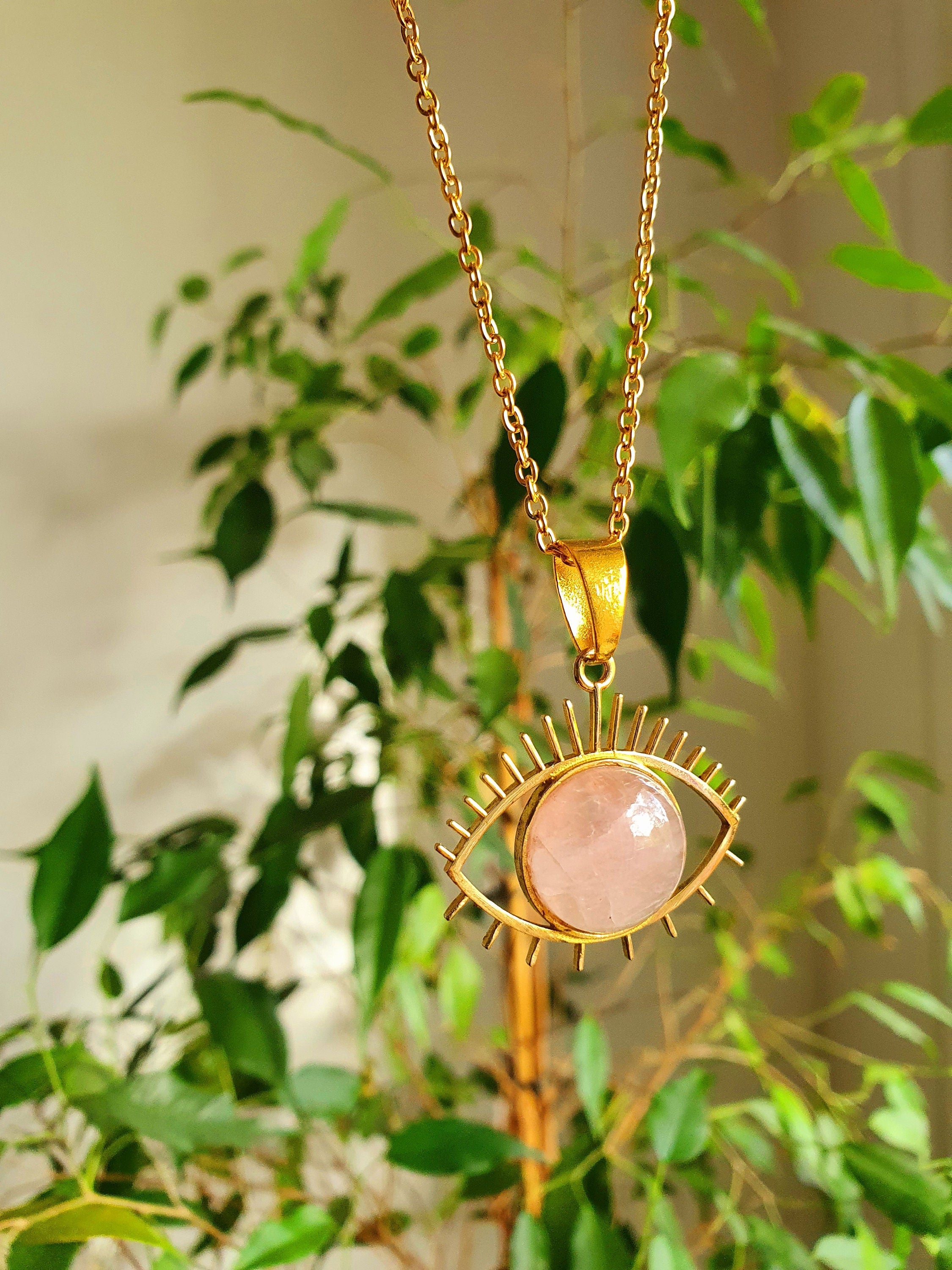Golden Sacred Eye of Protection necklace with rose quartz on stainless steel chain.