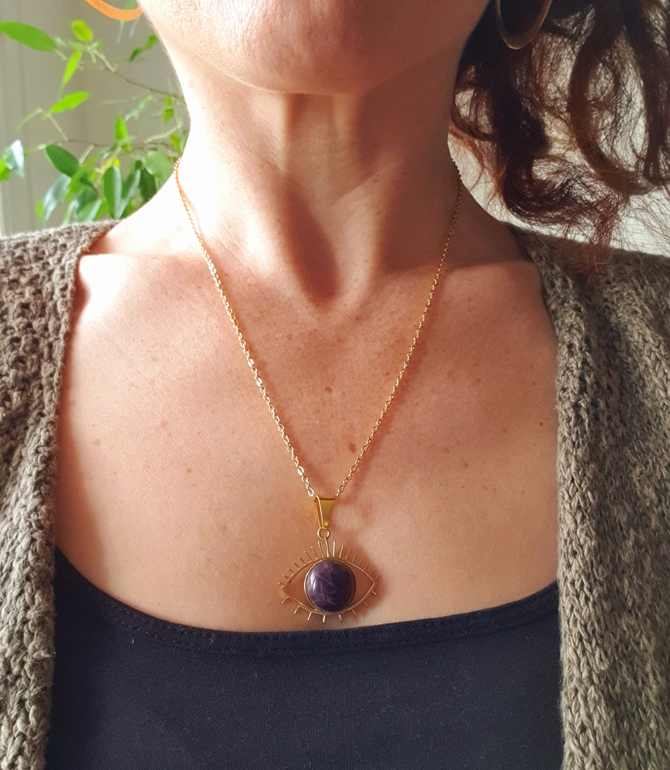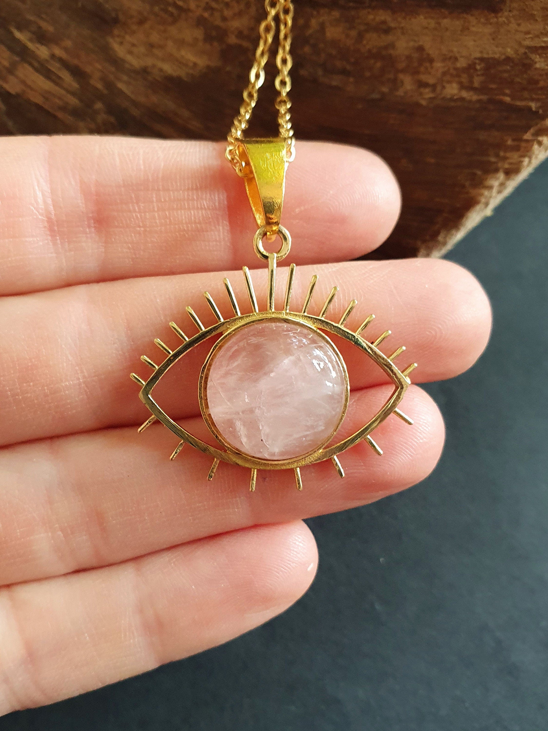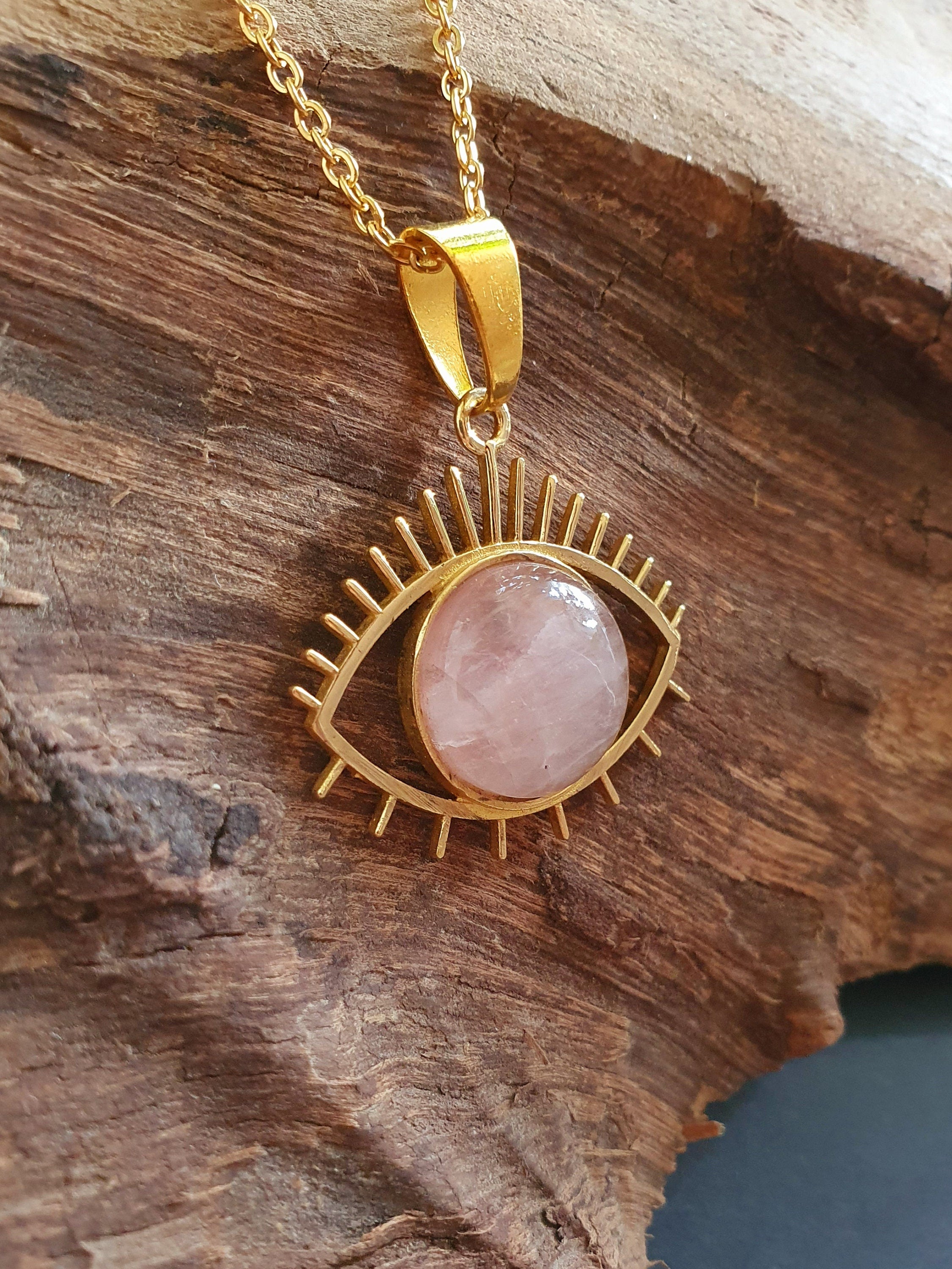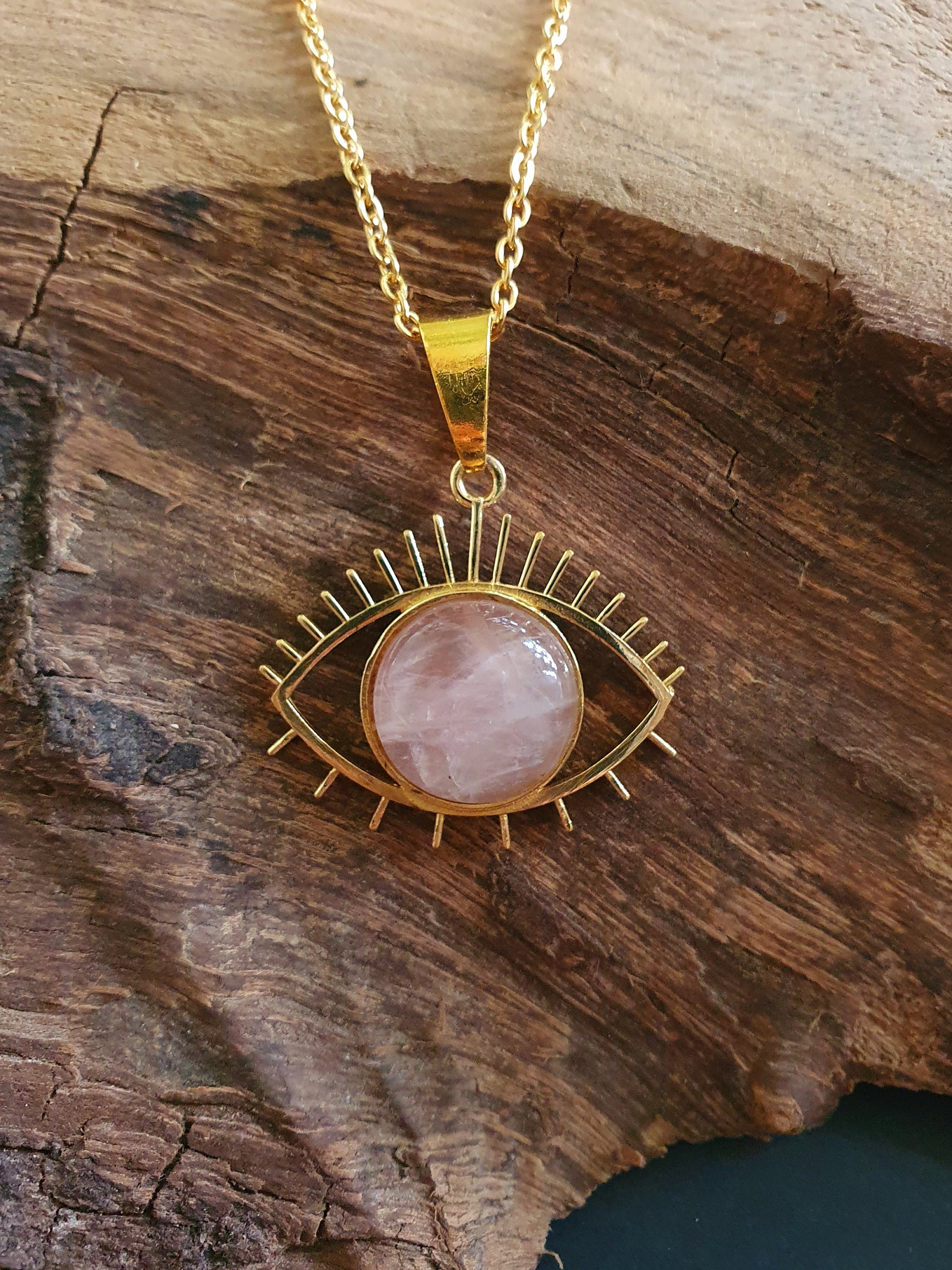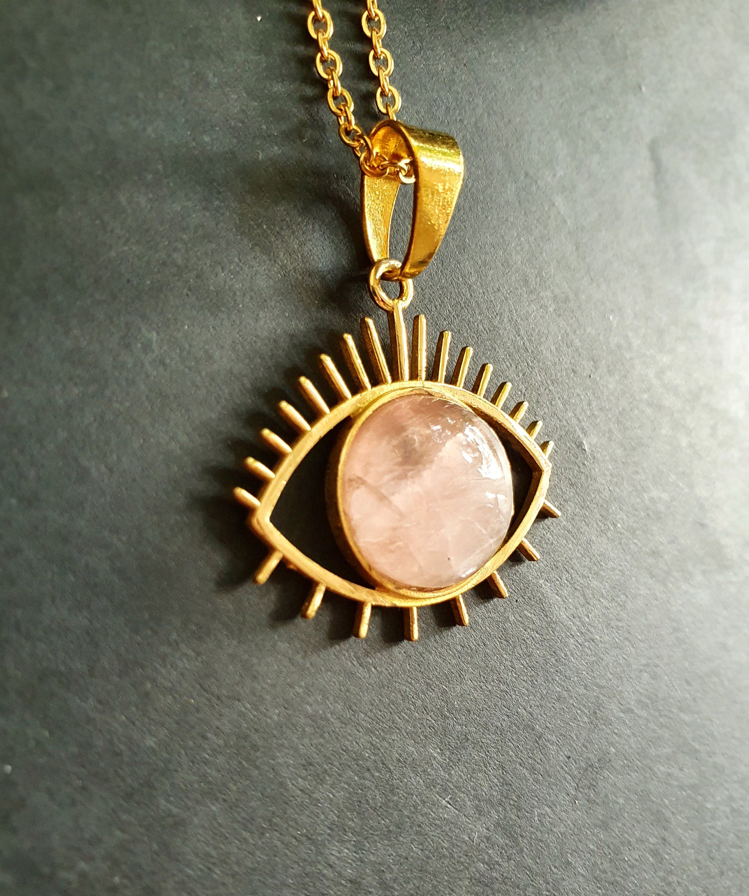 Golden Sacred Eye of Protection necklace with rose quartz on stainless steel chain.