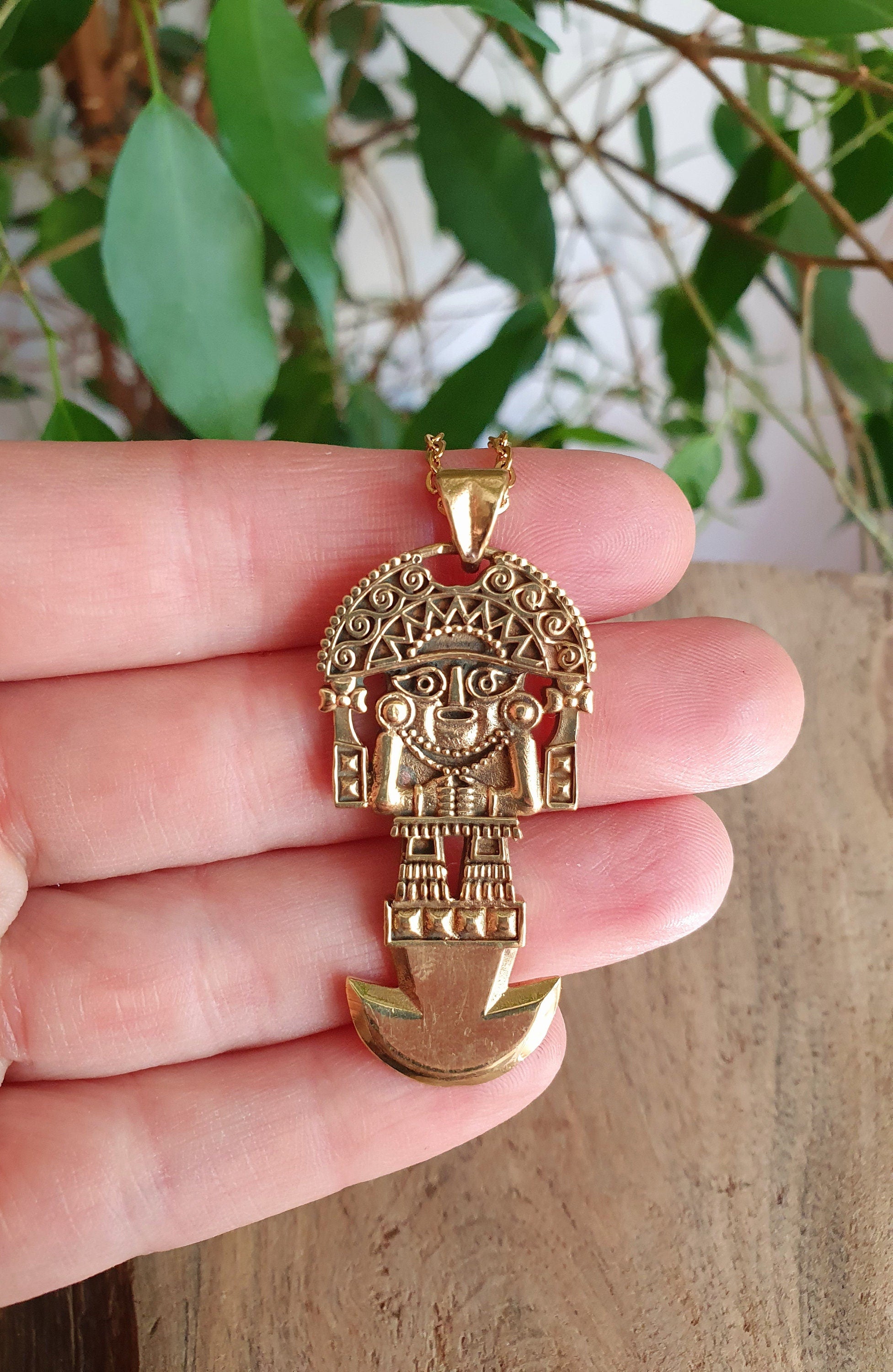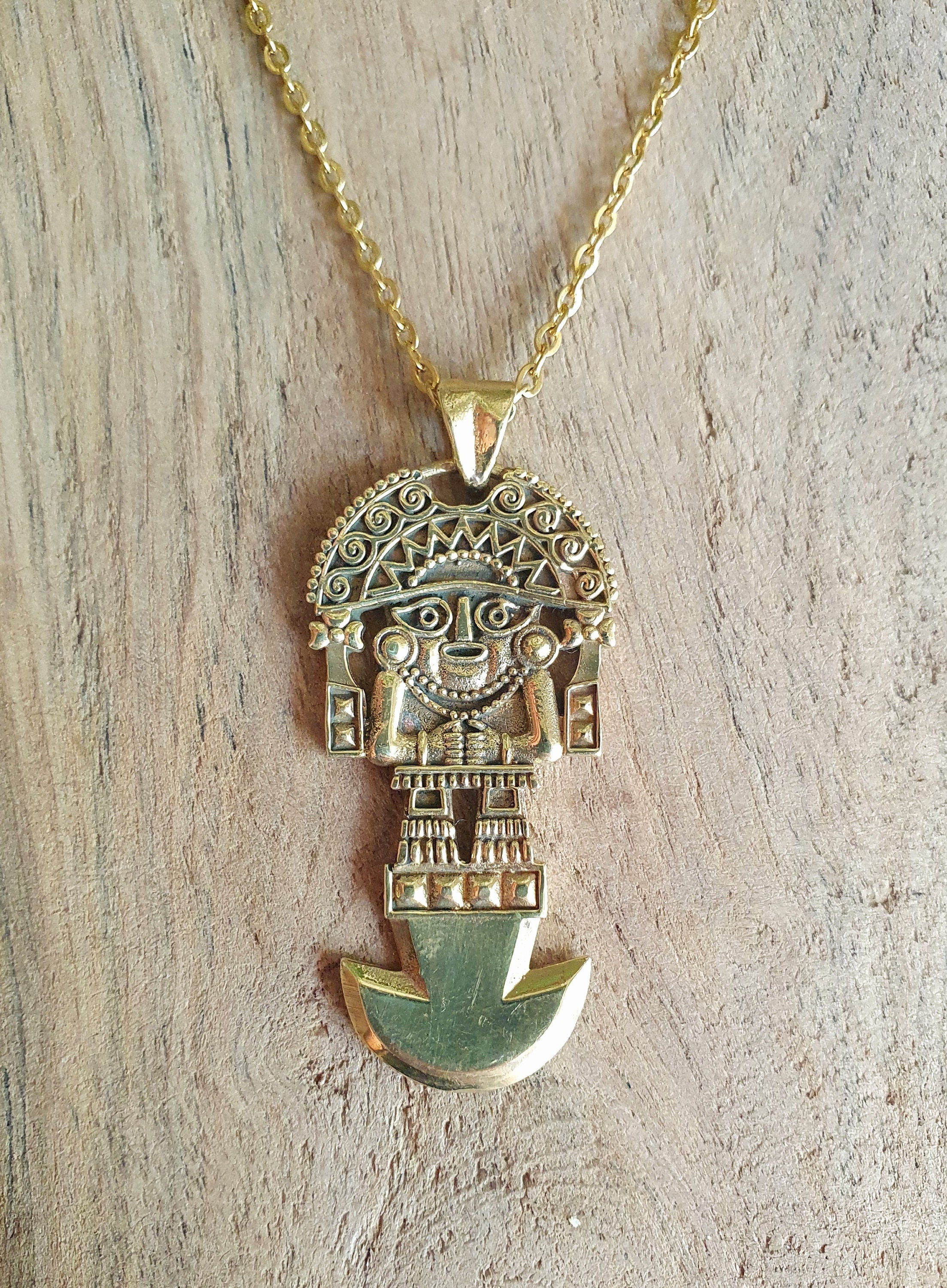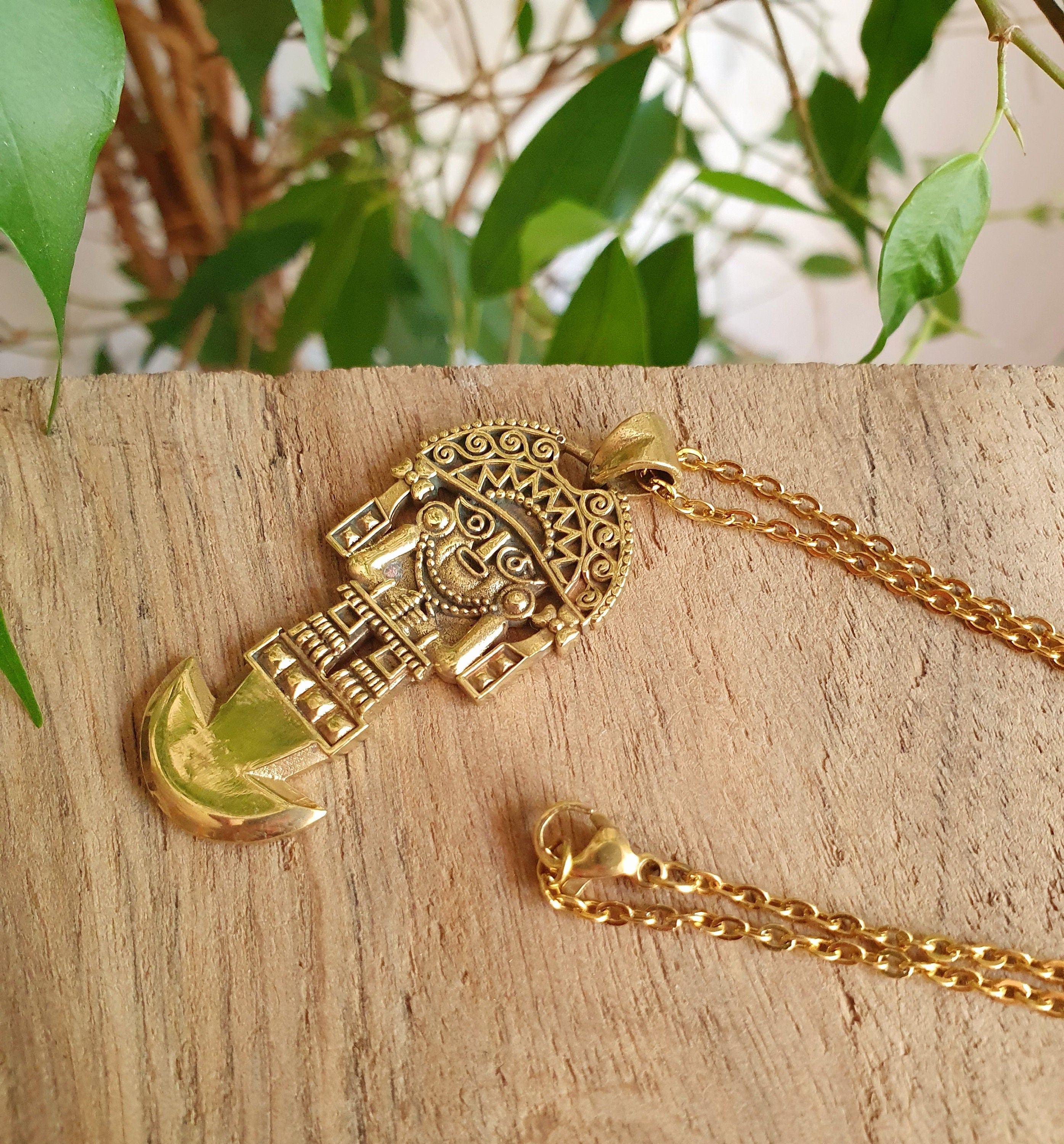 Golden Sacred Tumi or Naylamp, Mayan Pantheon, necklace on stainless steel chain.