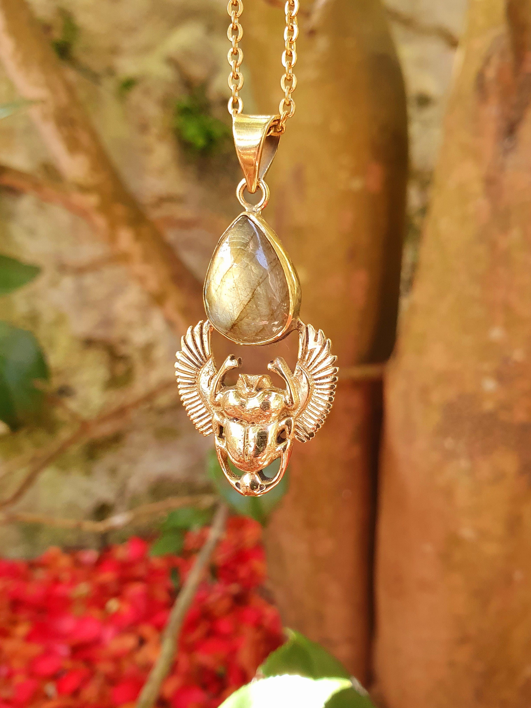 Golden Scarab necklace with labradorite on stainless steel chain.