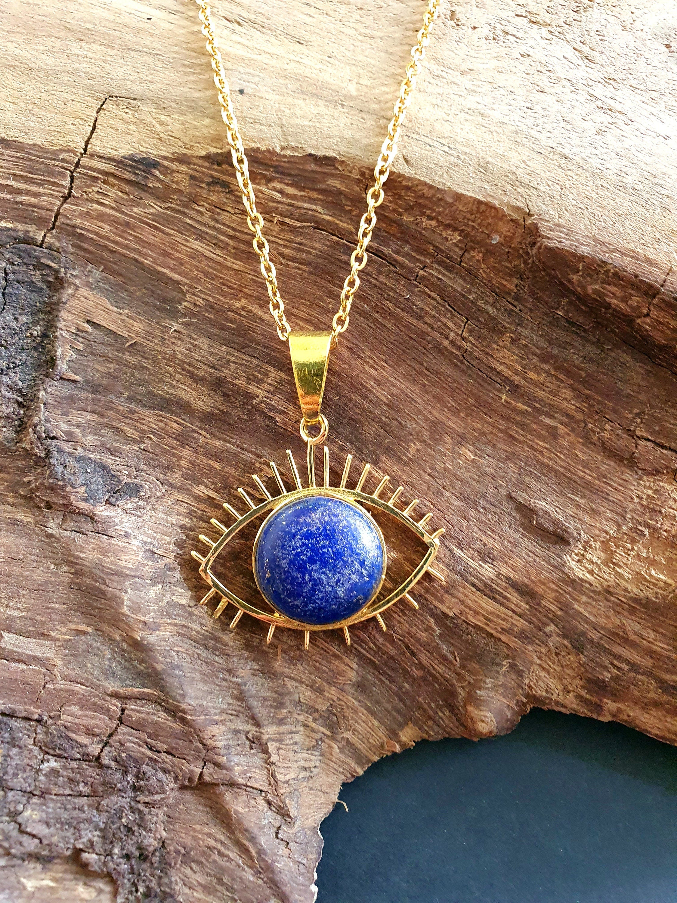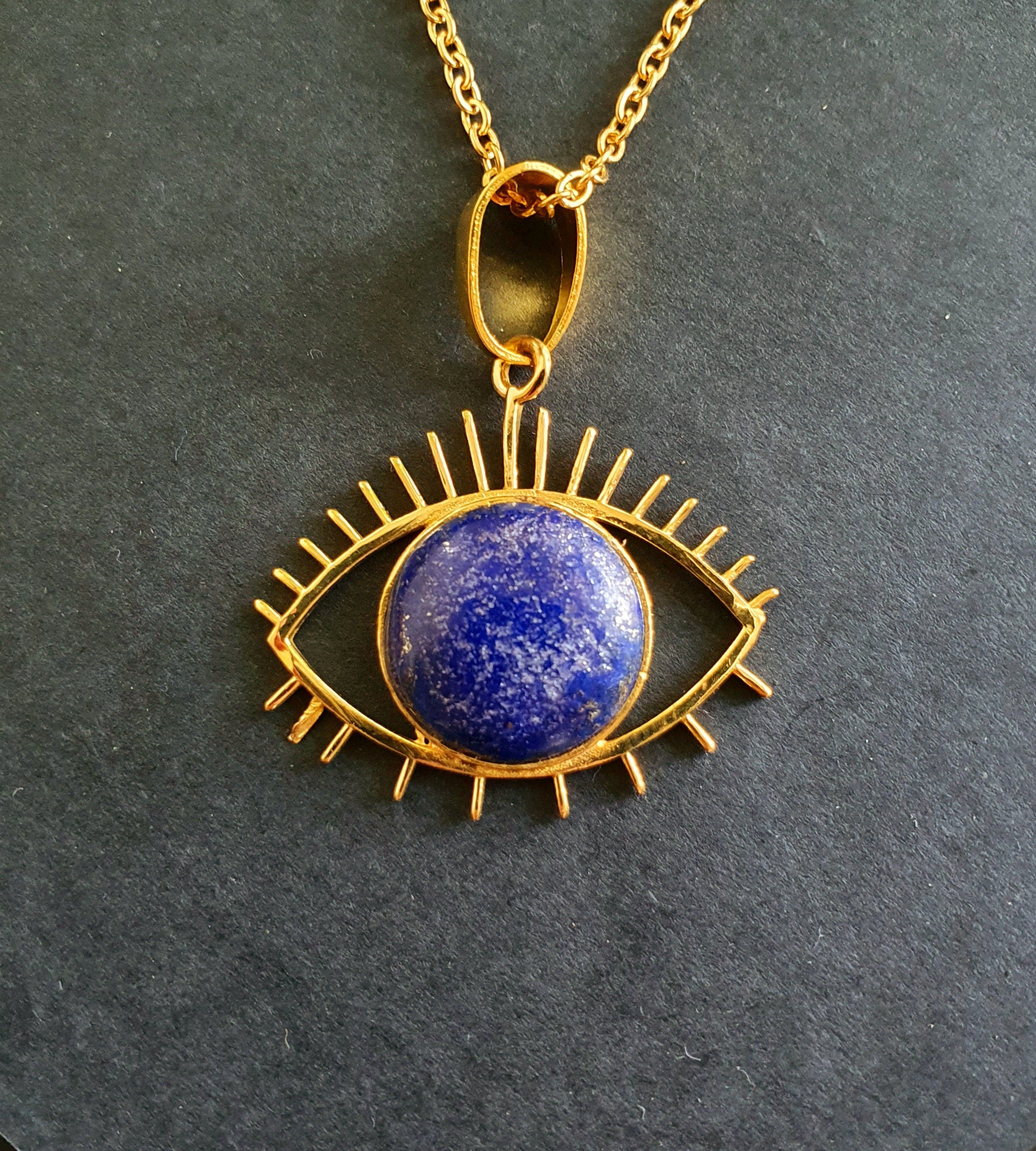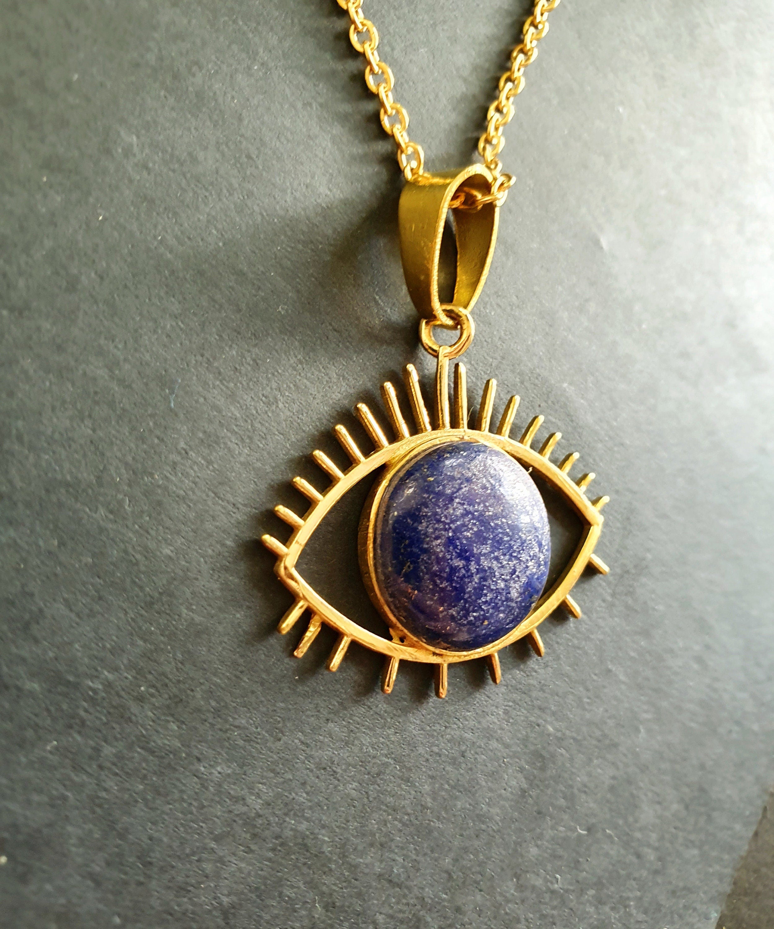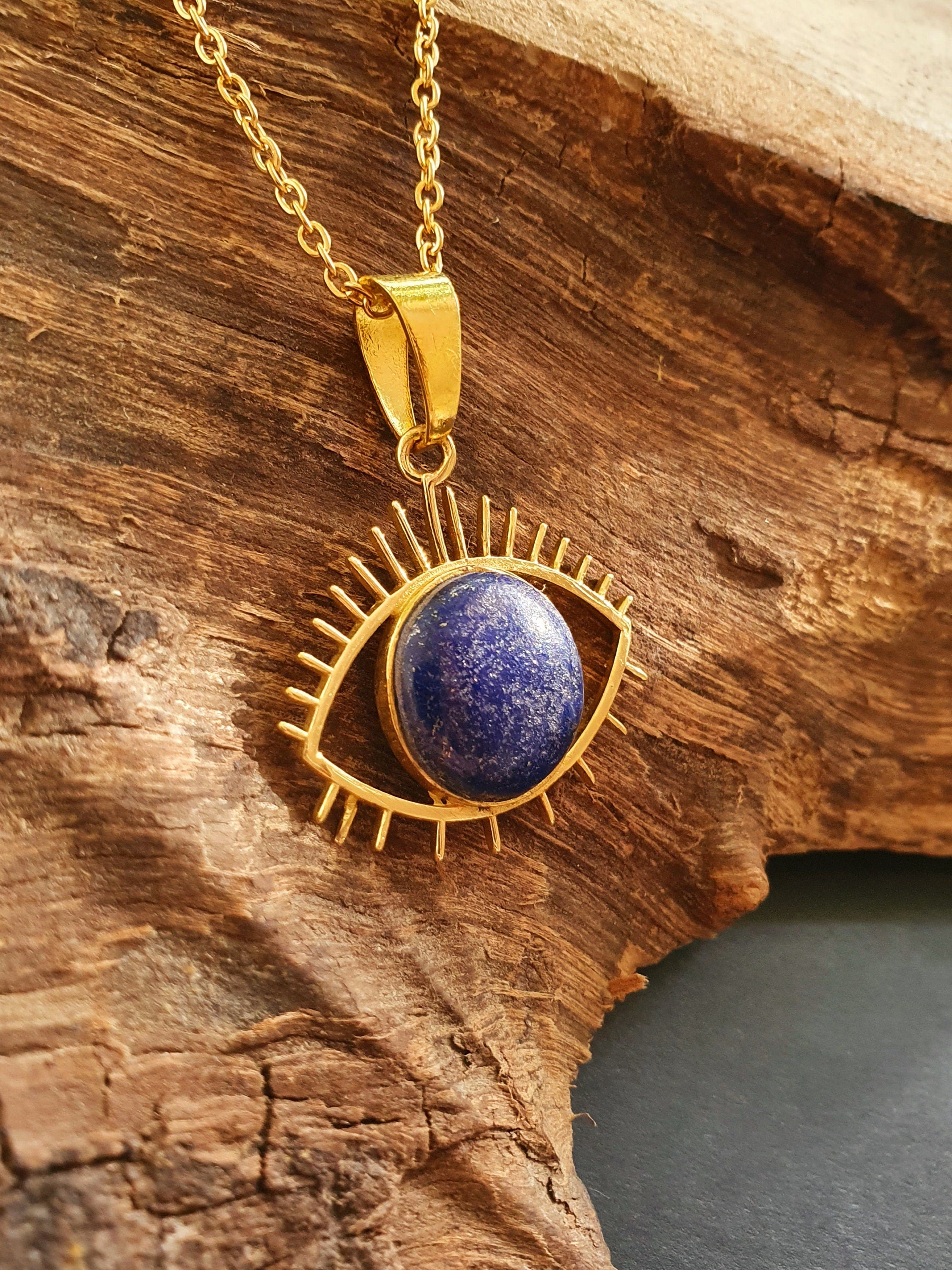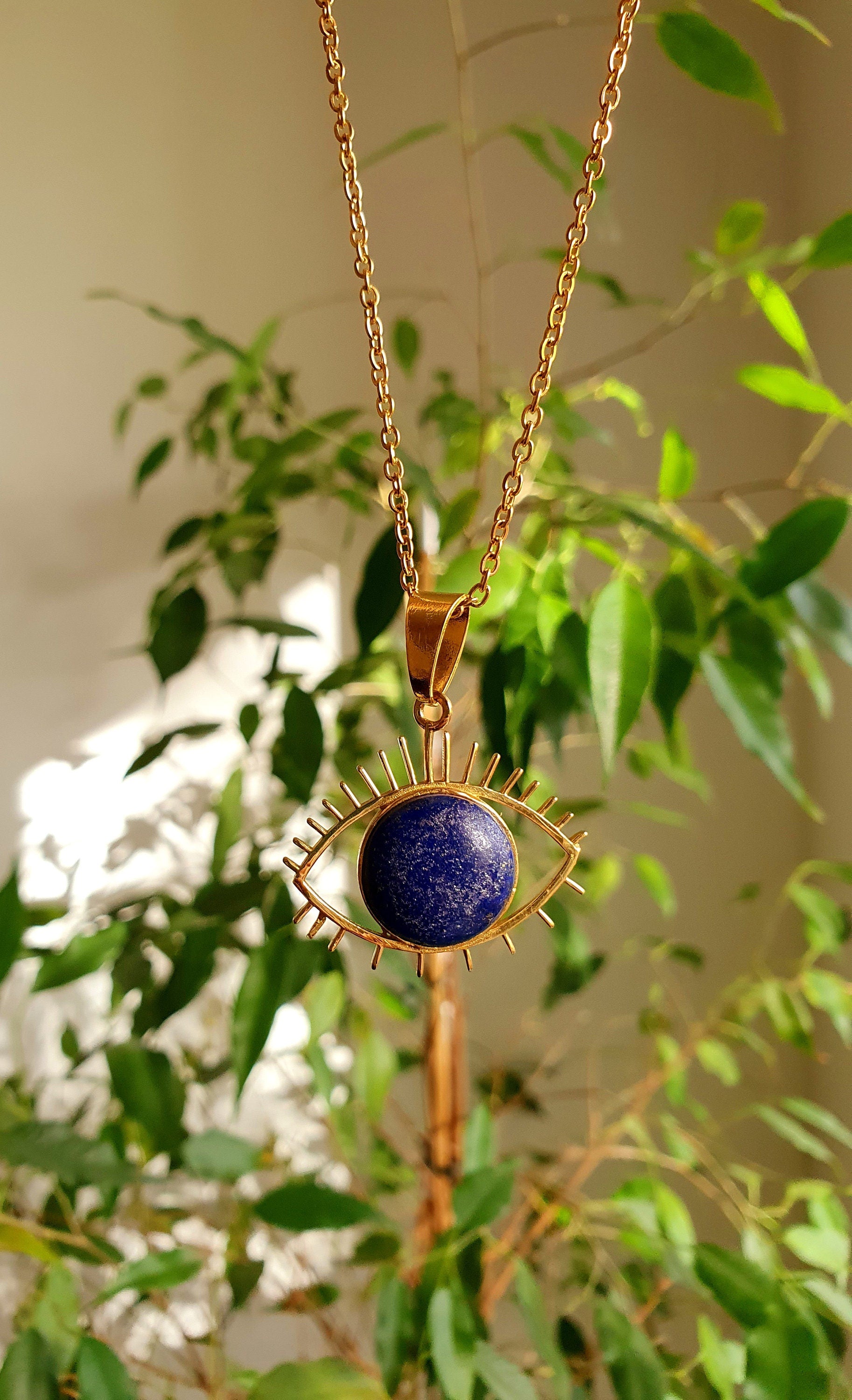 Golden Sacred Eye of Protection necklace with lapis lazuli on stainless steel chain.