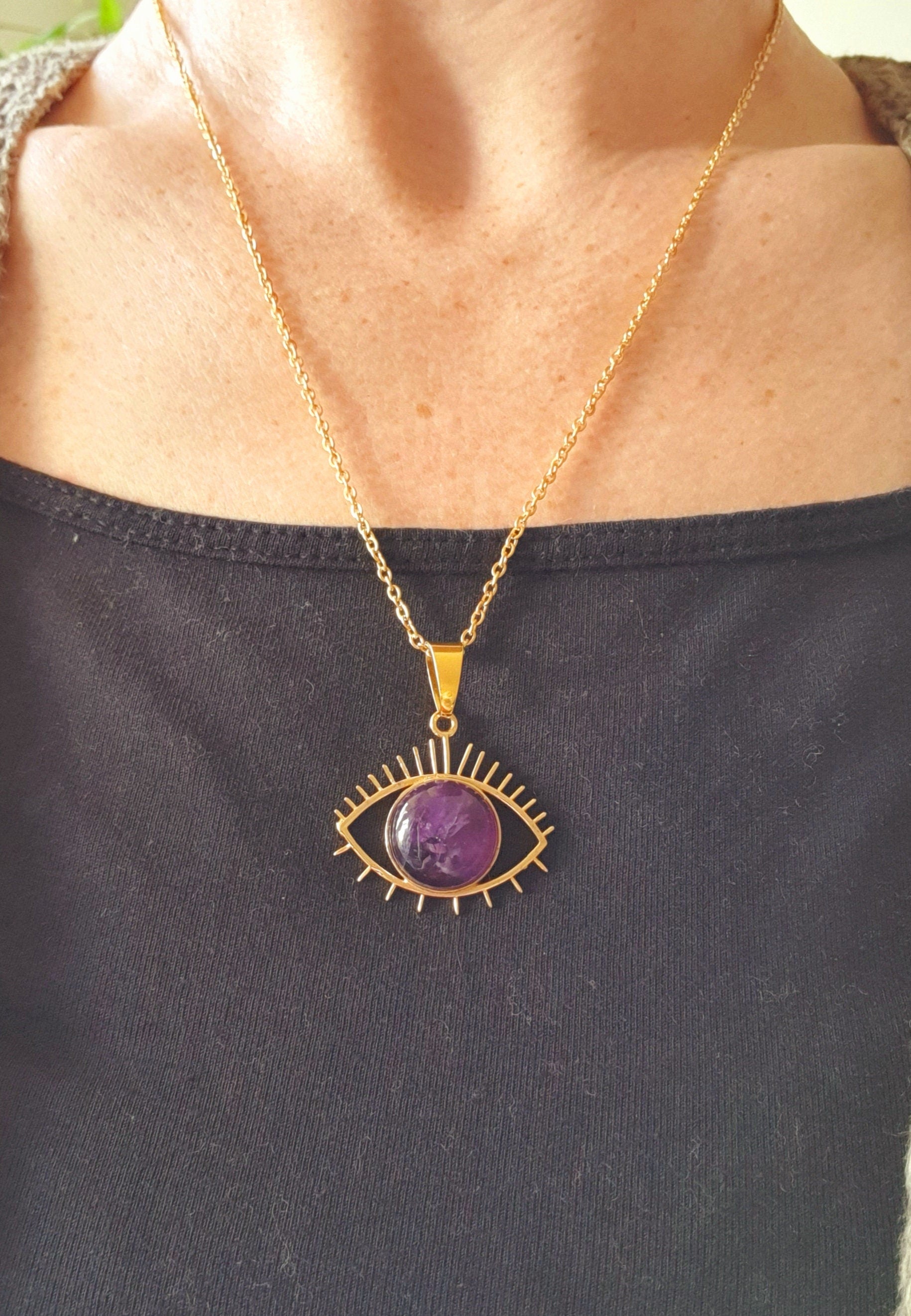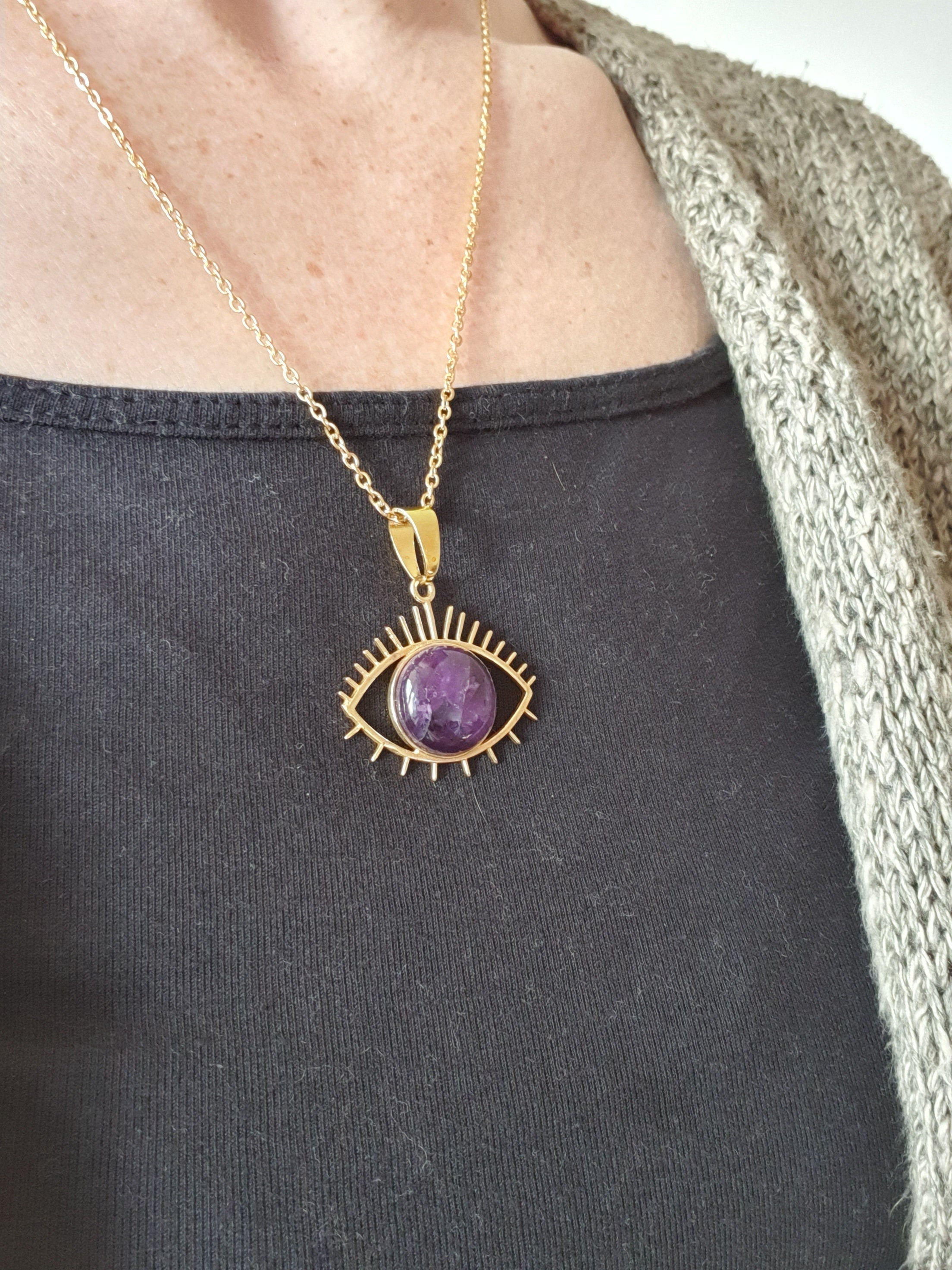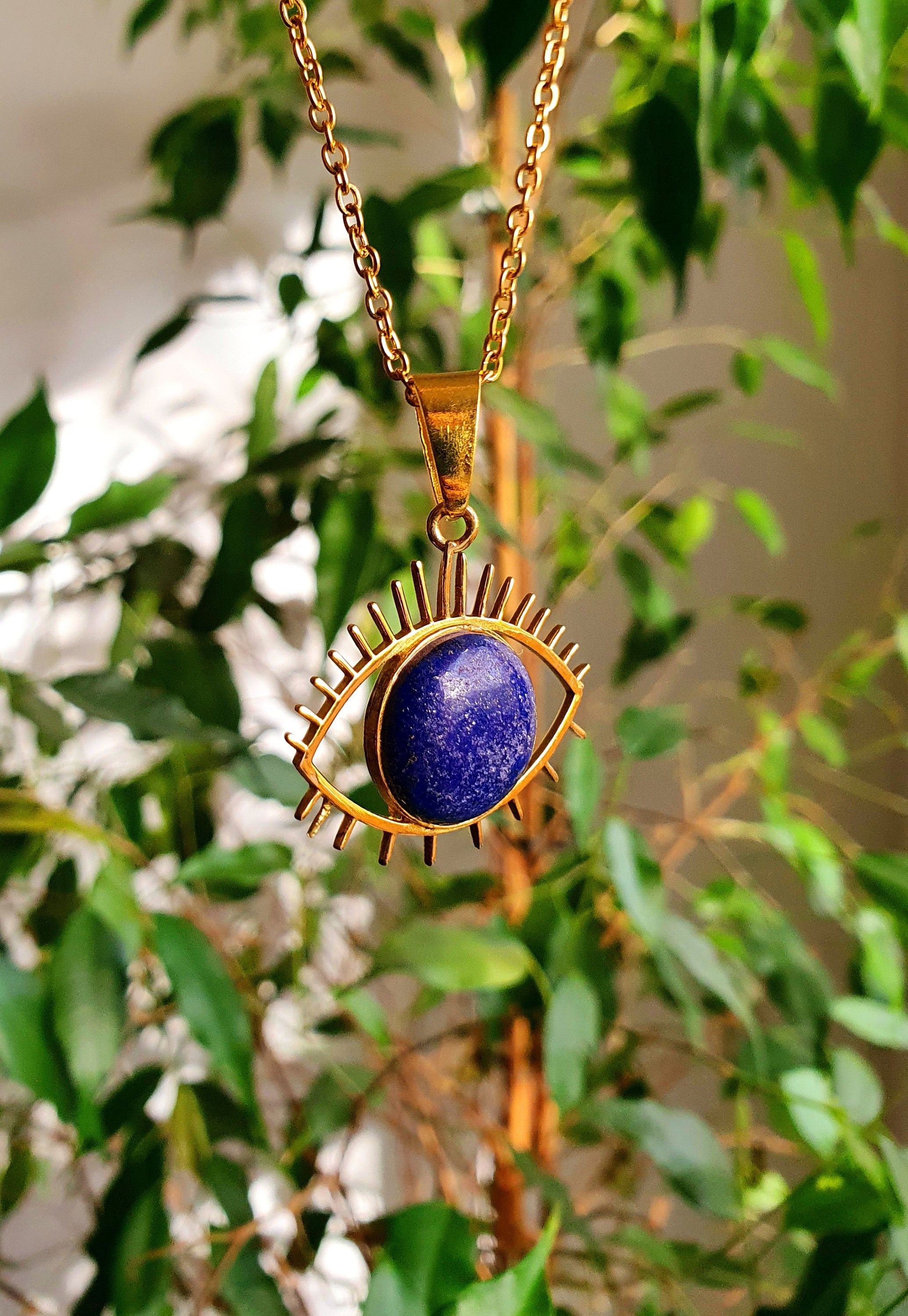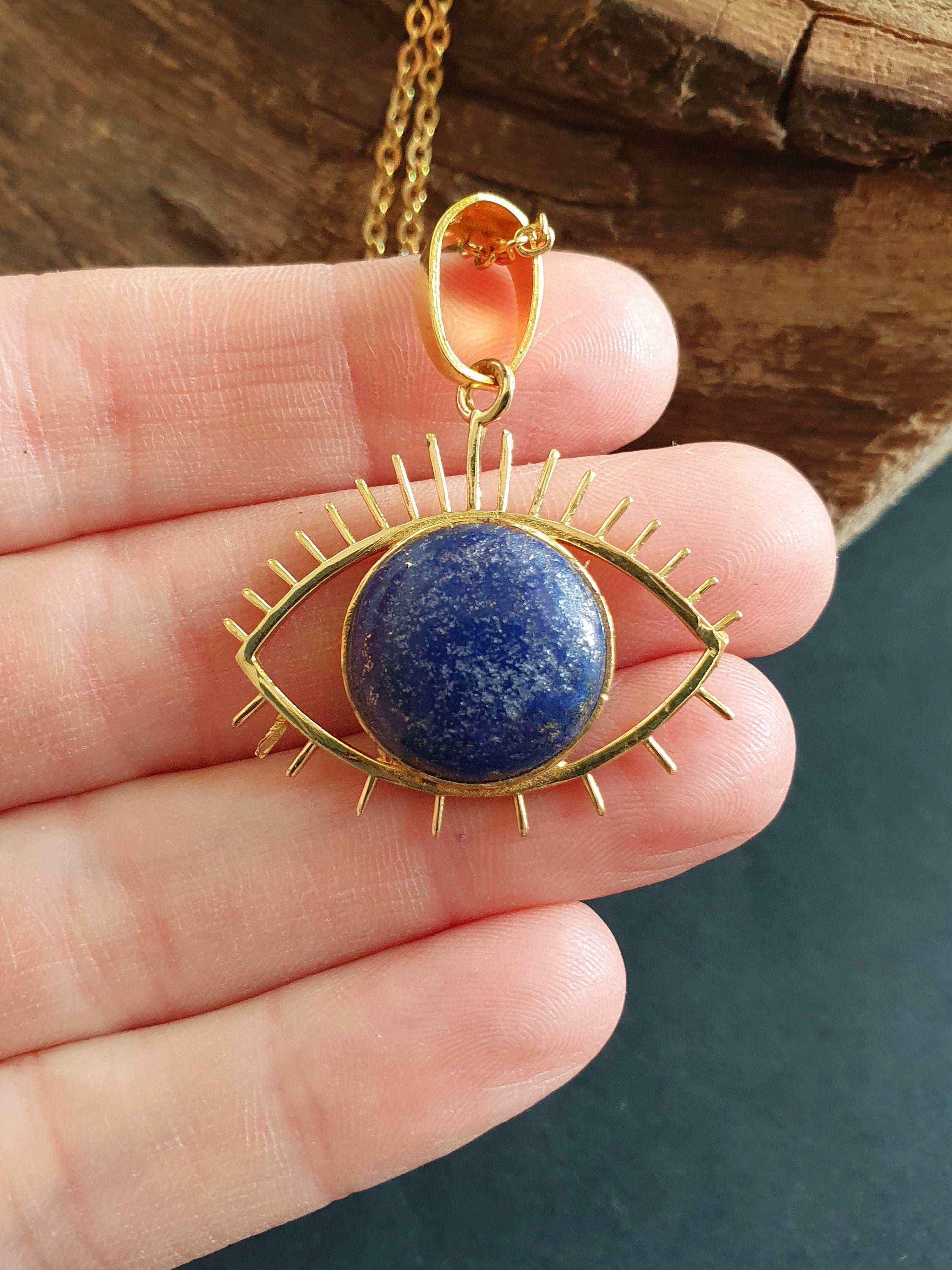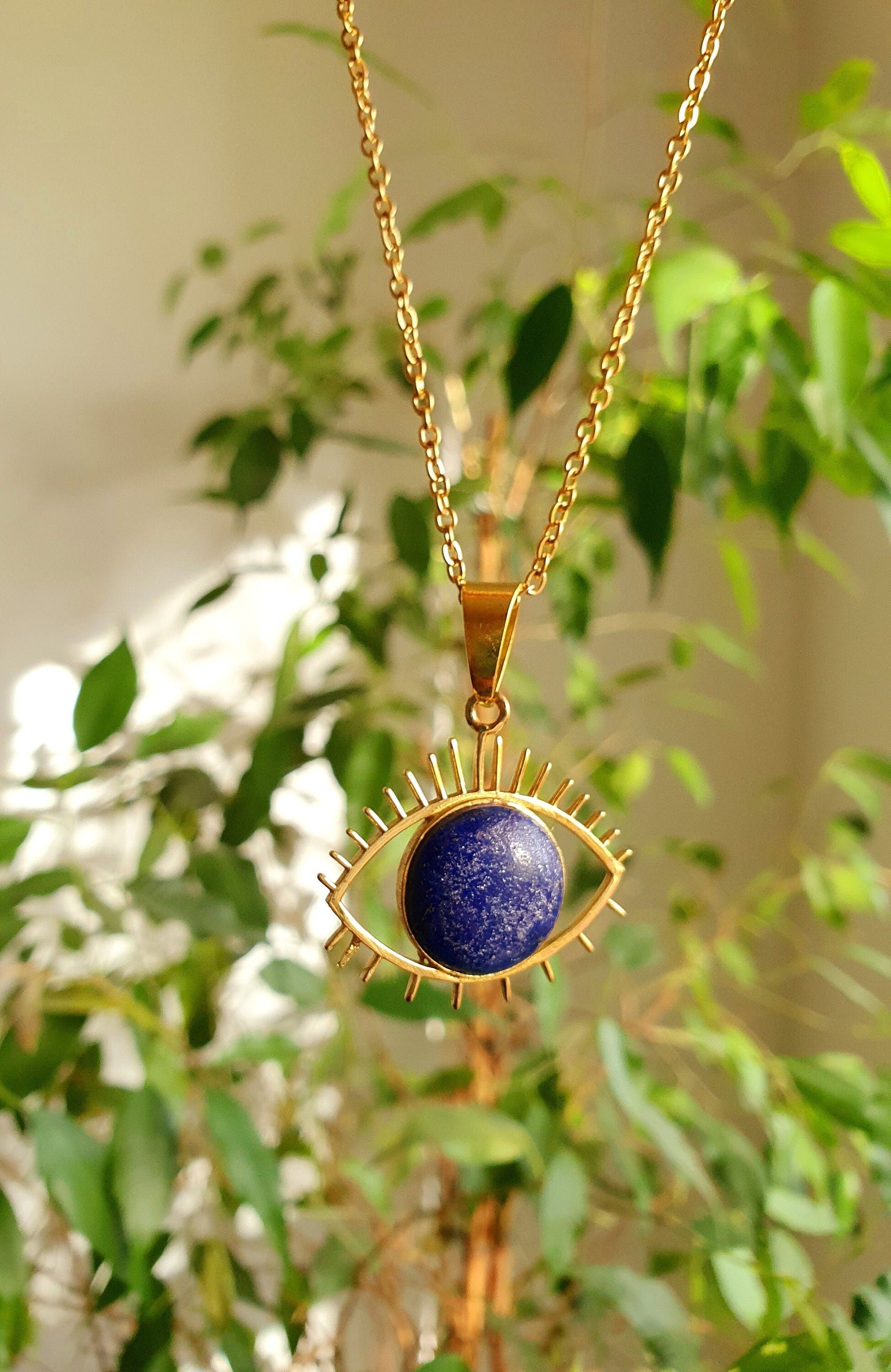 Golden Sacred Eye of Protection necklace with lapis lazuli on stainless steel chain.