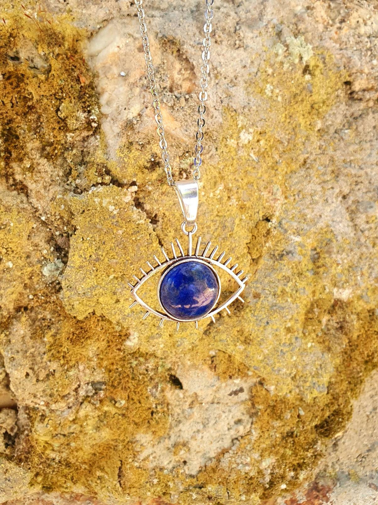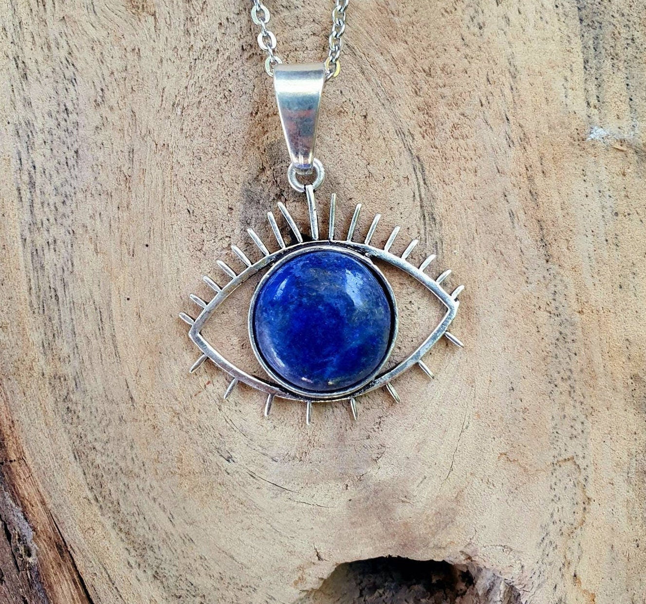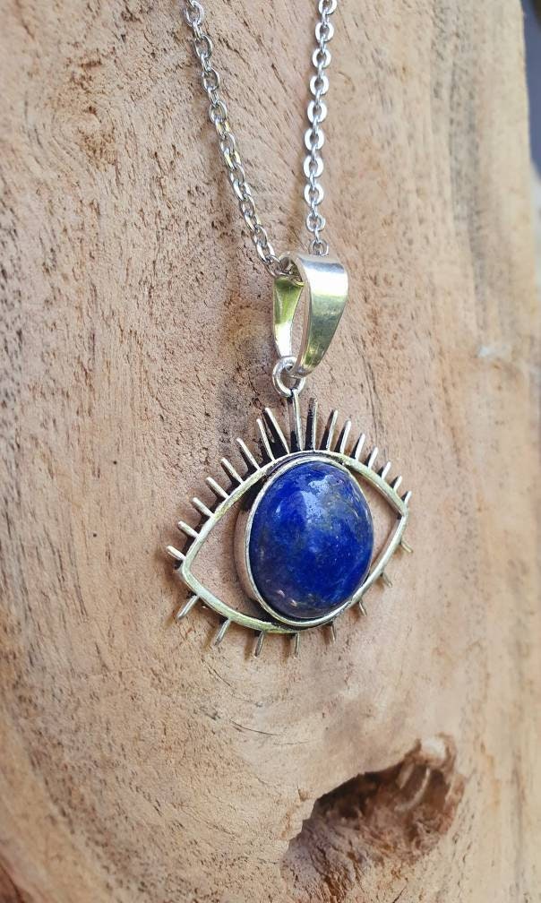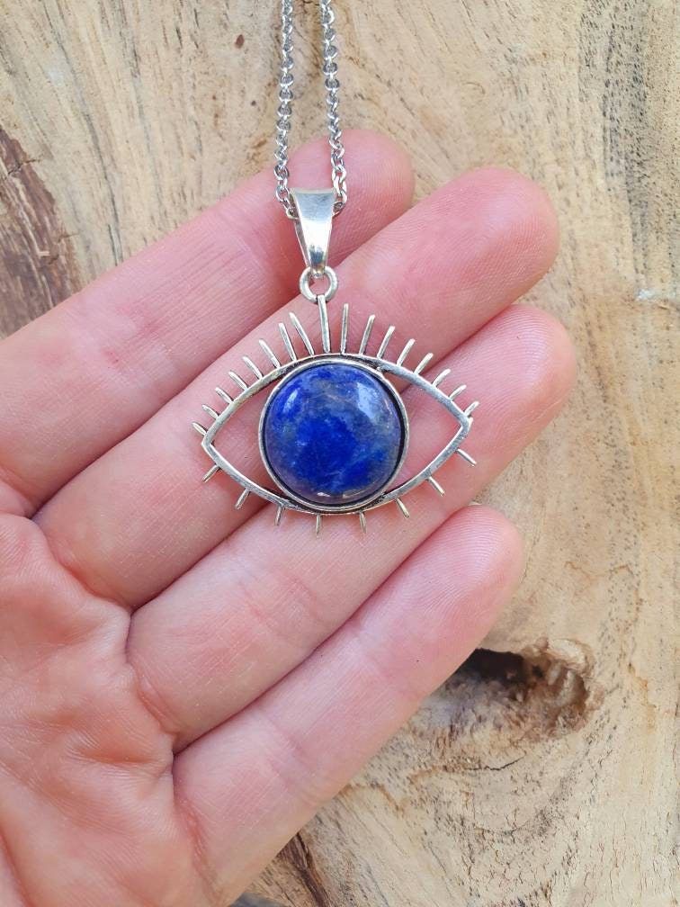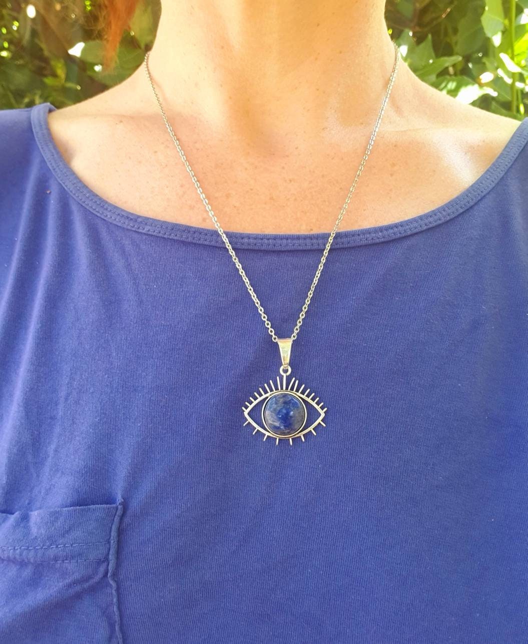 Silver Sacred Eye of Protection necklace with lapis lazuli on stainless steel chain.
