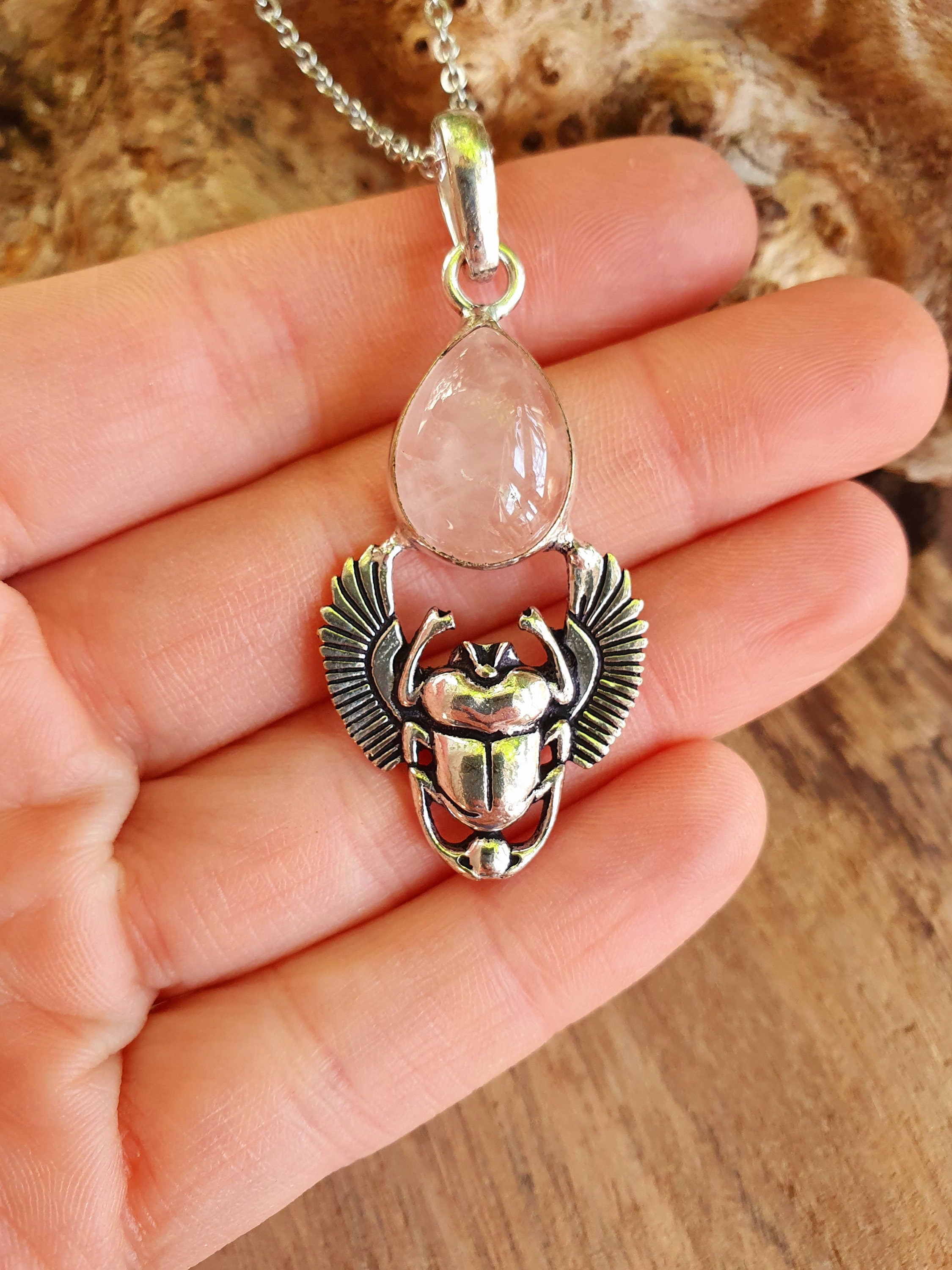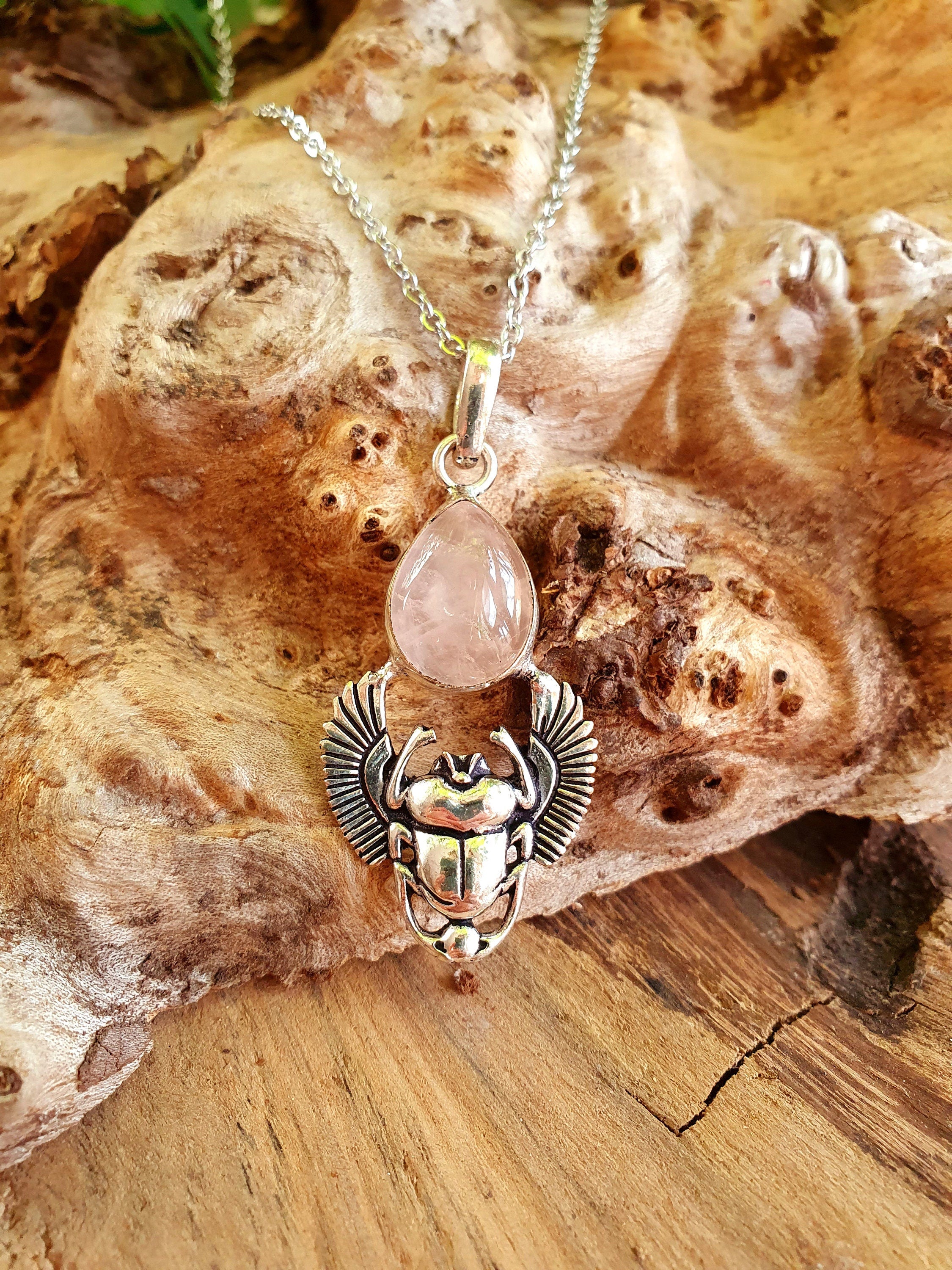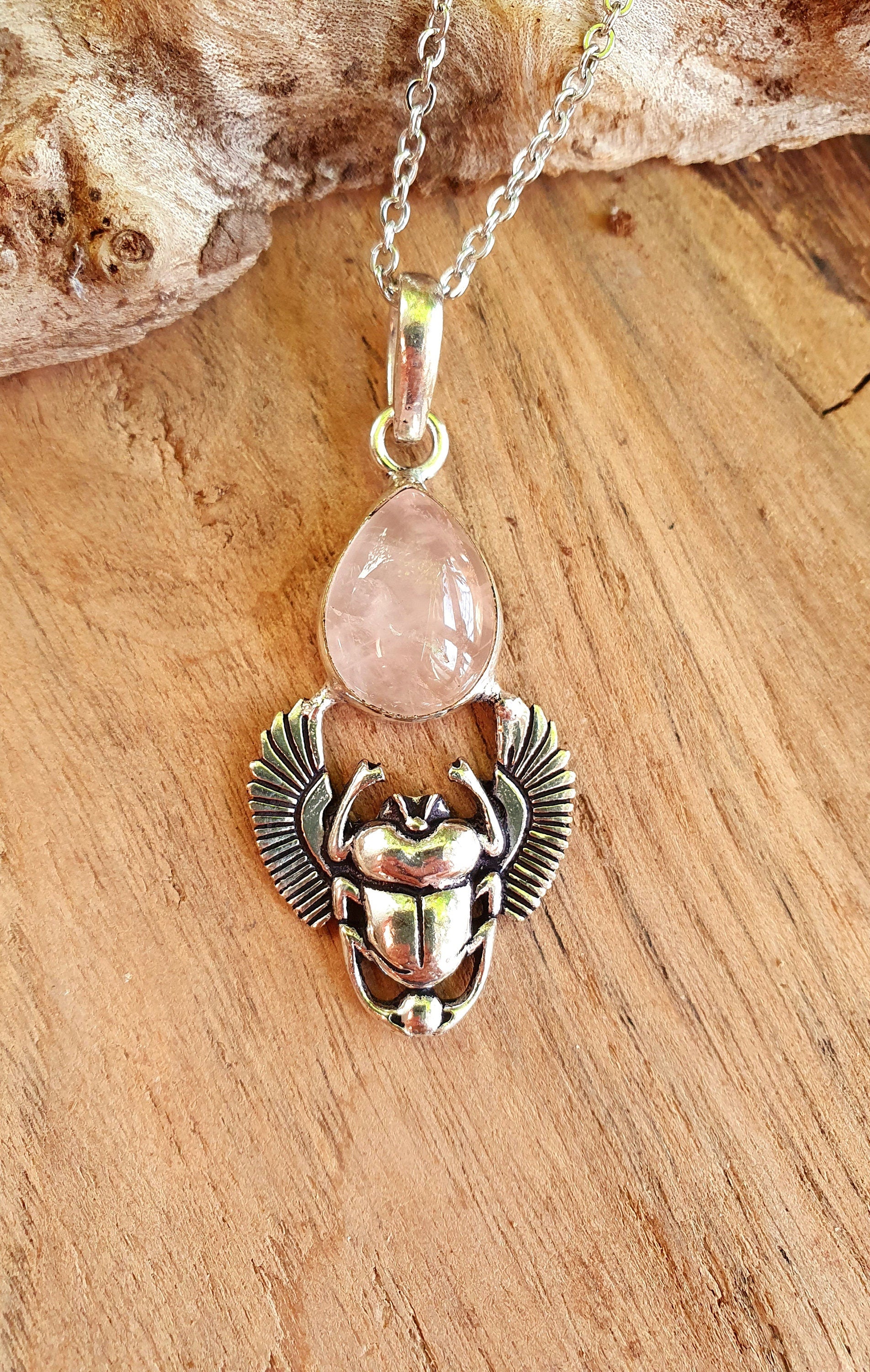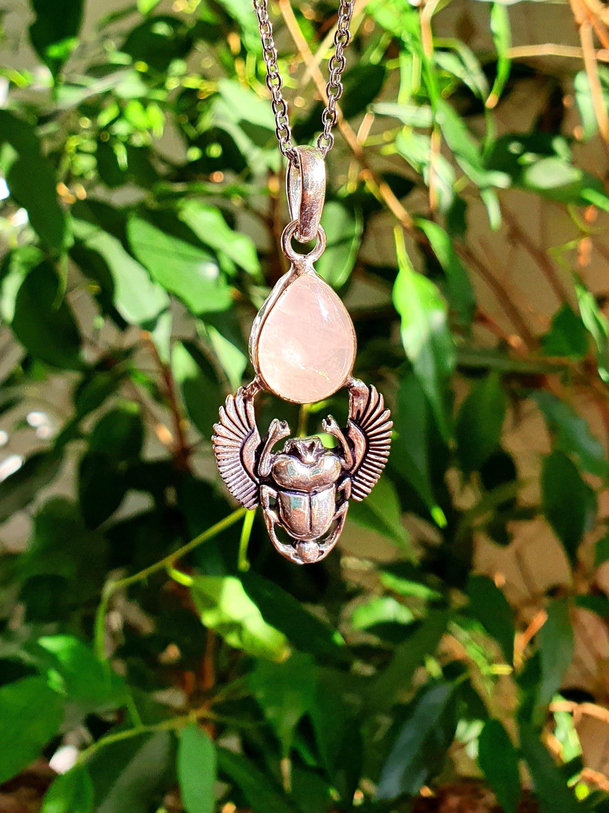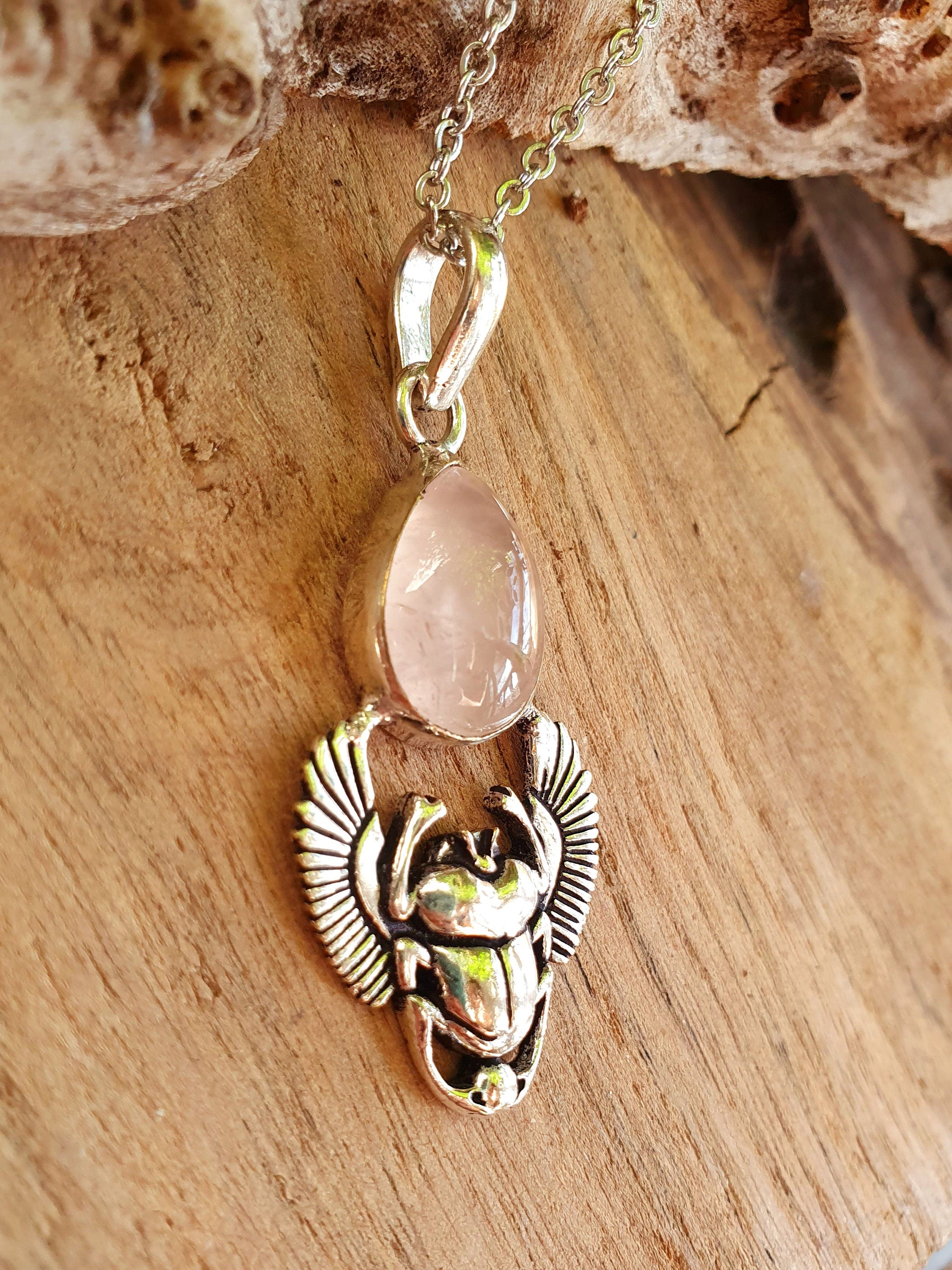 Silver Scarab necklace with rose quartz (pale) on stainless steel chain.