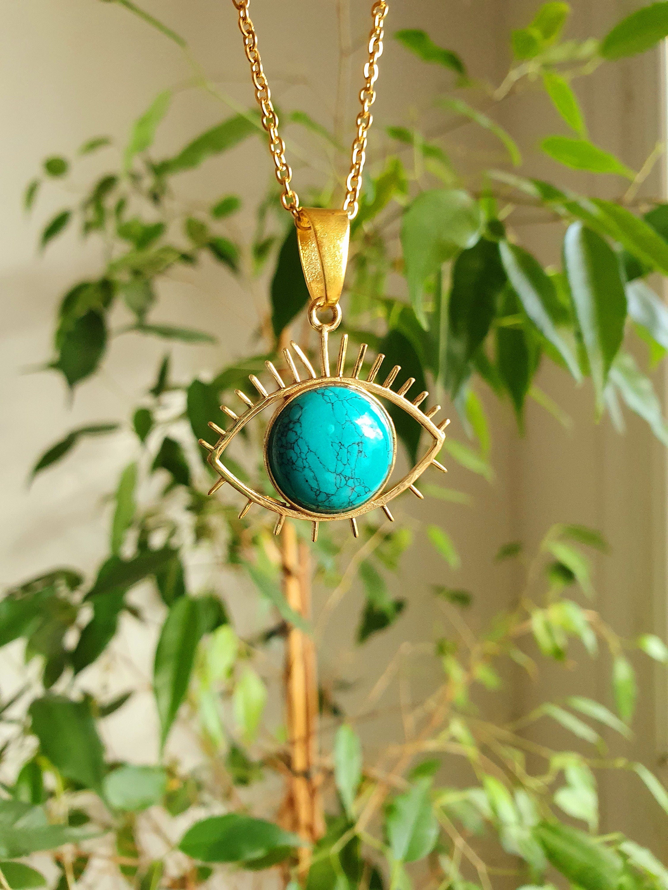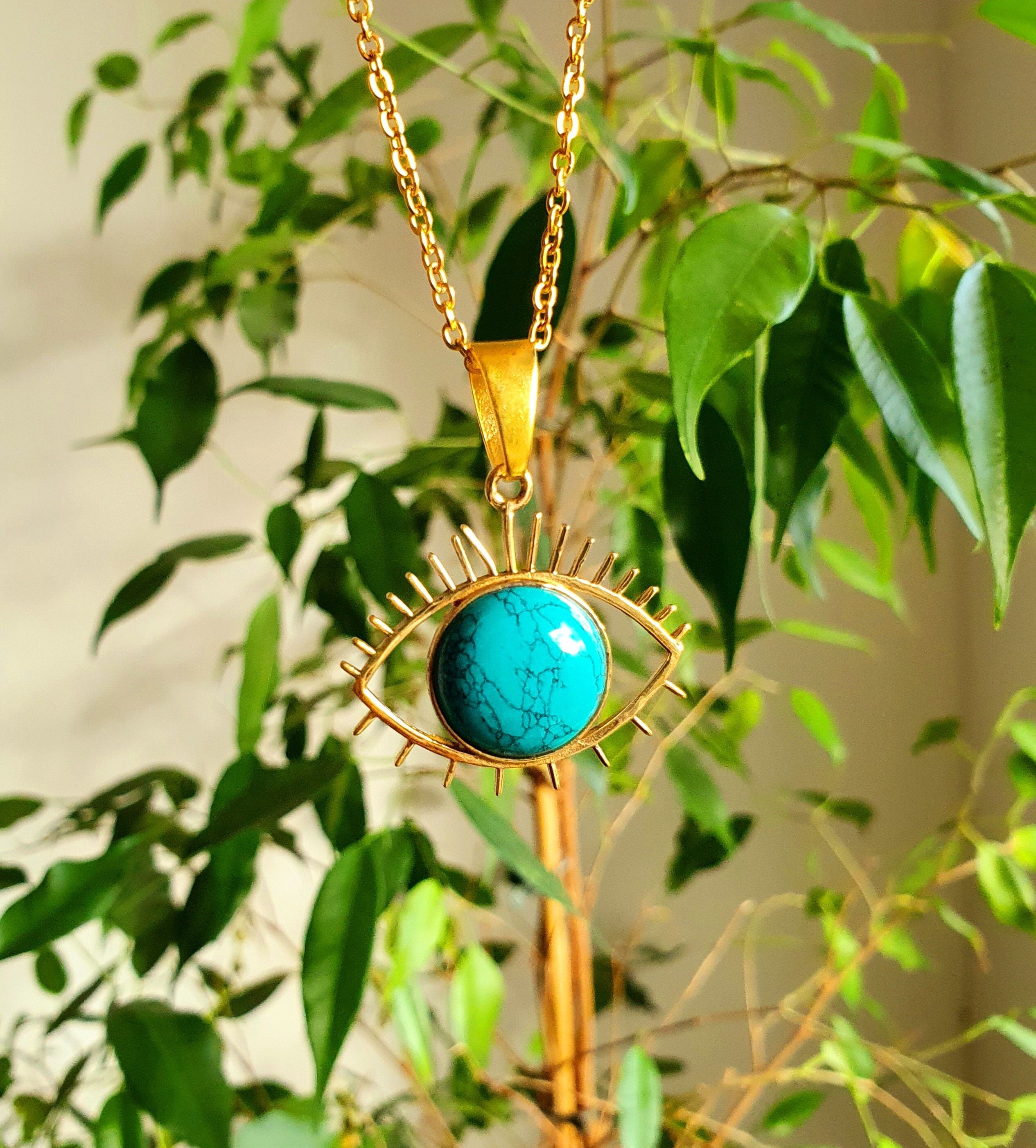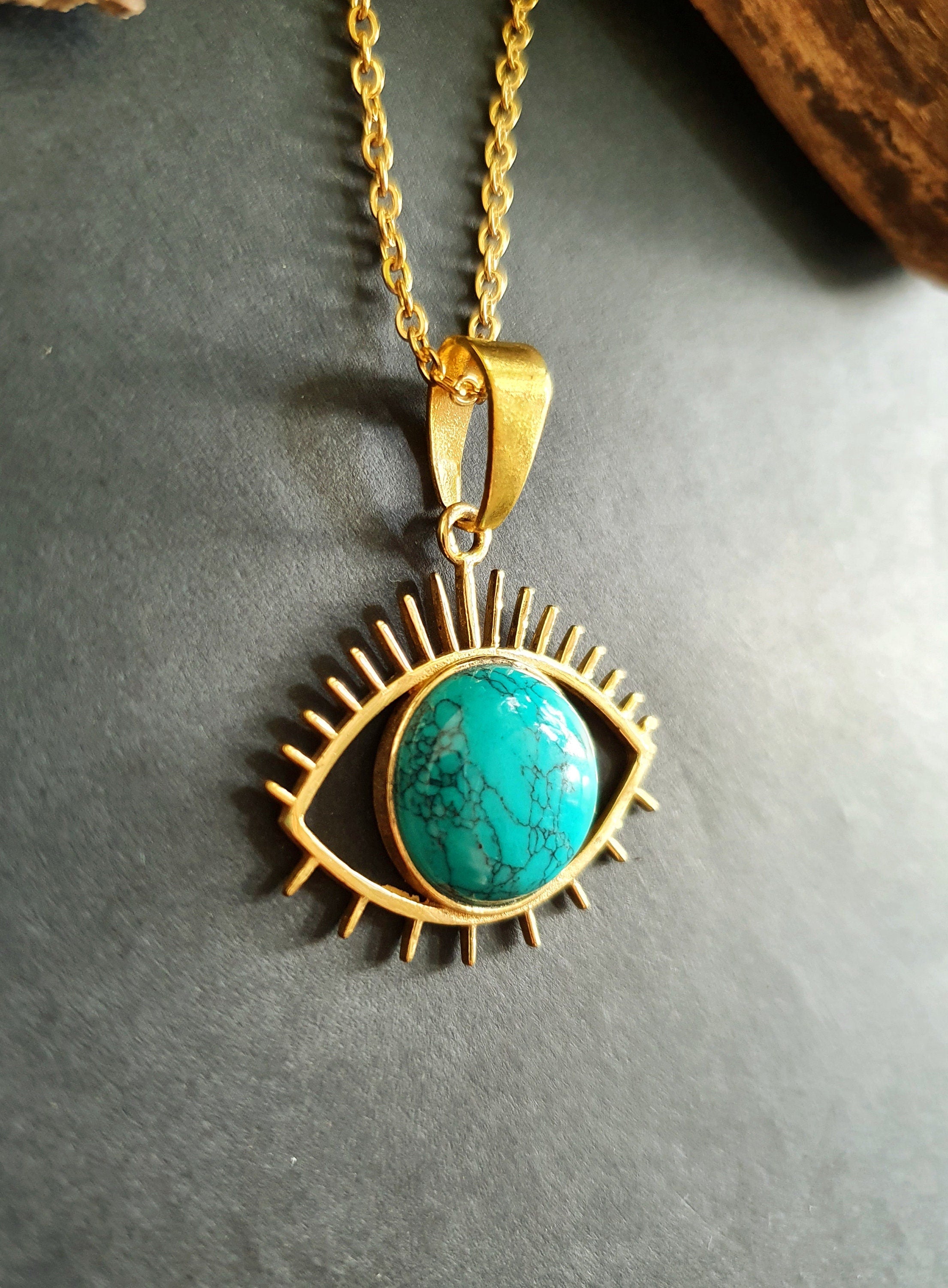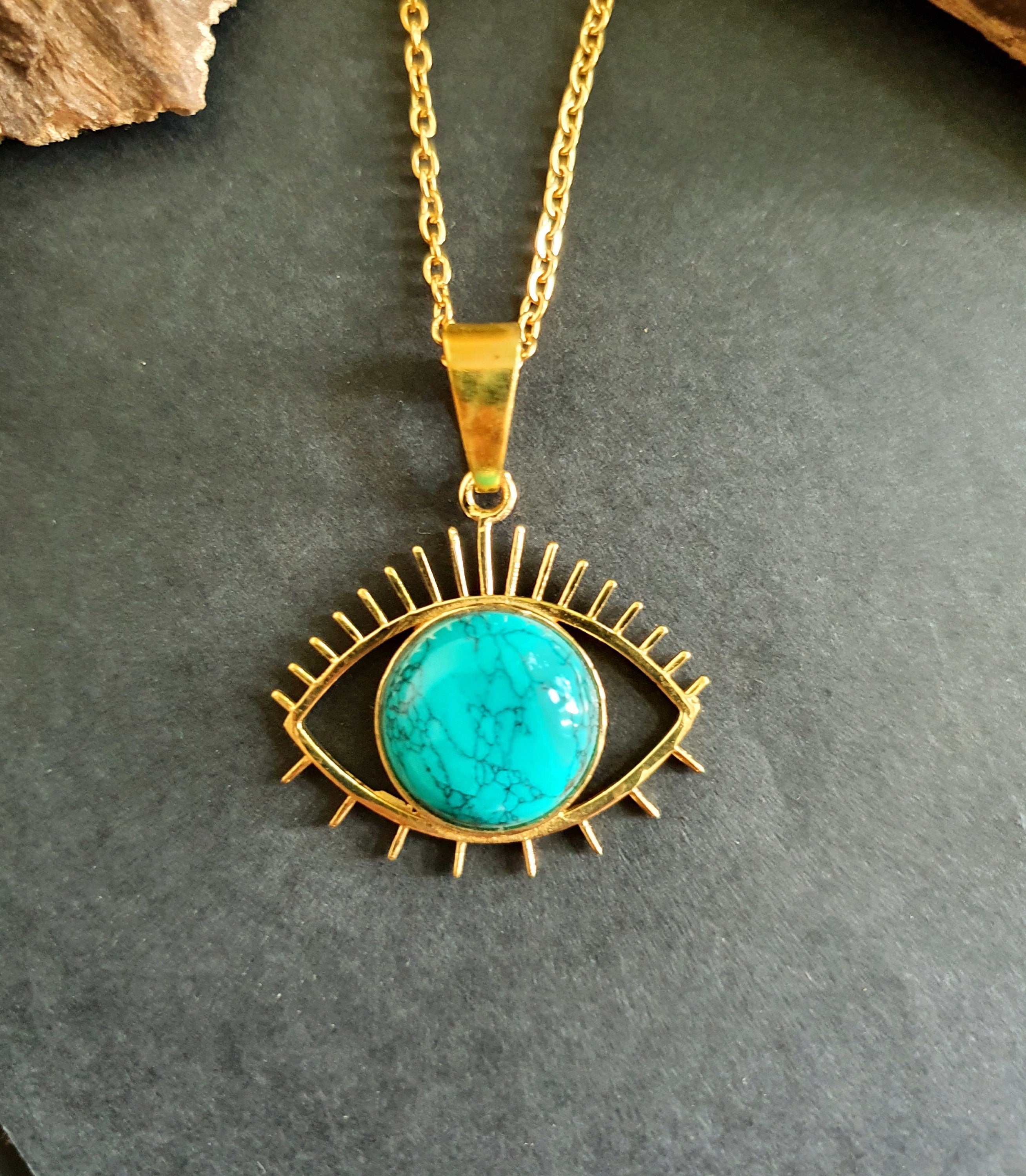 Golden Sacred Eye of Protection necklace with turquoise on stainless steel chain.