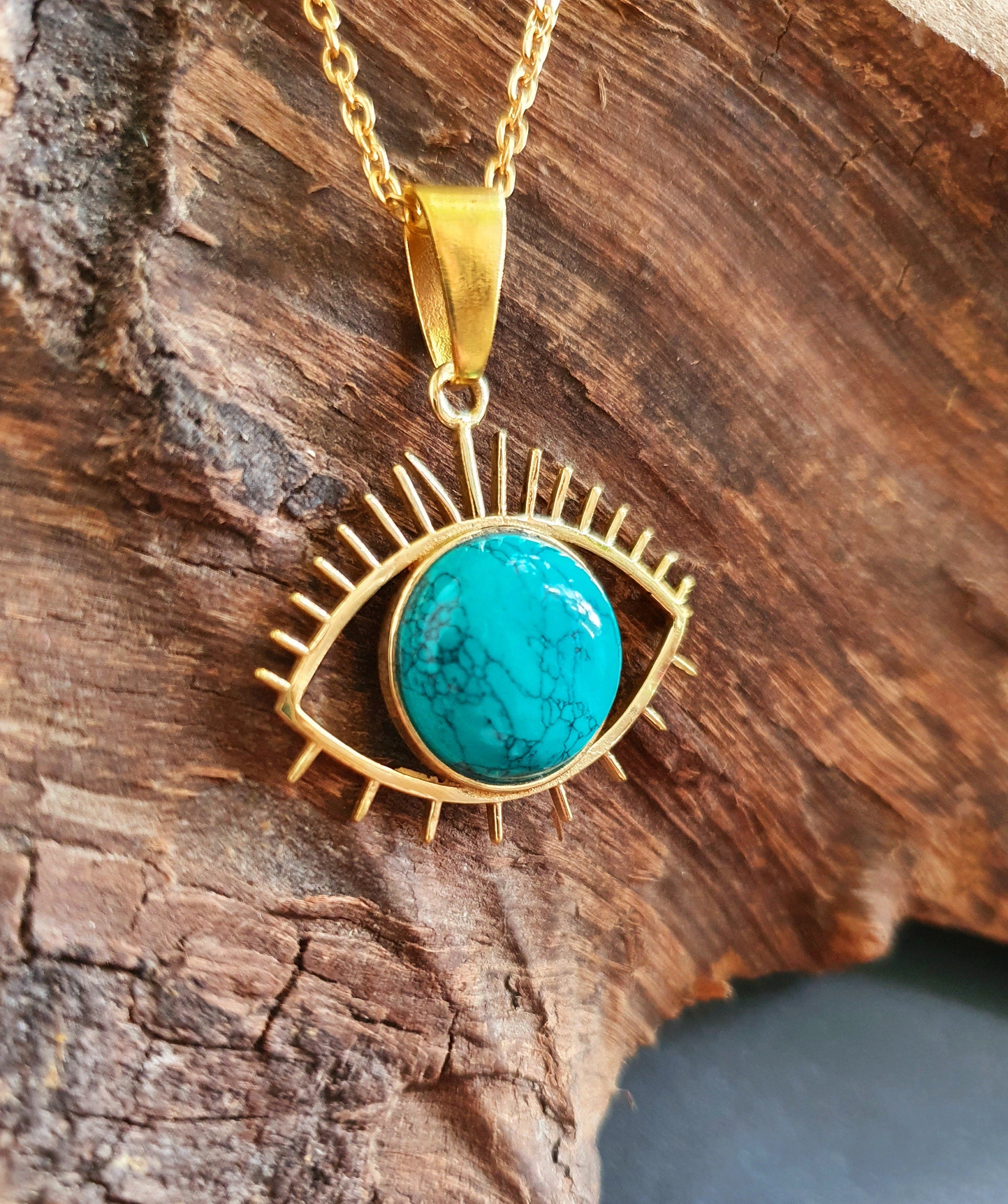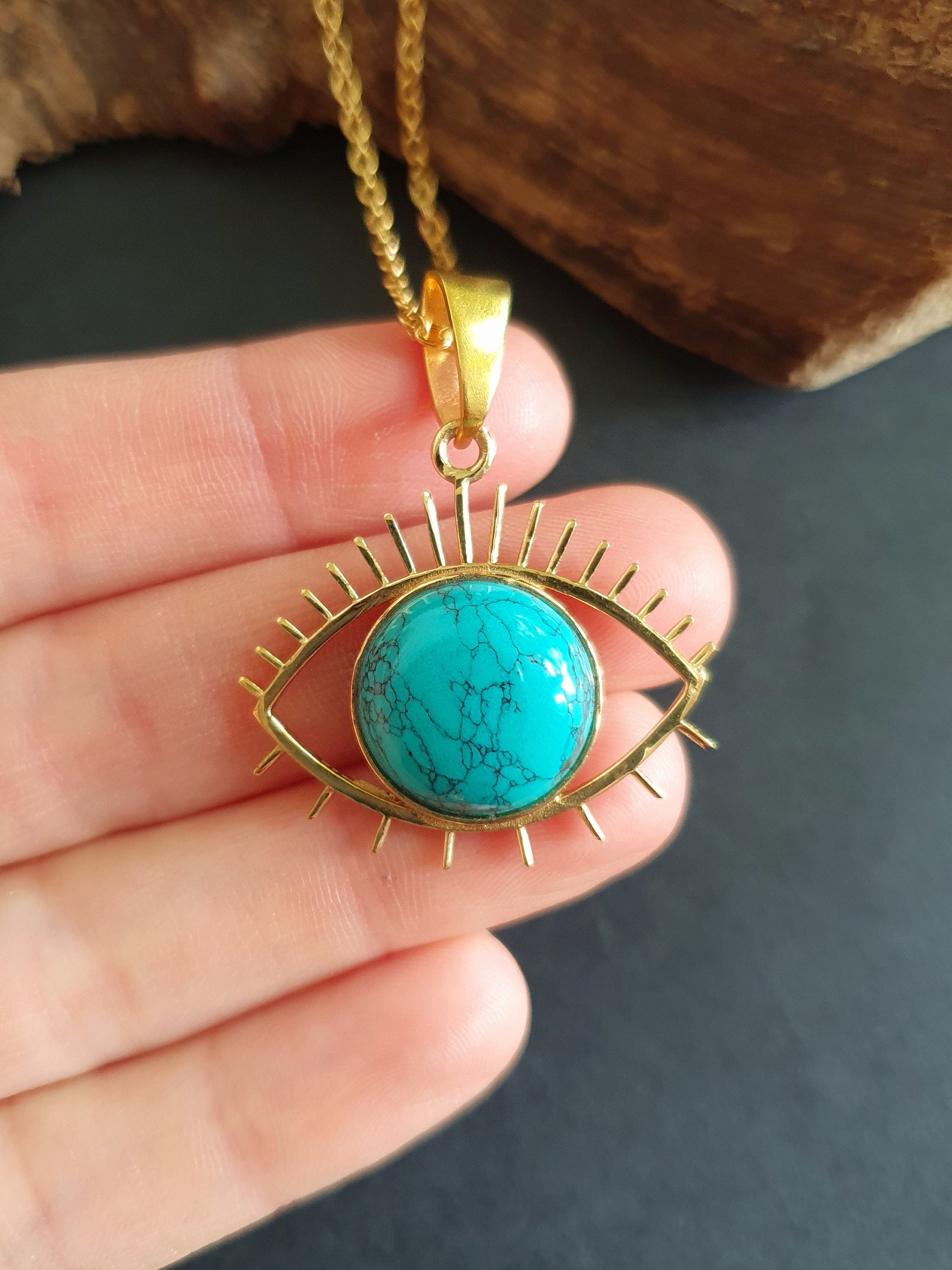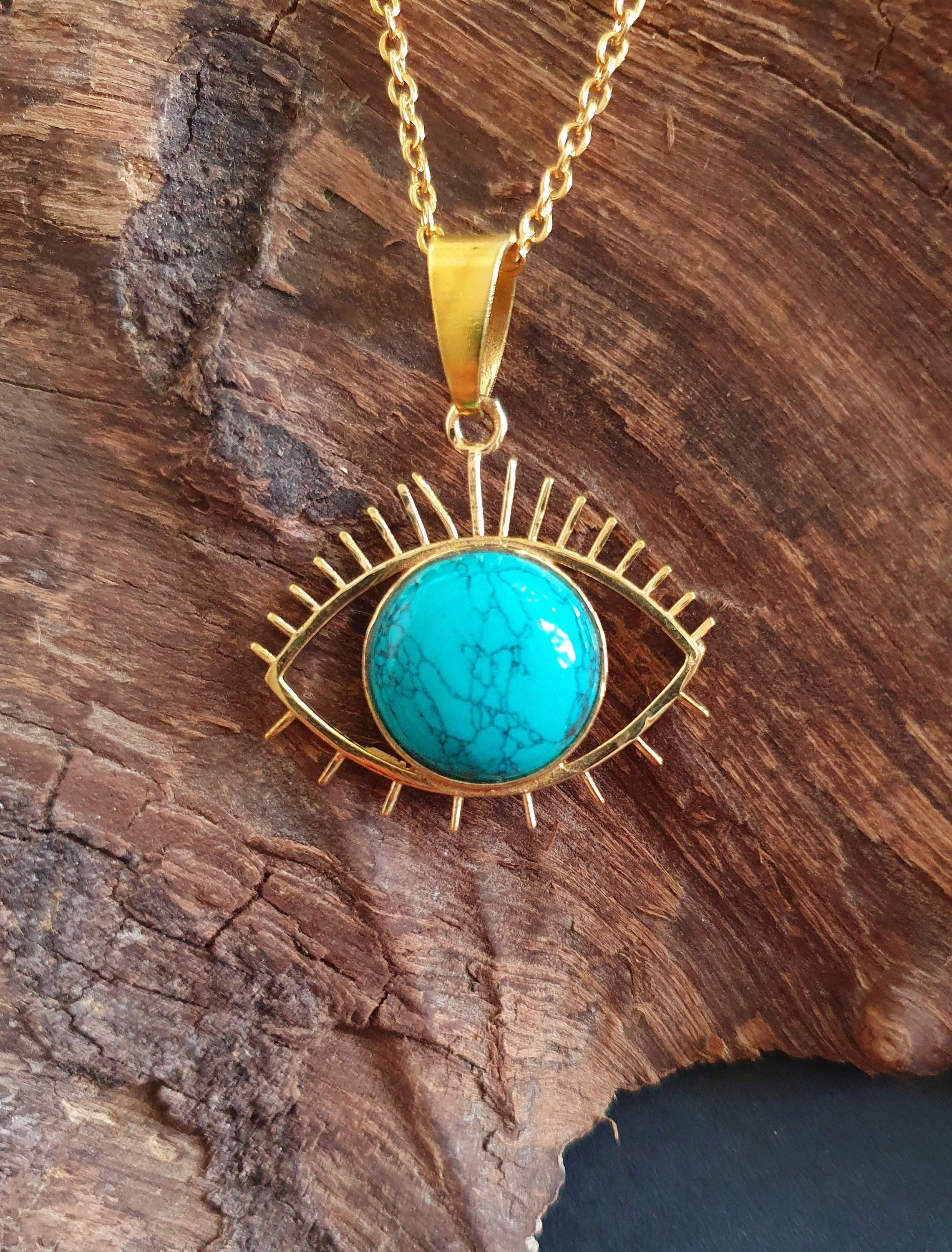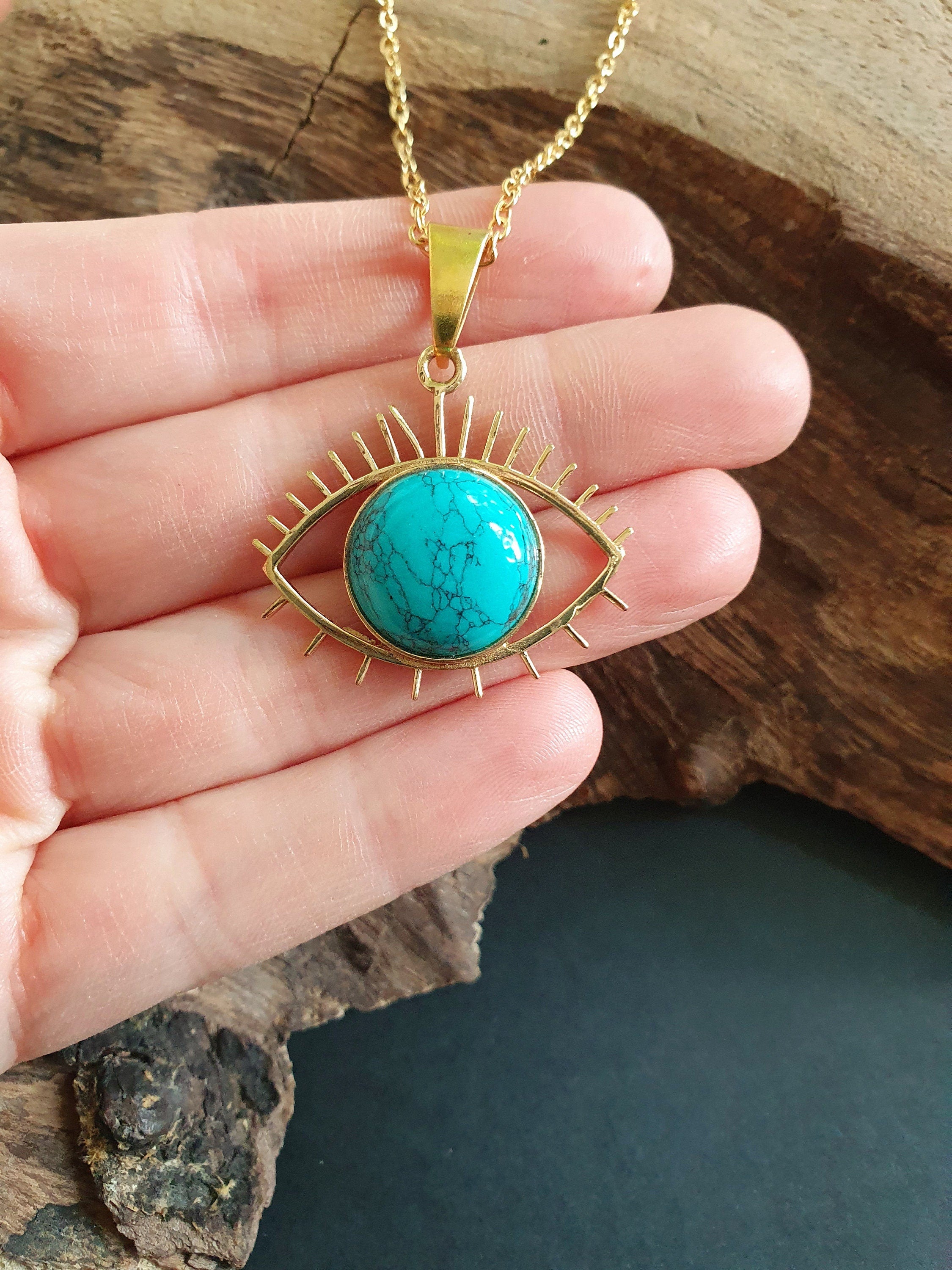 Golden Sacred Eye of Protection necklace with turquoise on stainless steel chain.