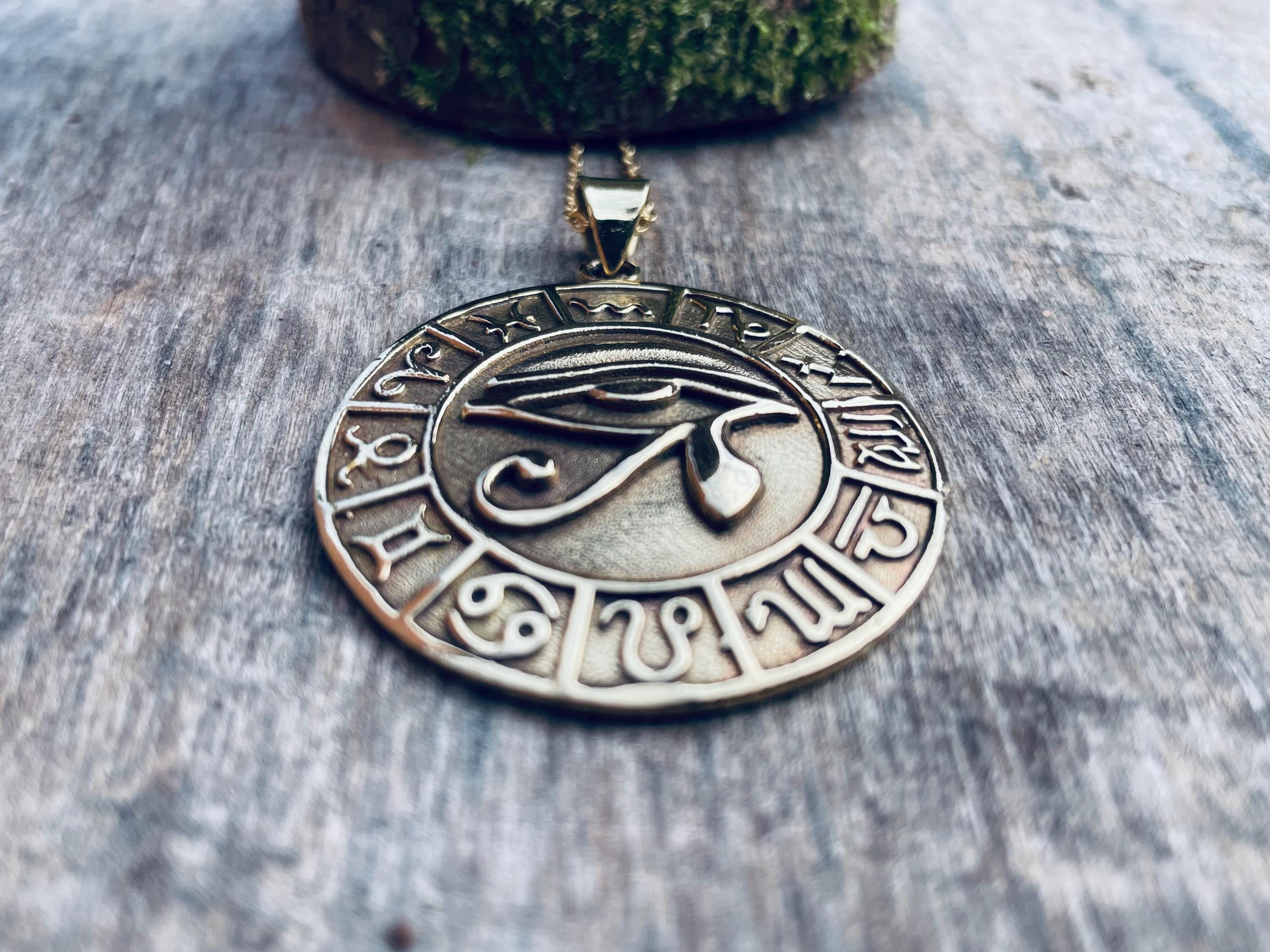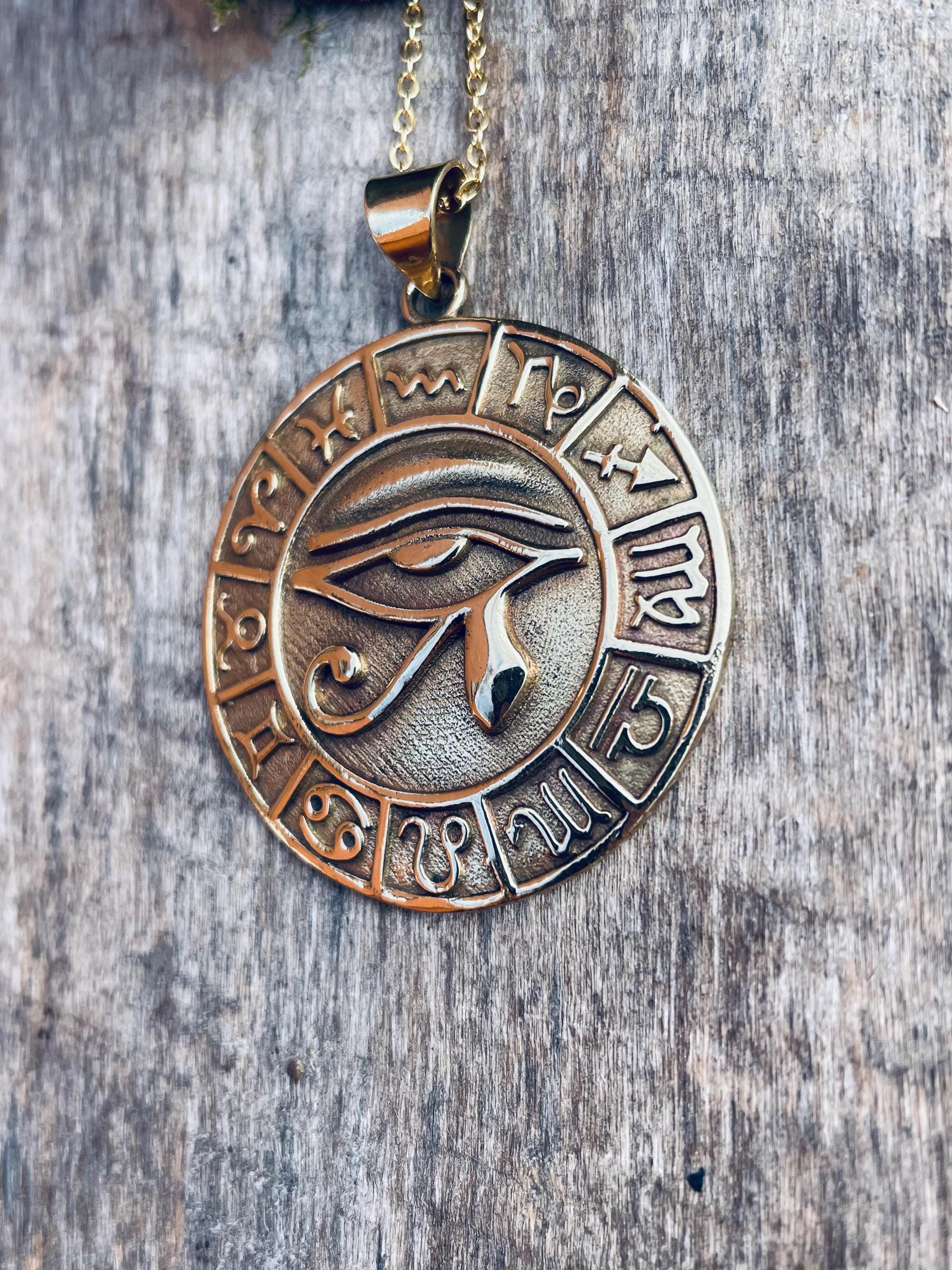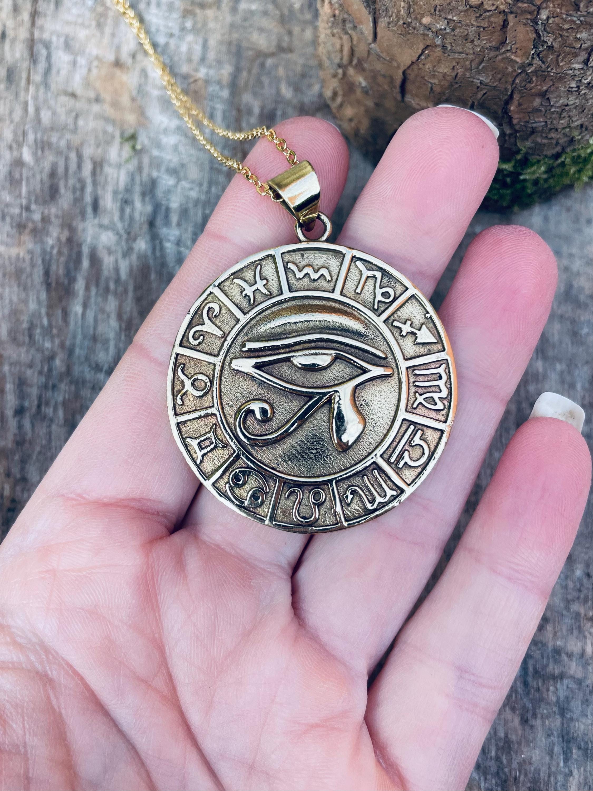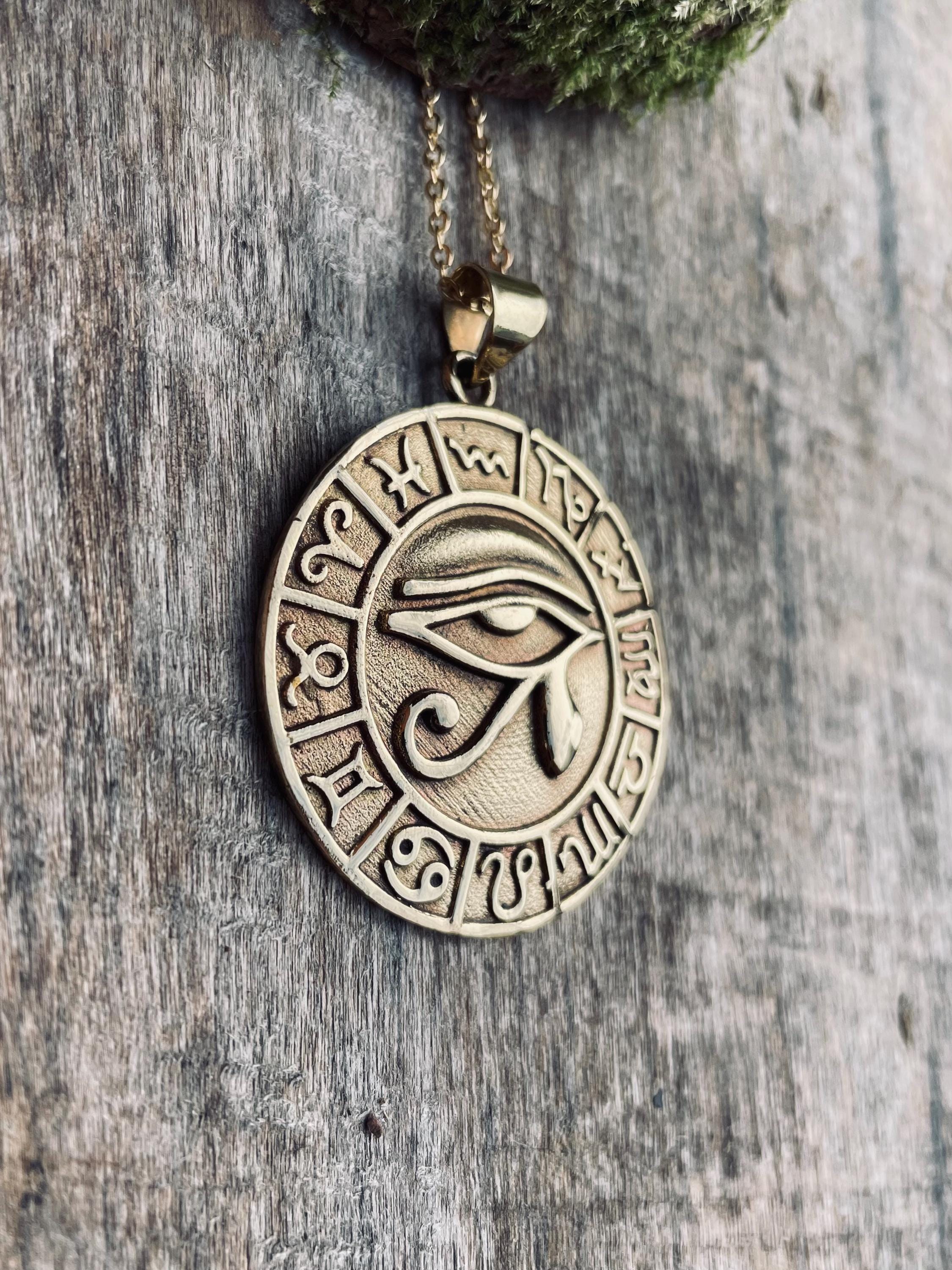Eye of Horus pendant necklace in brass and stainless chain (optional).