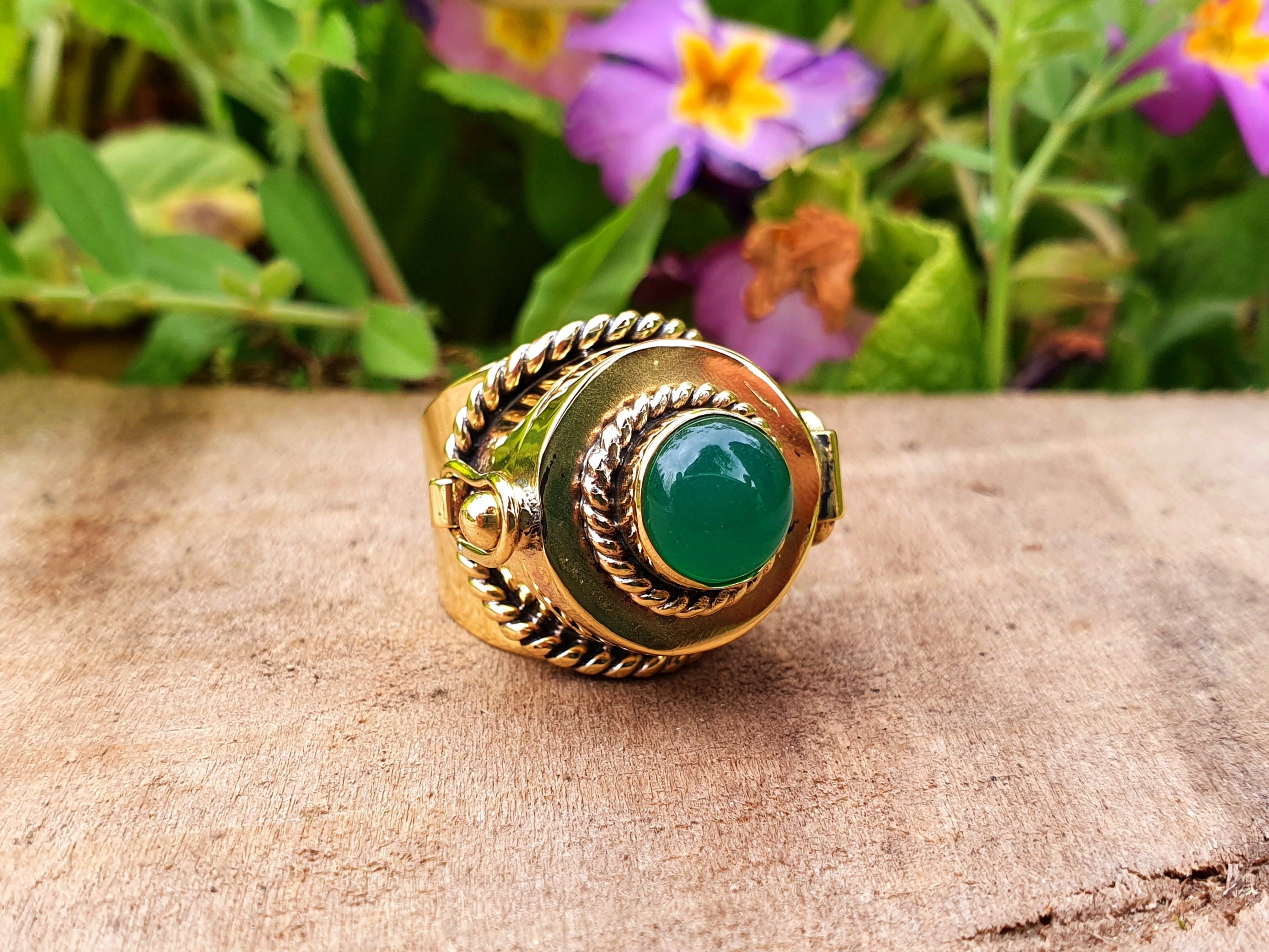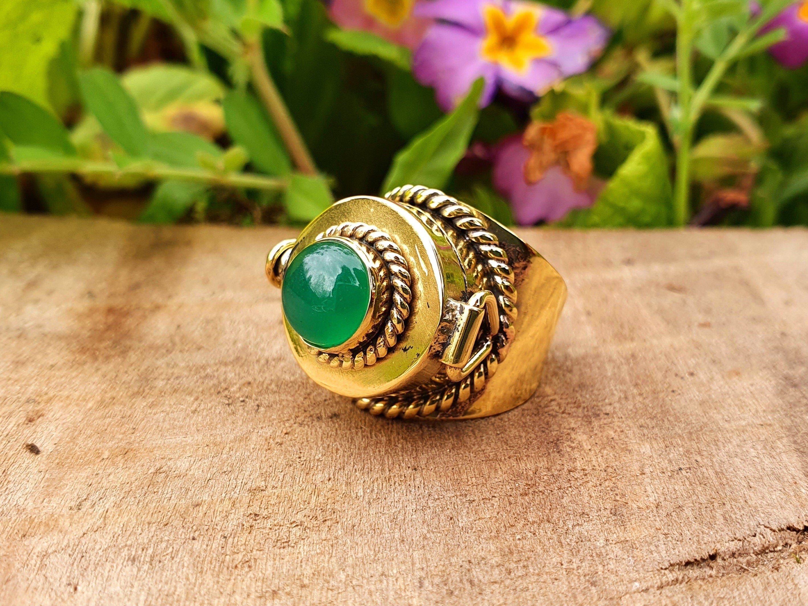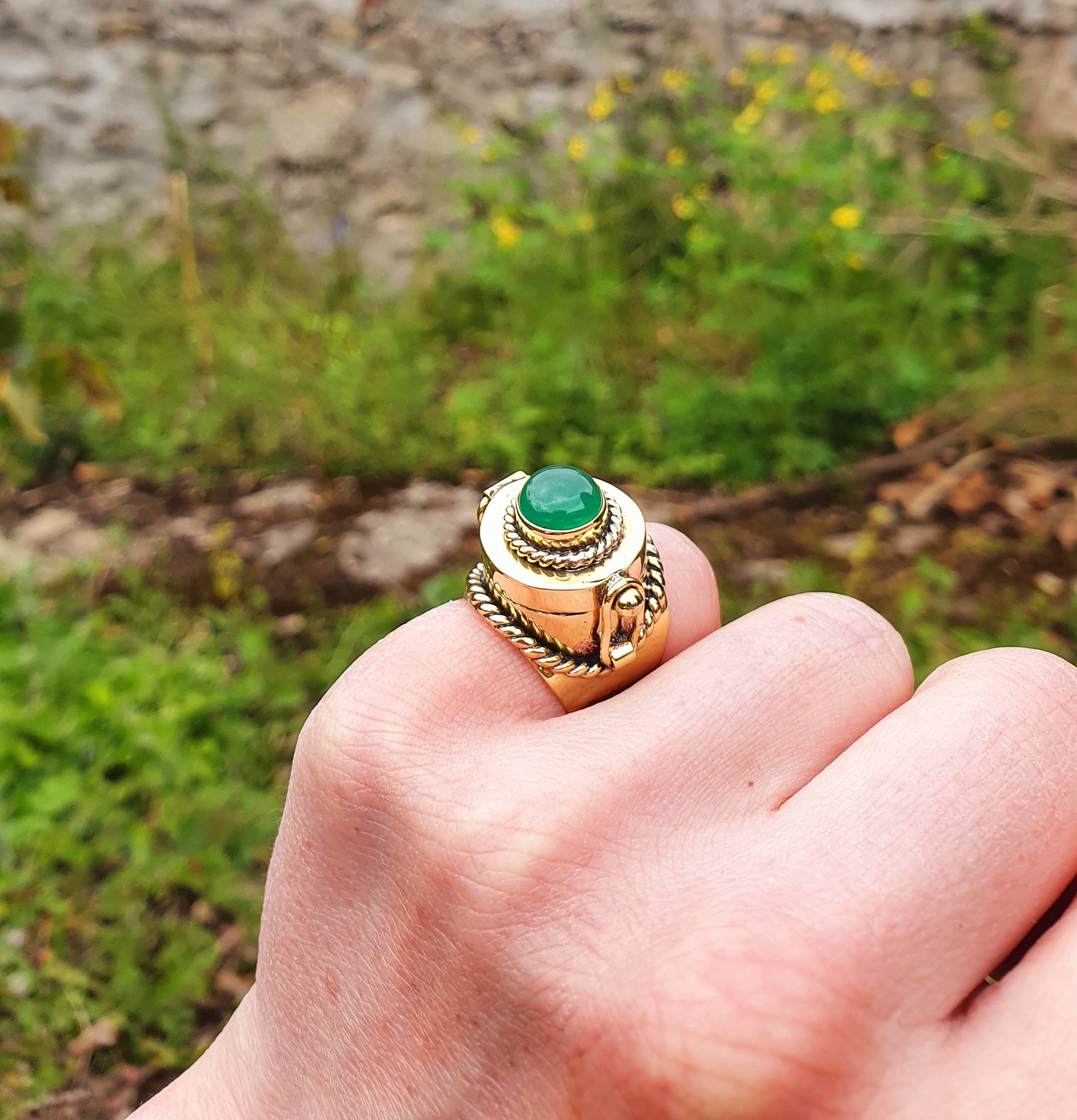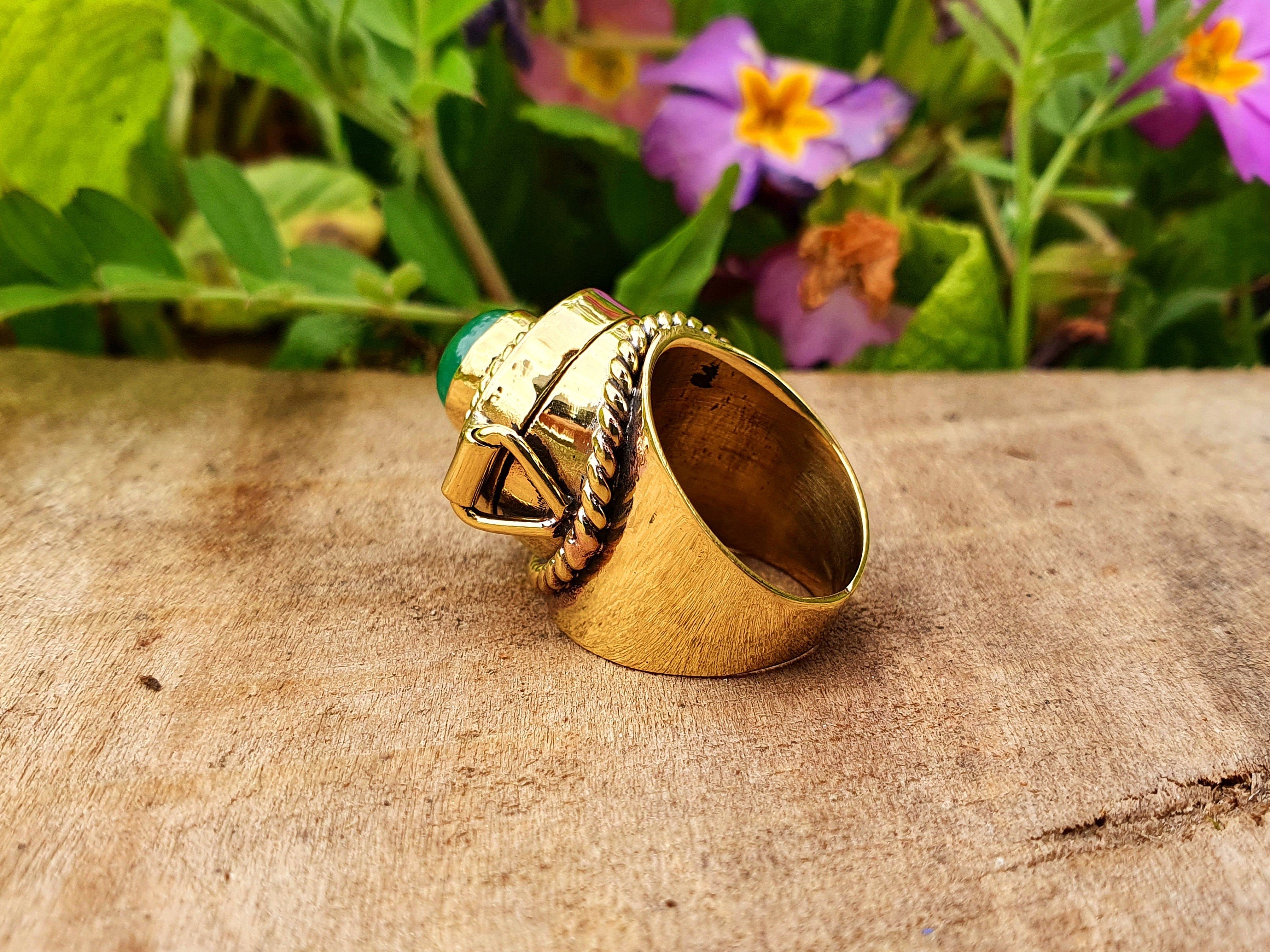 Gold Poison ring in brass and green onyx.