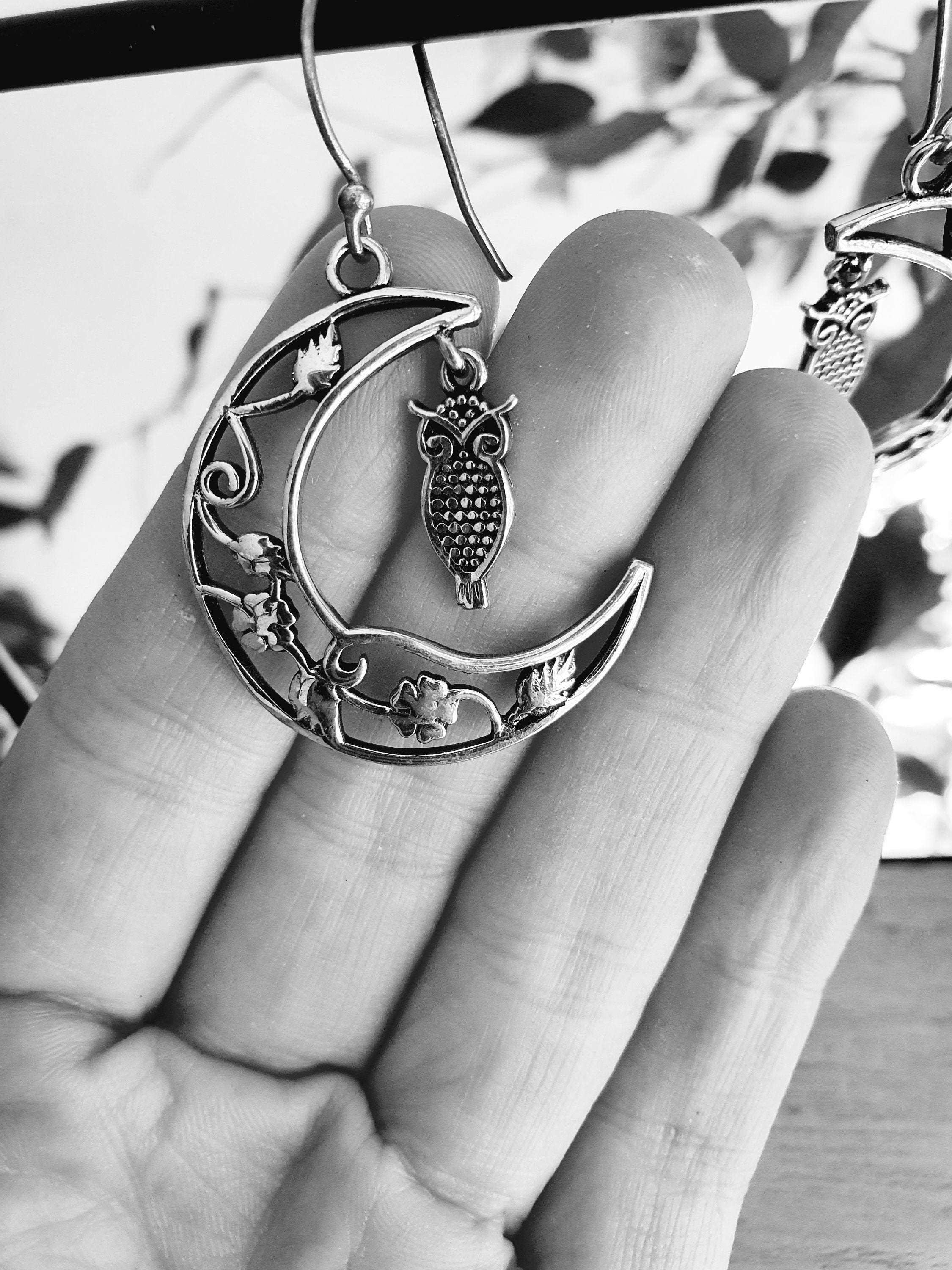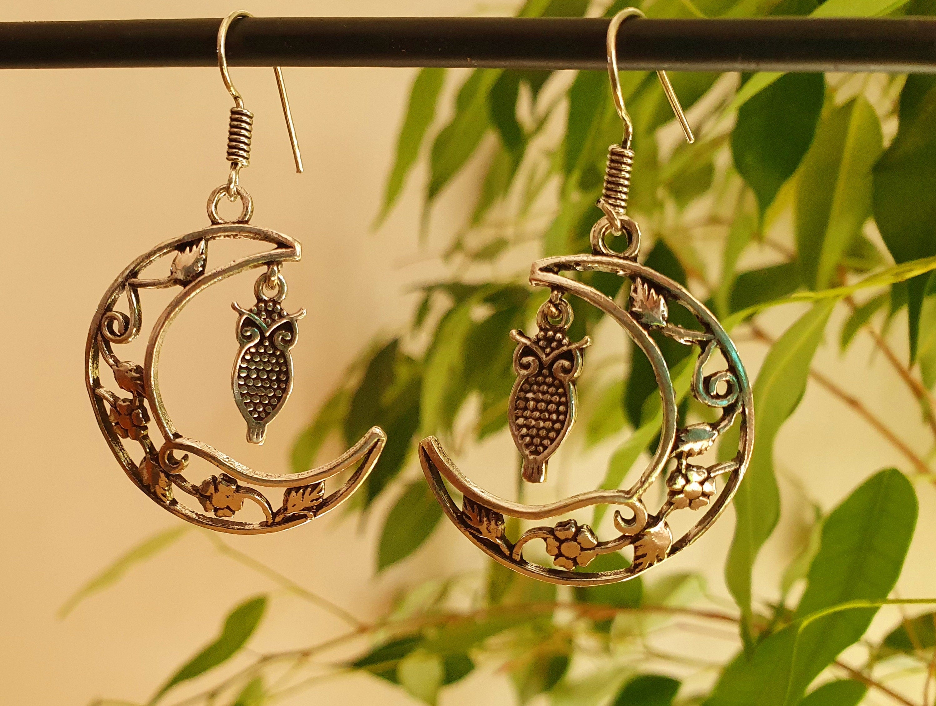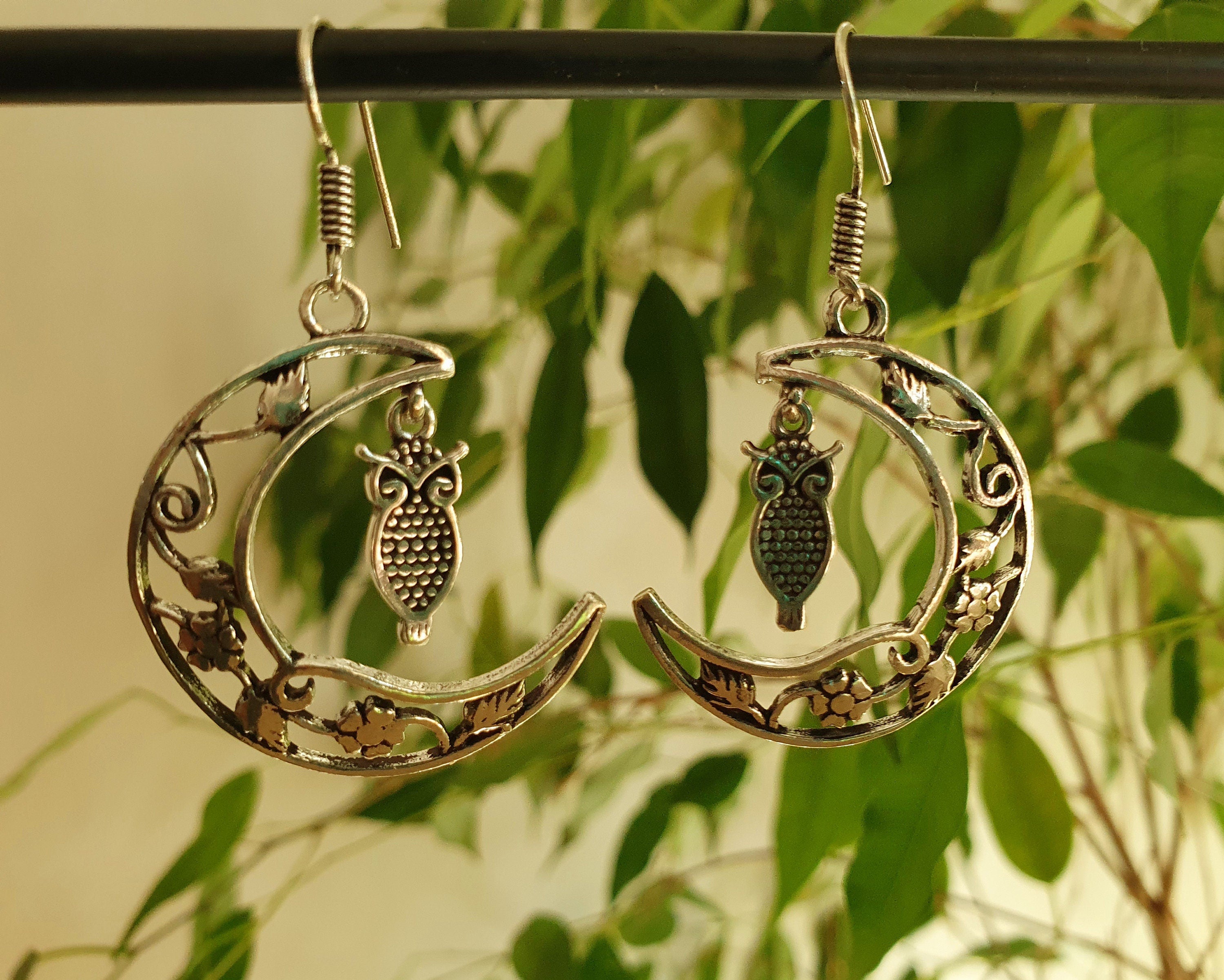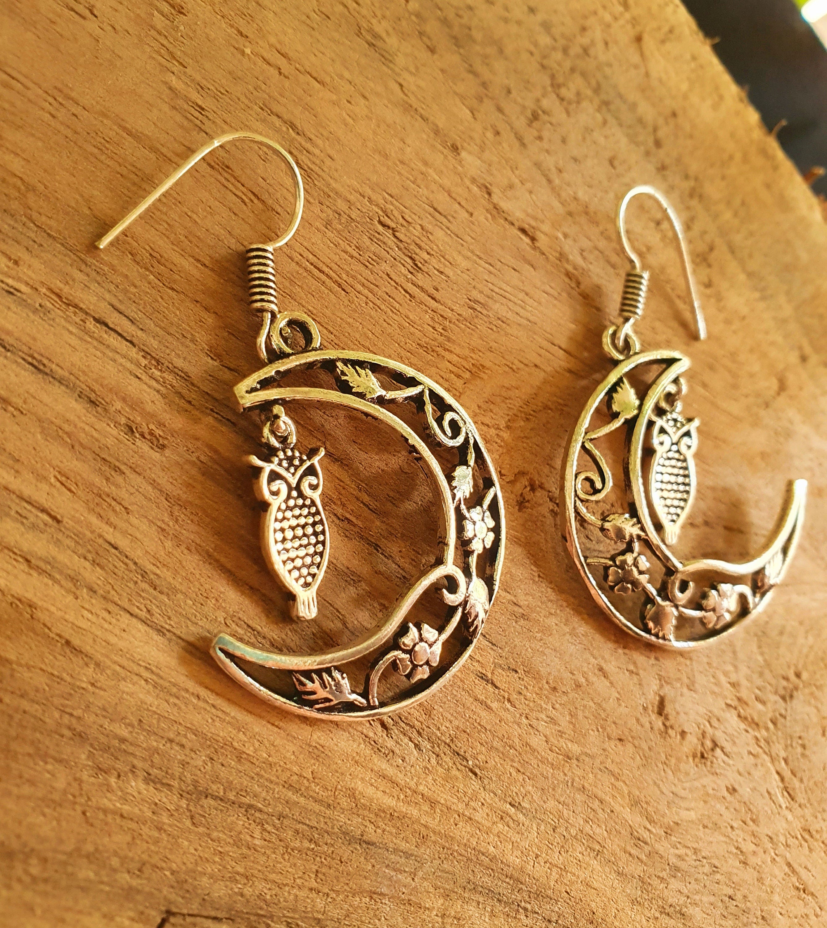 Owl In the Moon Dangle Silver Earrings