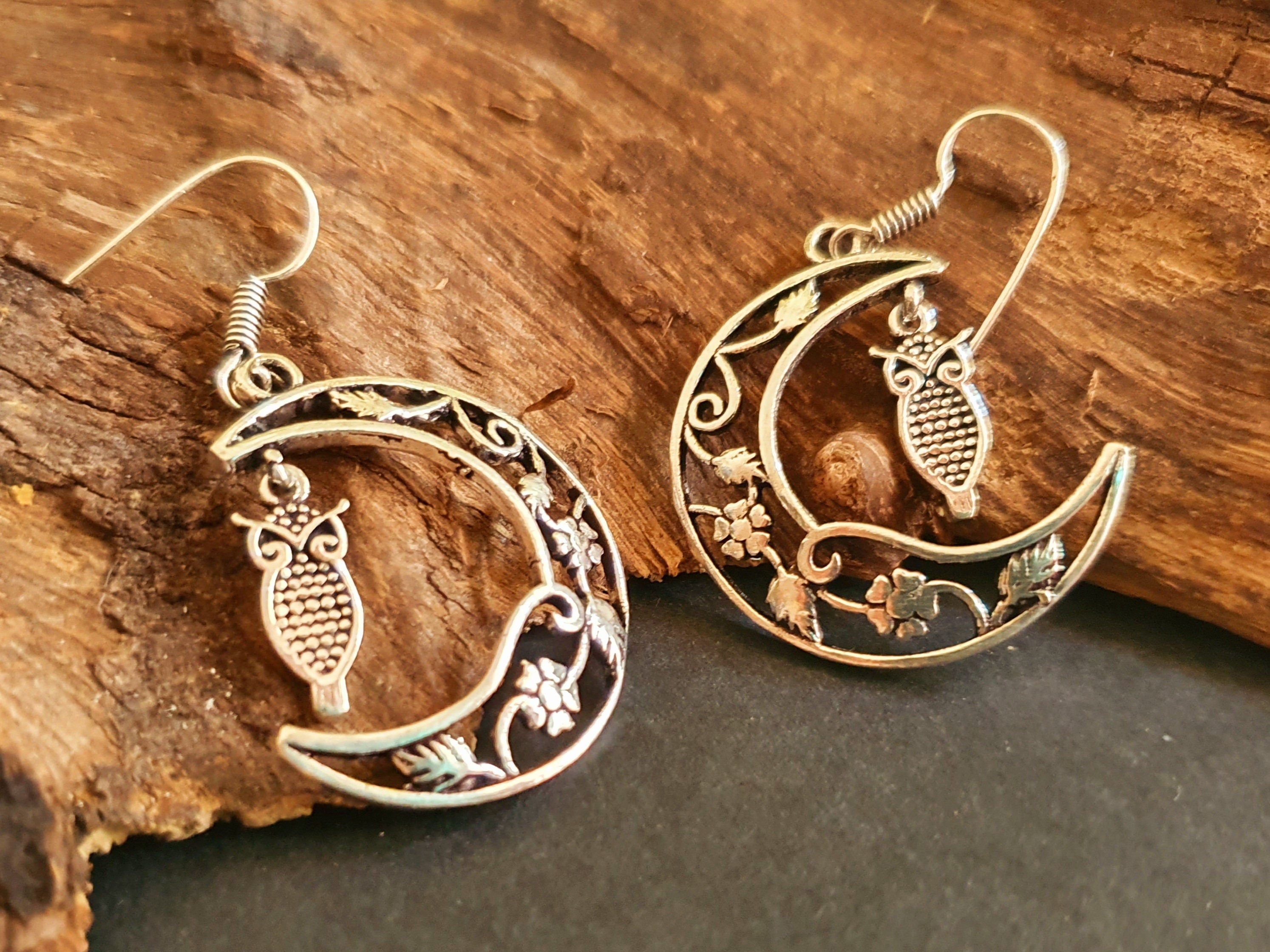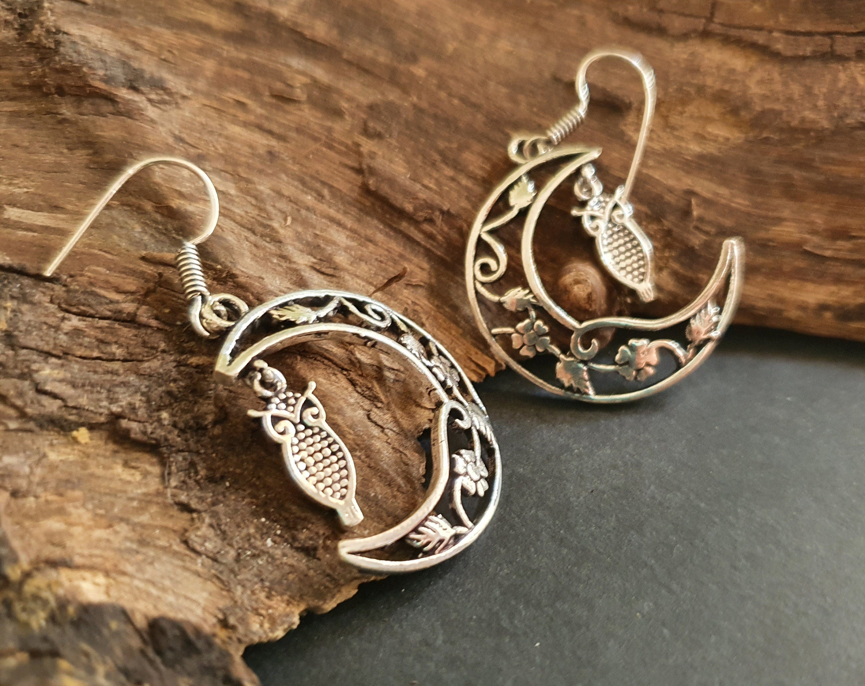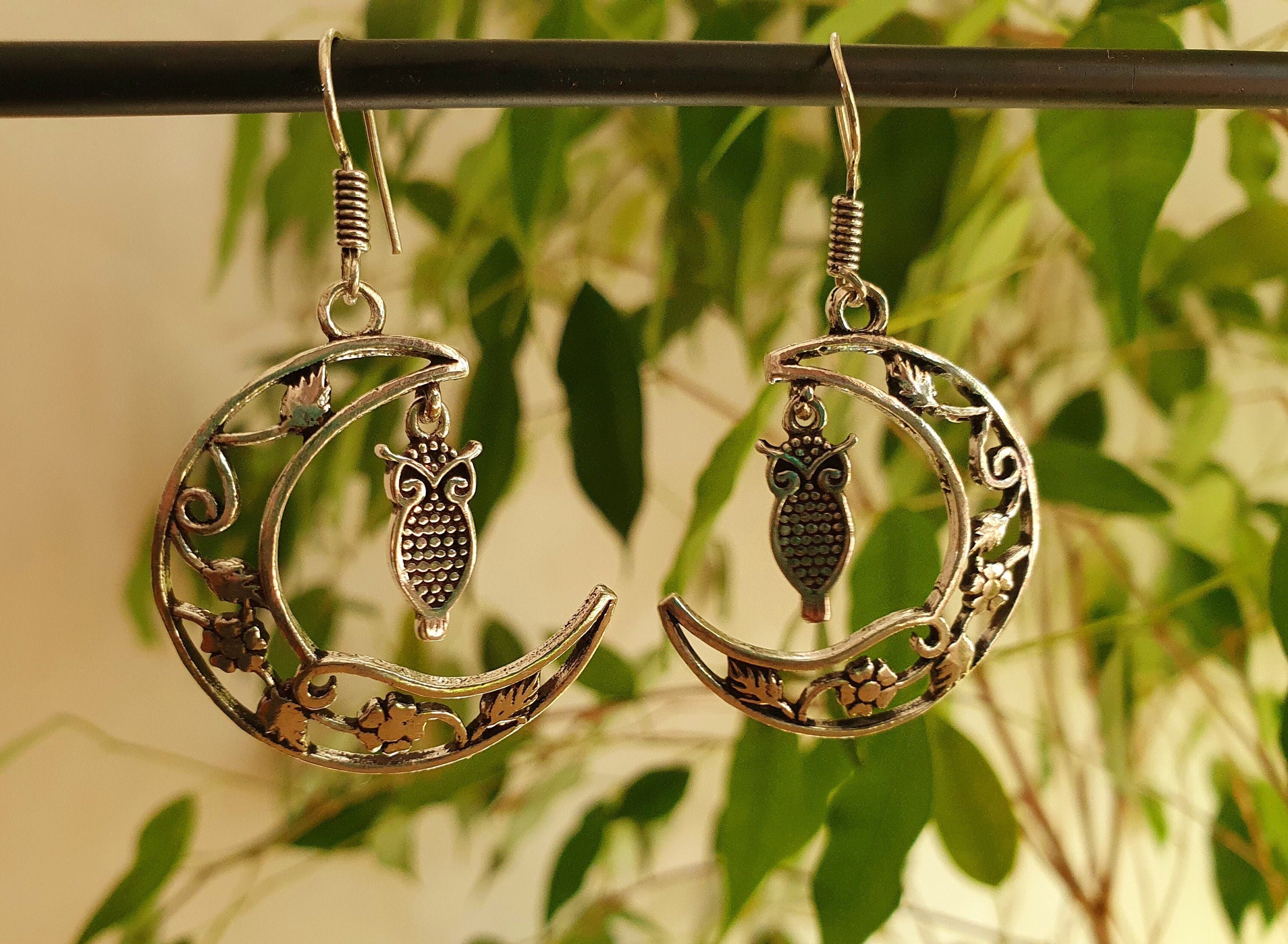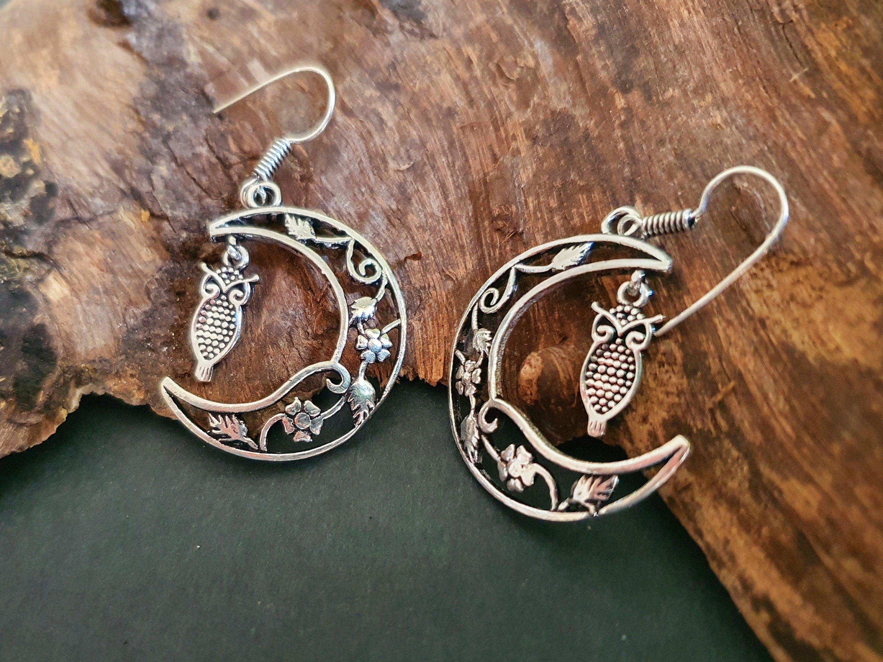 Owl In the Moon Dangle Silver Earrings