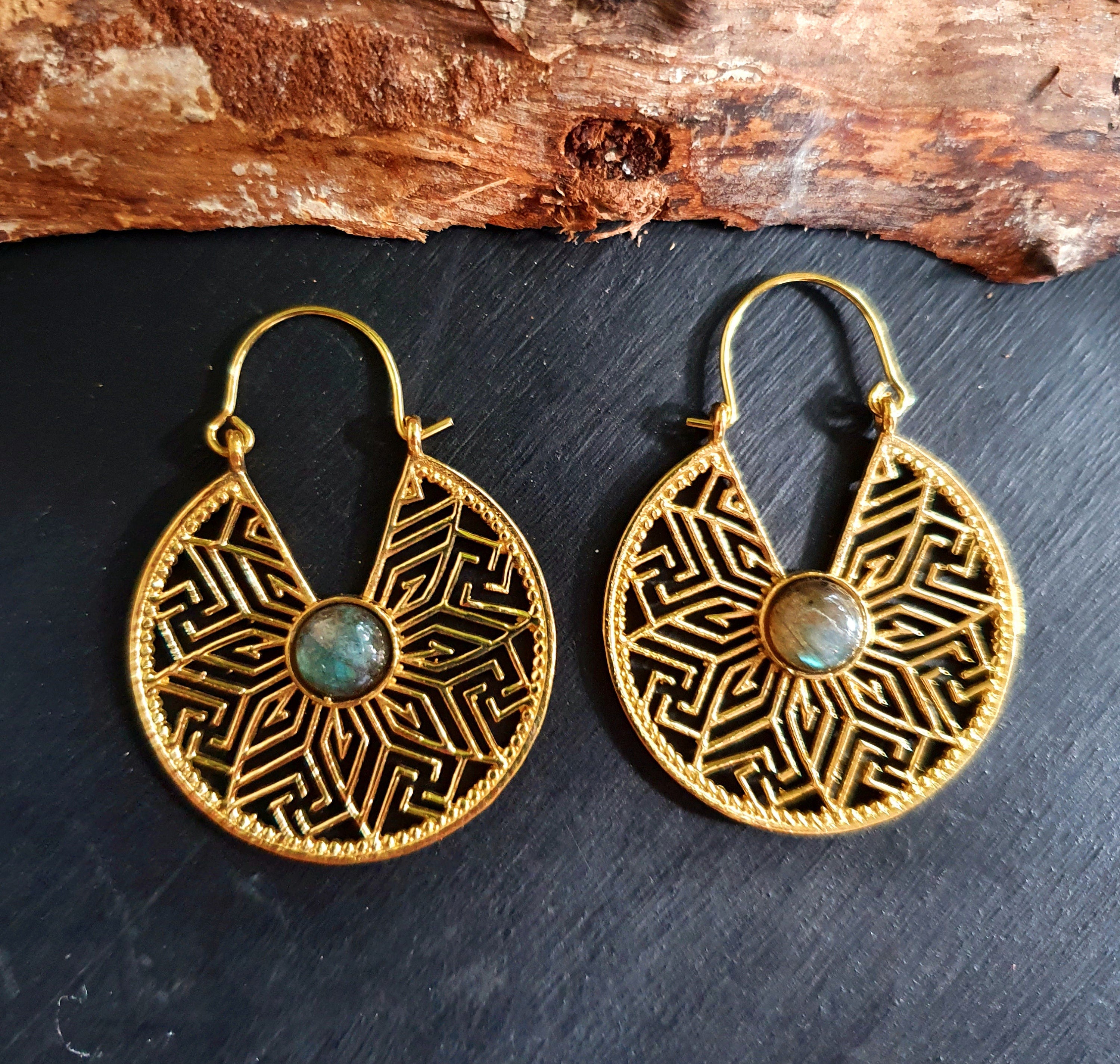 Aztec Hoop Earrings in Brass with Labradorite | Boho Jewellery for Women | Spiritual Ethnic Hoops