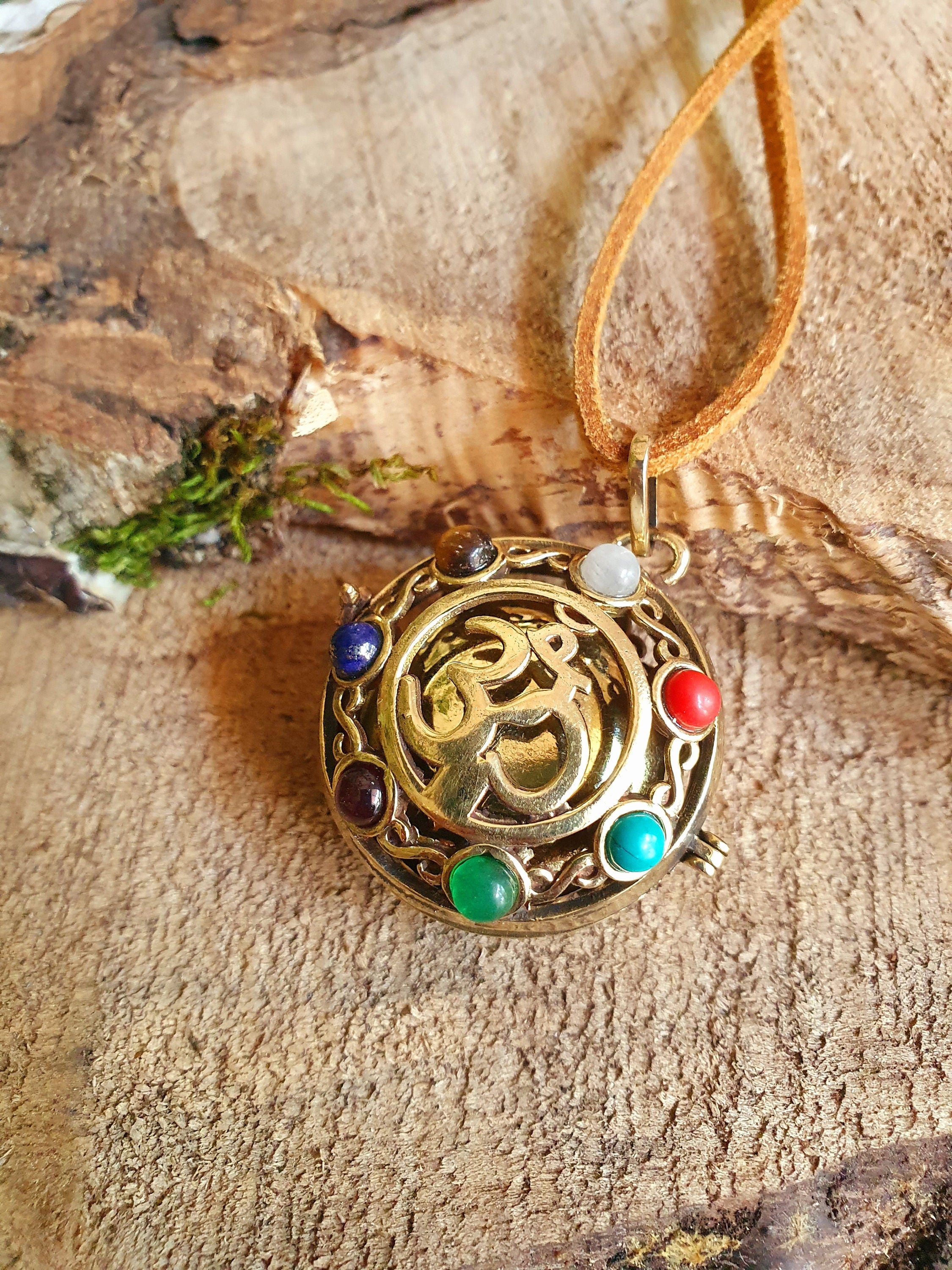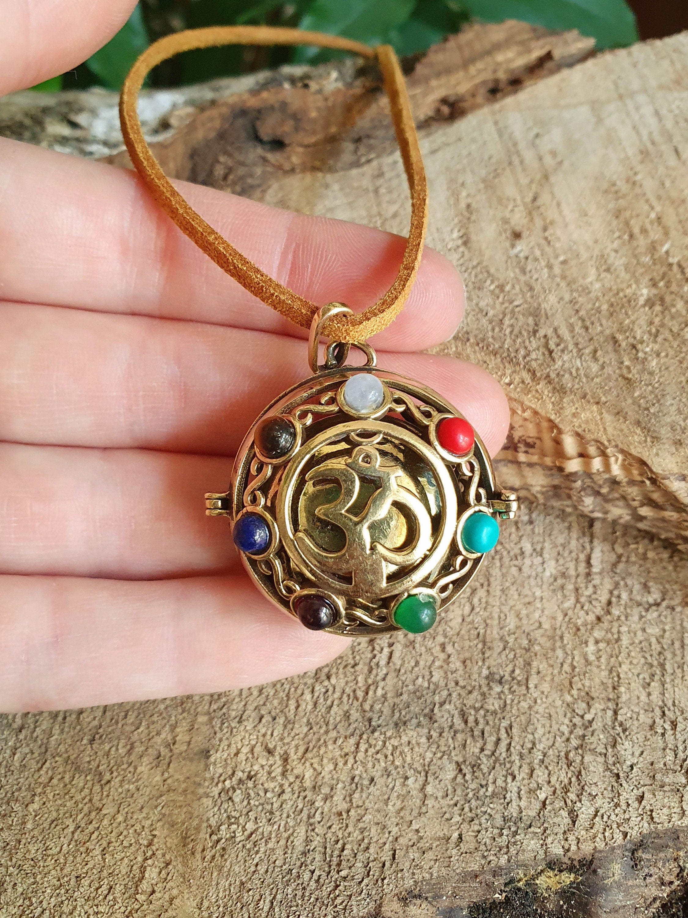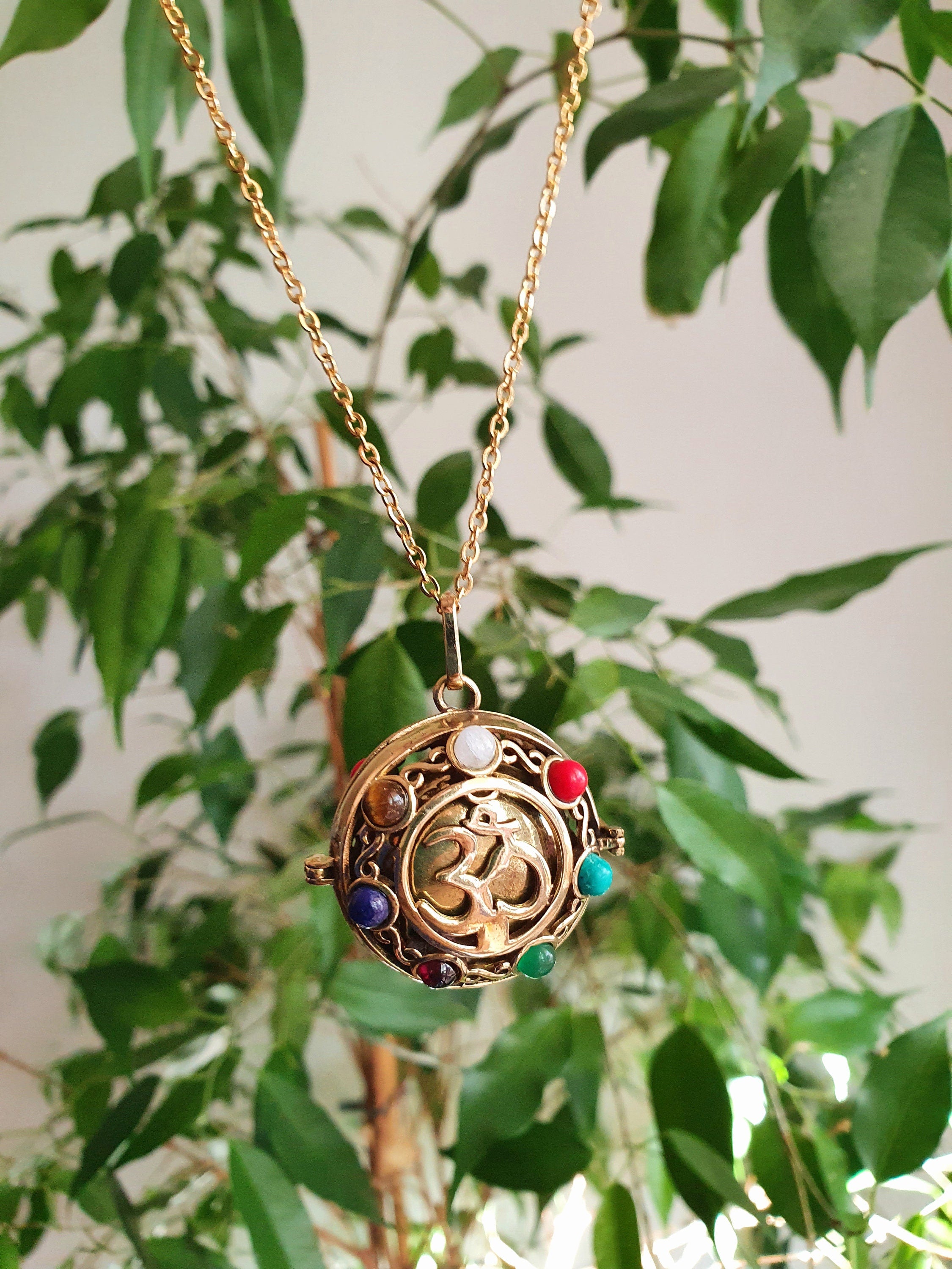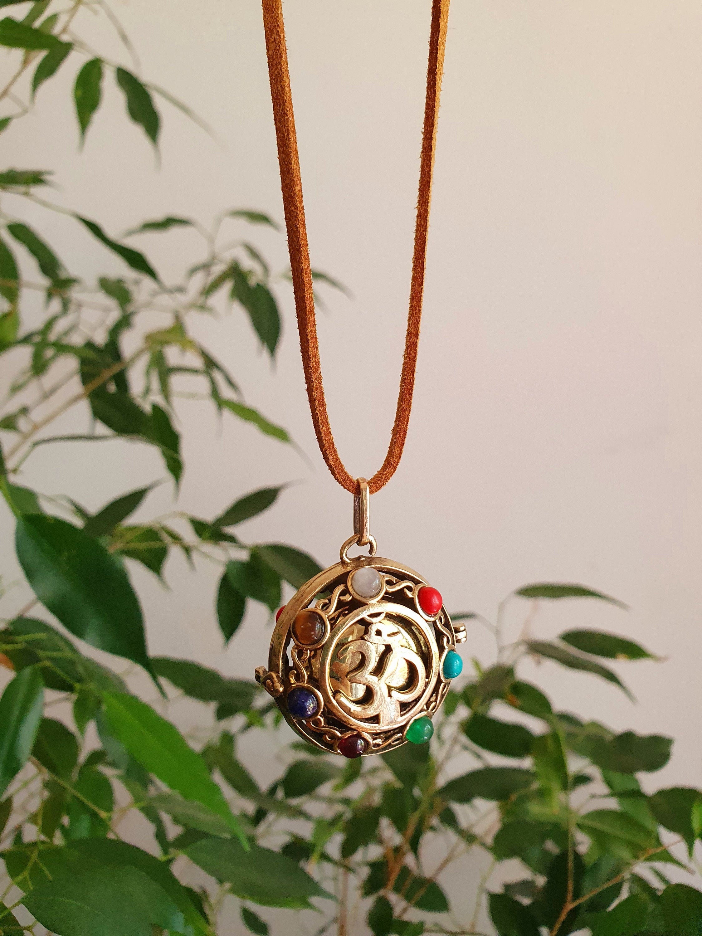 Stunning brass 'Ohm Shanti' Golden Bola necklace with Chakras 7 stones; turquoise, red garnet, lapis lazuli, moonstone, rose quartz, amethyst and green onyx, on either golden stainless steel chain or faux leather suede cord.