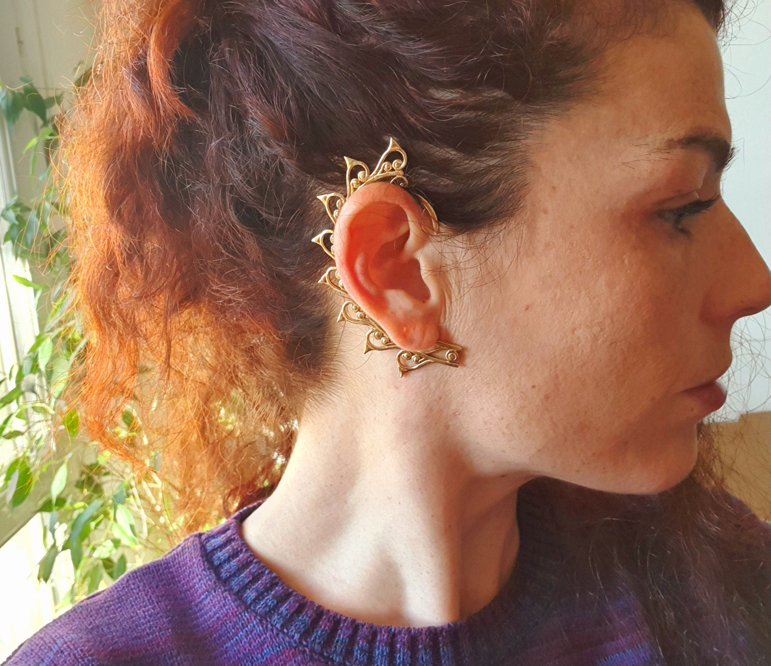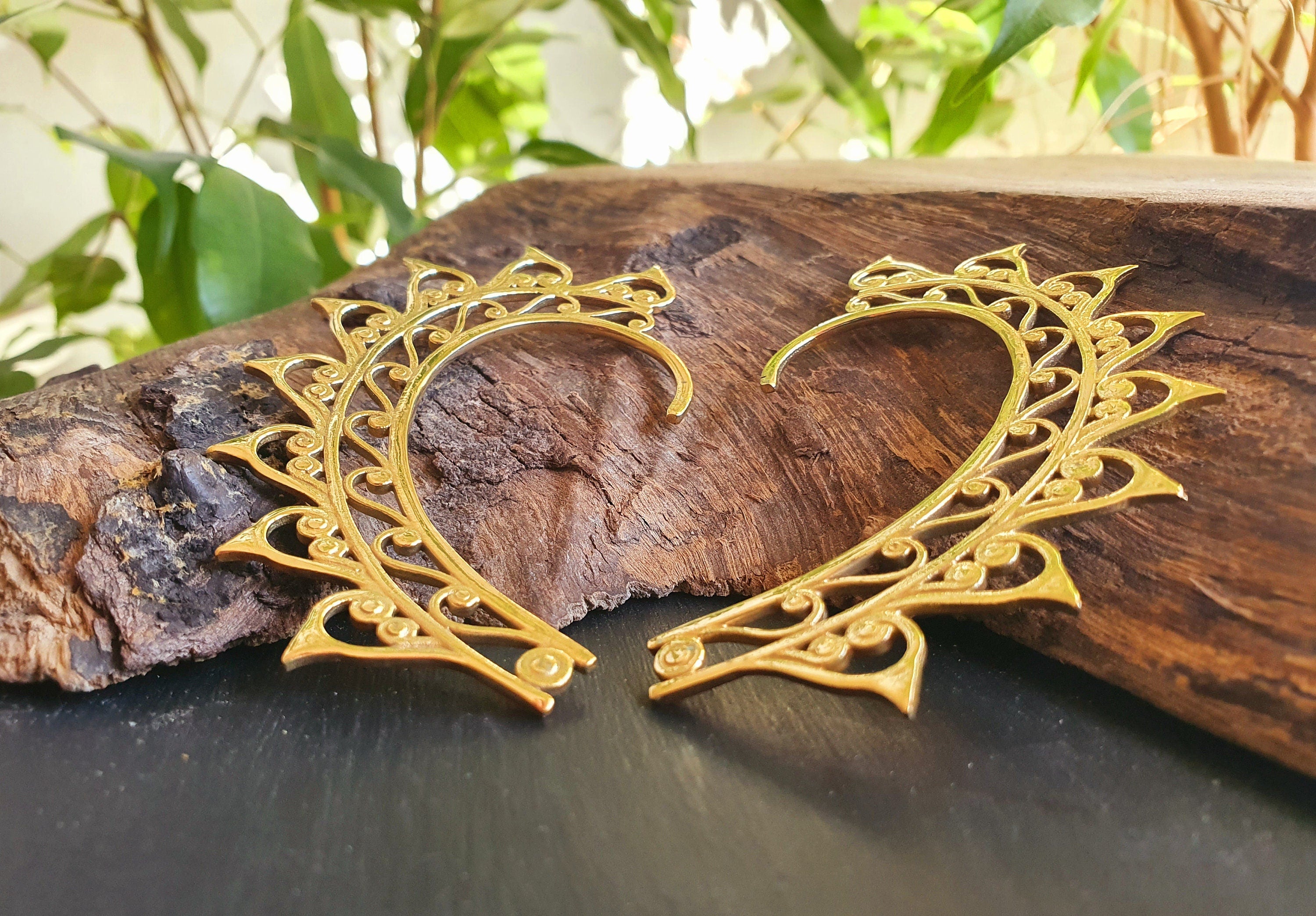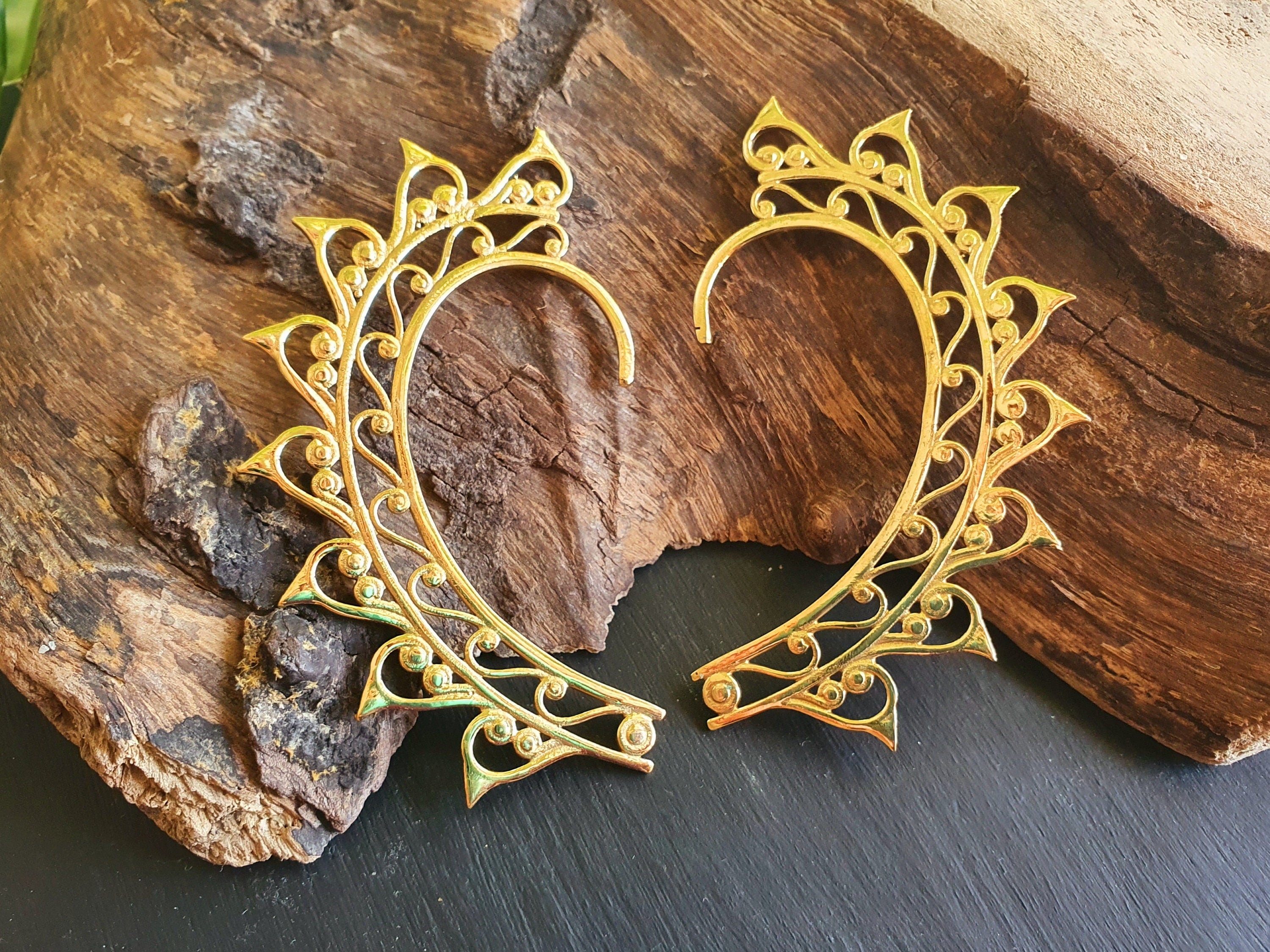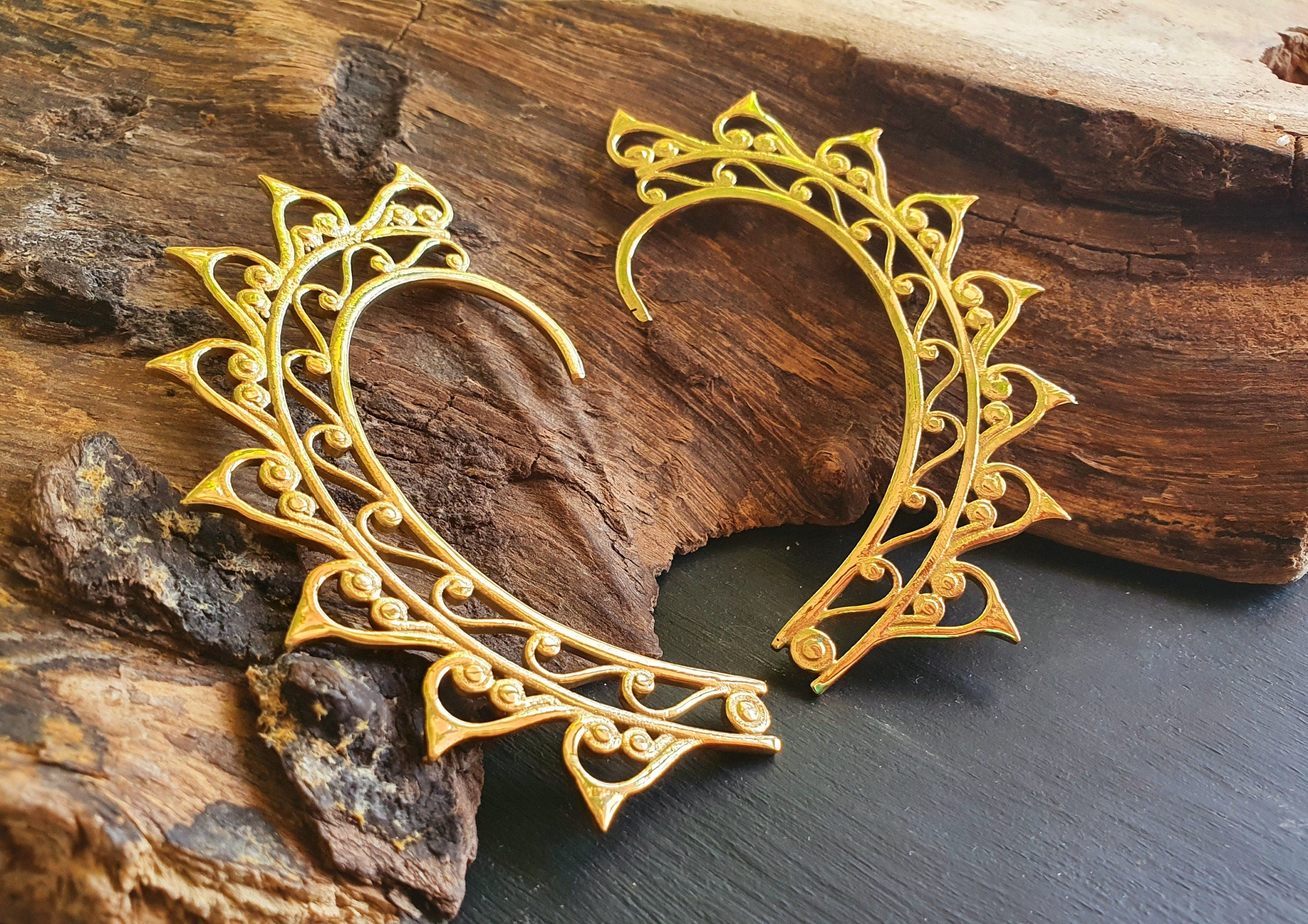 Ear cuff in solid brass with decorative design.