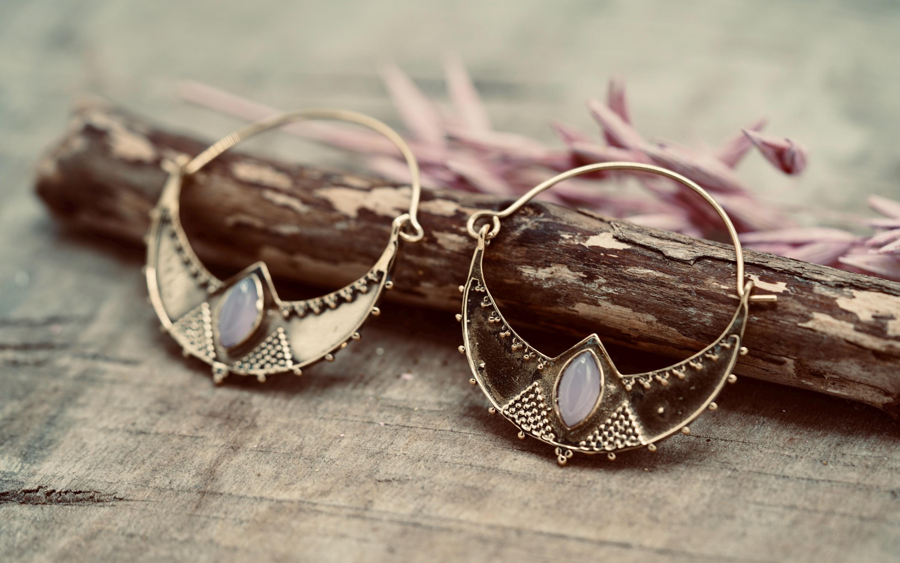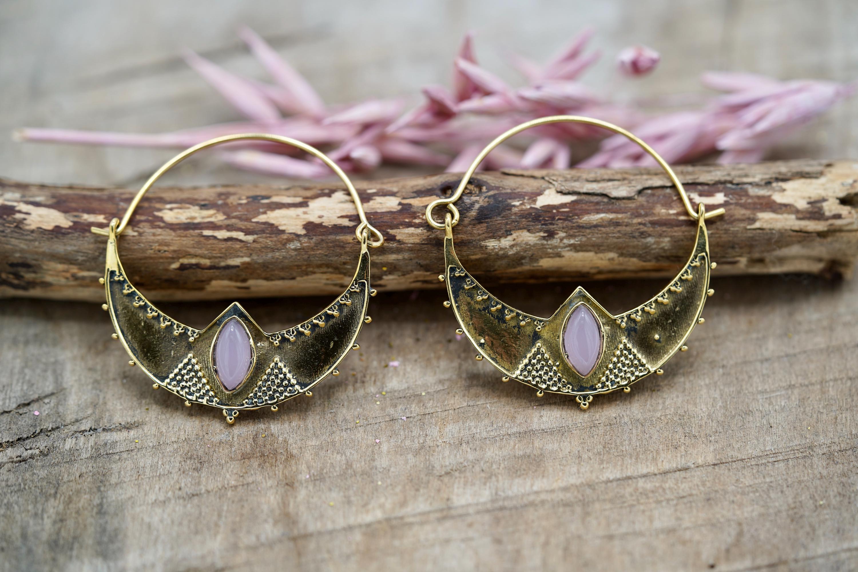 Ethnic Brass Hoop Earrings with Lapis Lazuli stones. These boho brass hoop earrings feature a refined, handcrafted design. Each hoop is adorned with a textured brass crescent, delicately hammered and accented with fine granulated details that add depth and character.