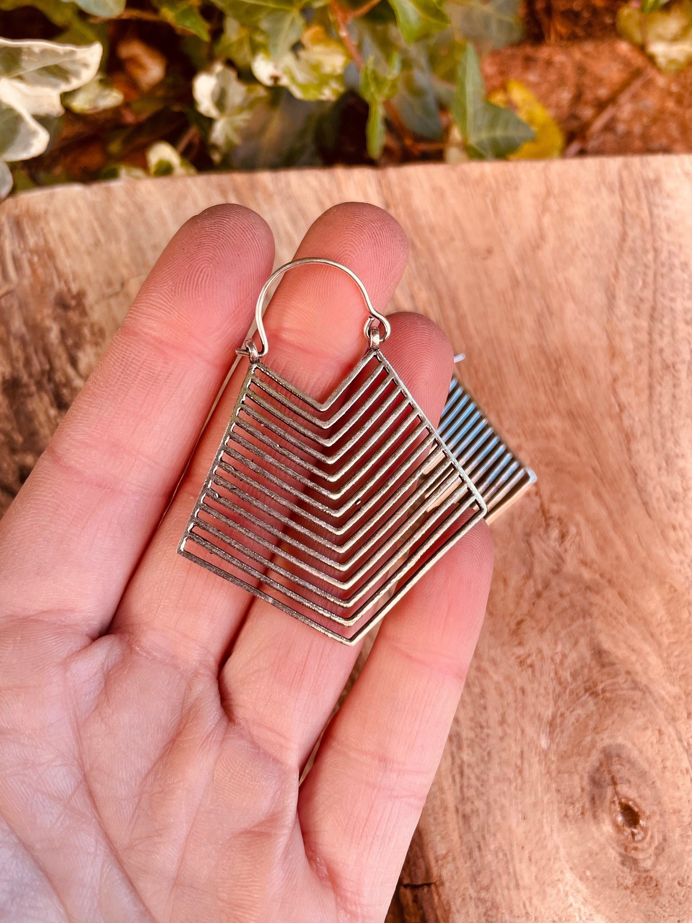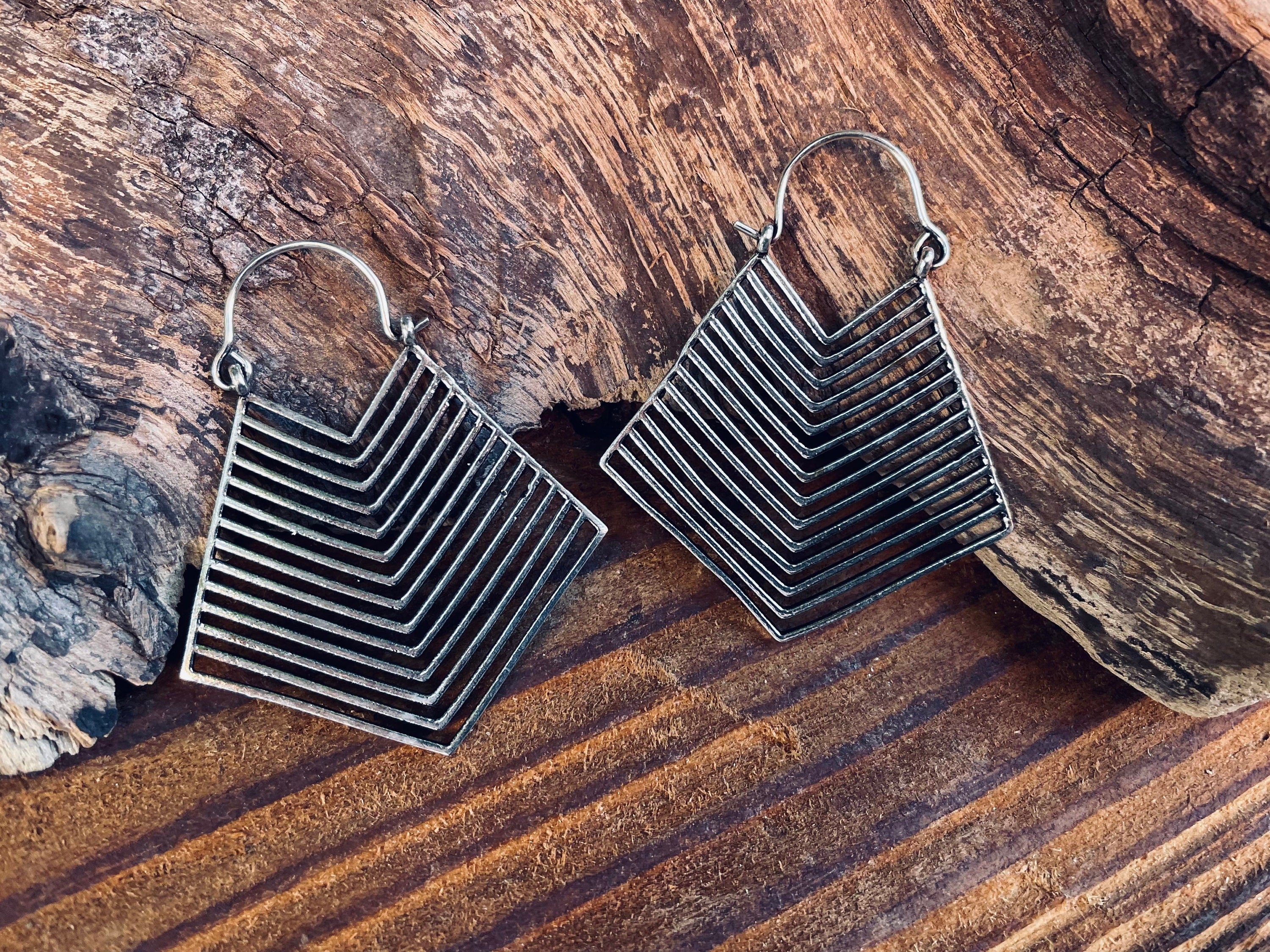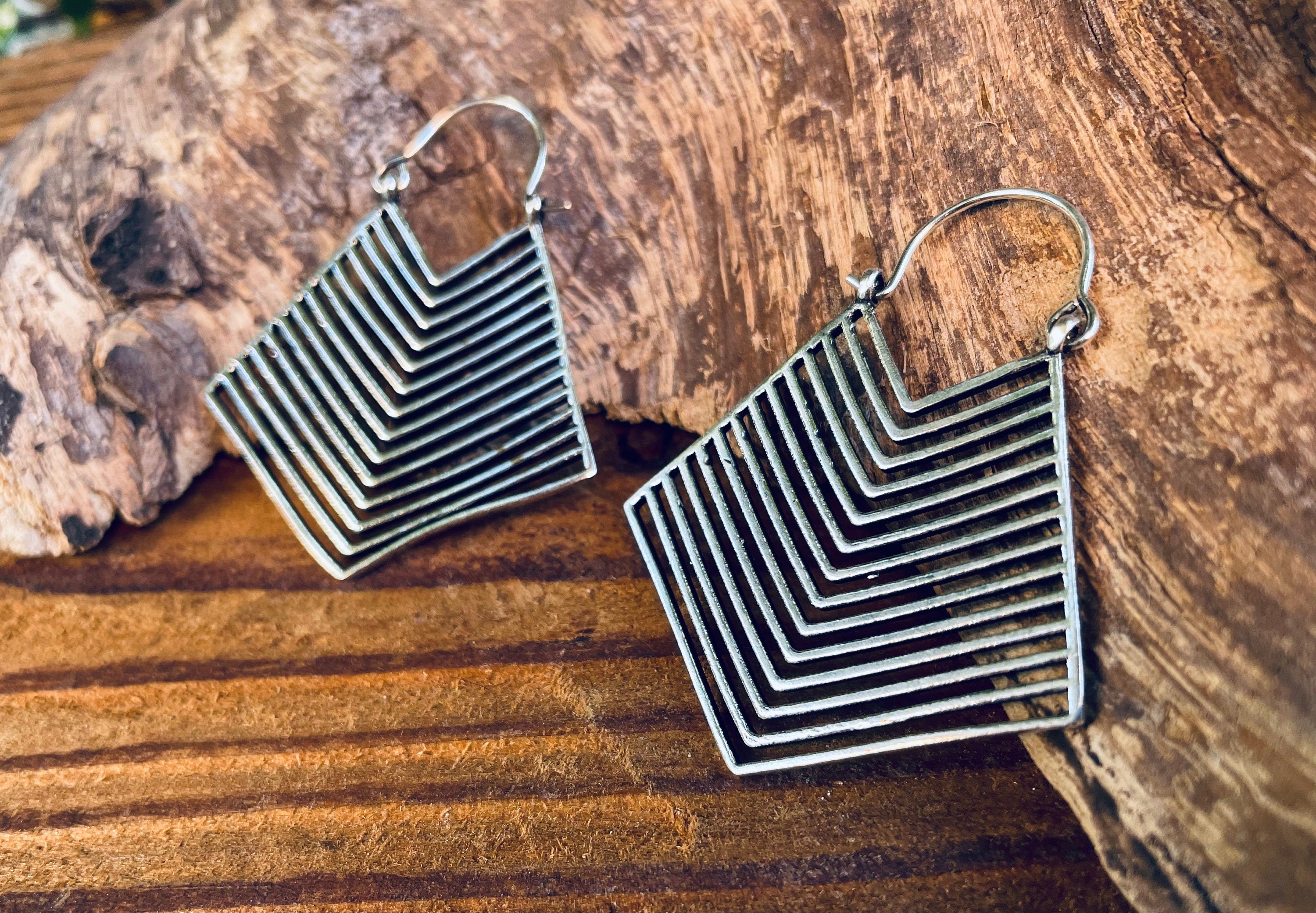 Boucles d'oreilles argentées de style géométrique d'inspiration aztèque.