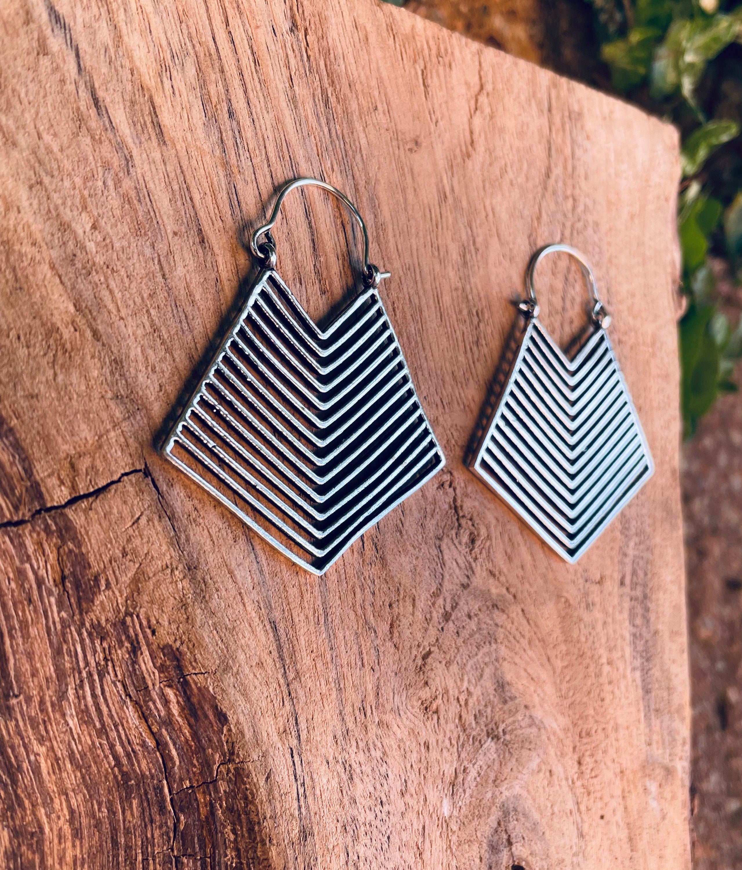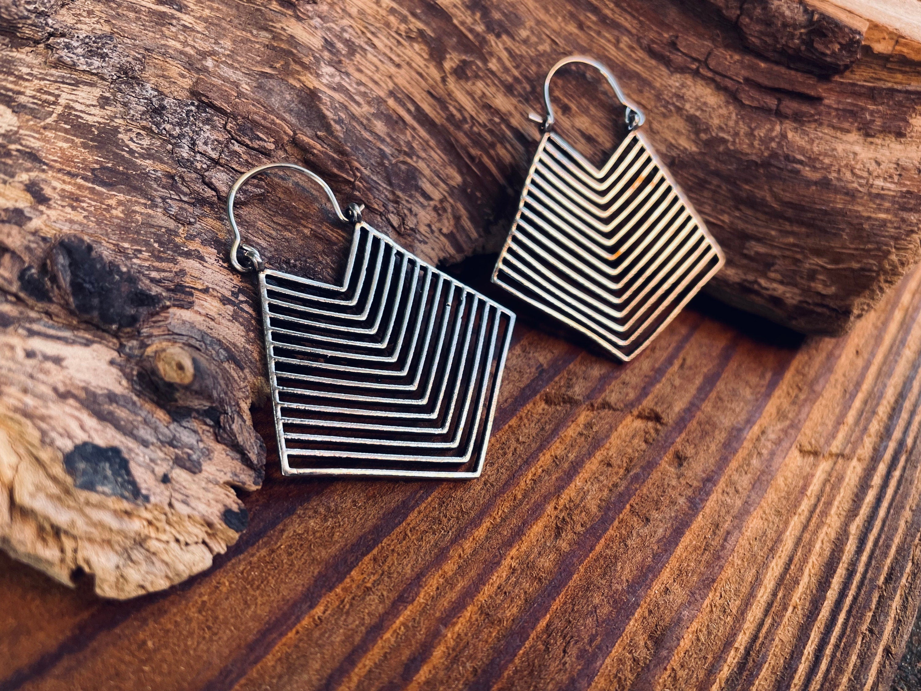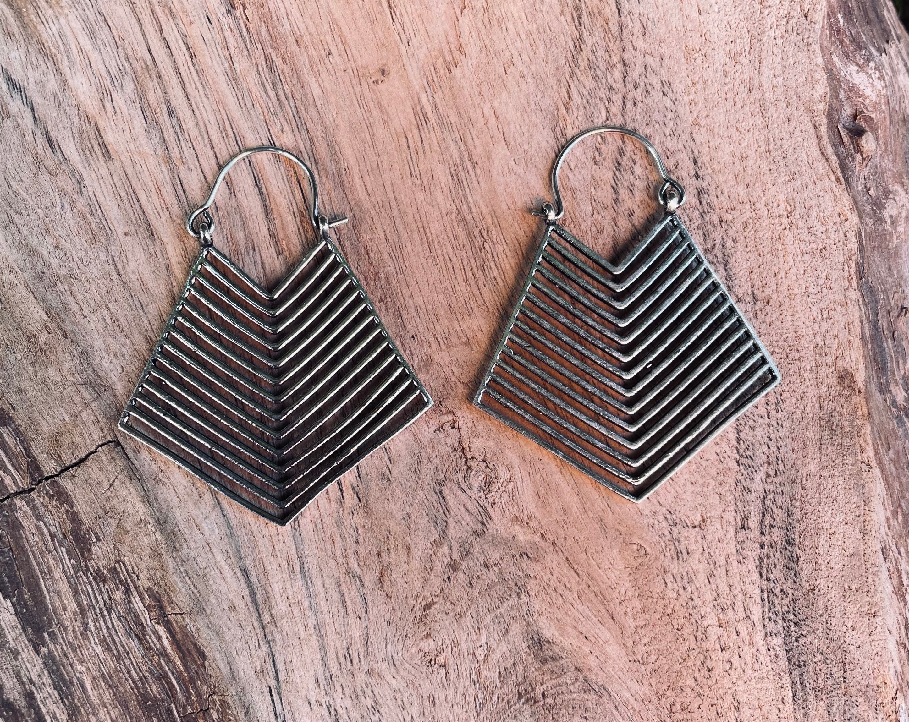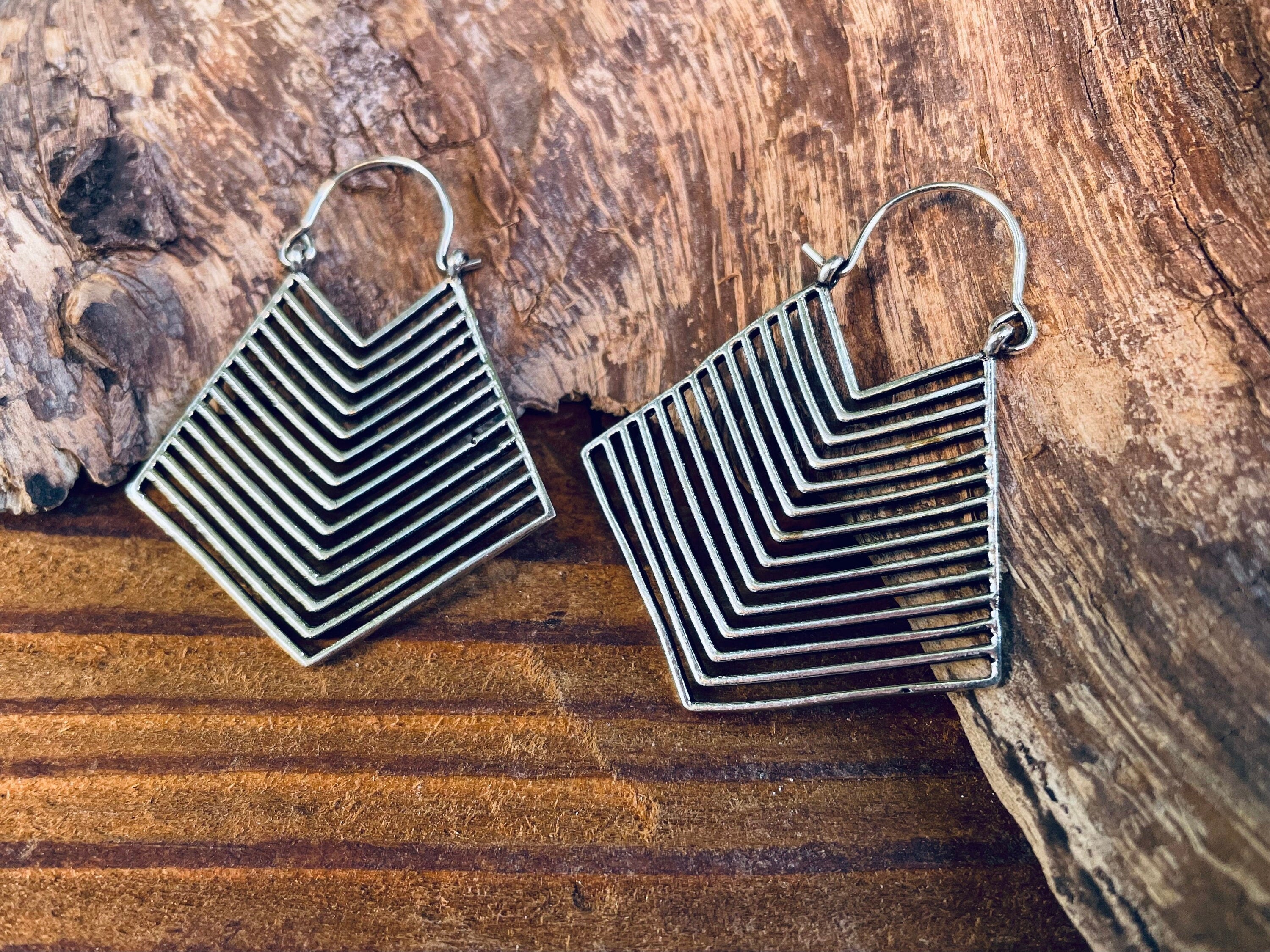 Boucles d'oreilles argentées de style géométrique d'inspiration aztèque.