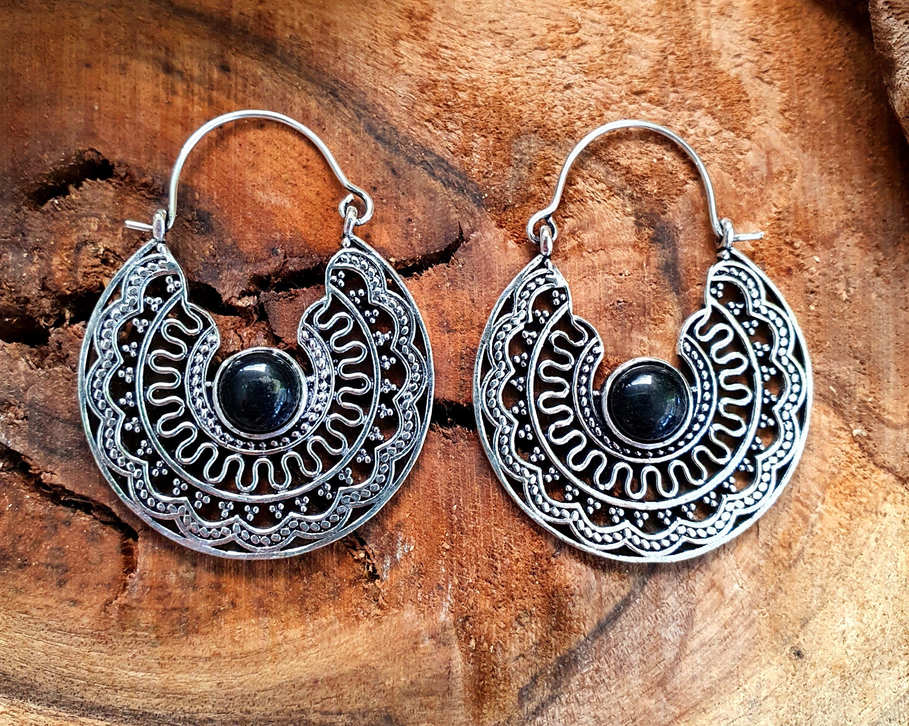 Boucles d'oreilles créoles en argent et onyx noir aztèque Ethnique