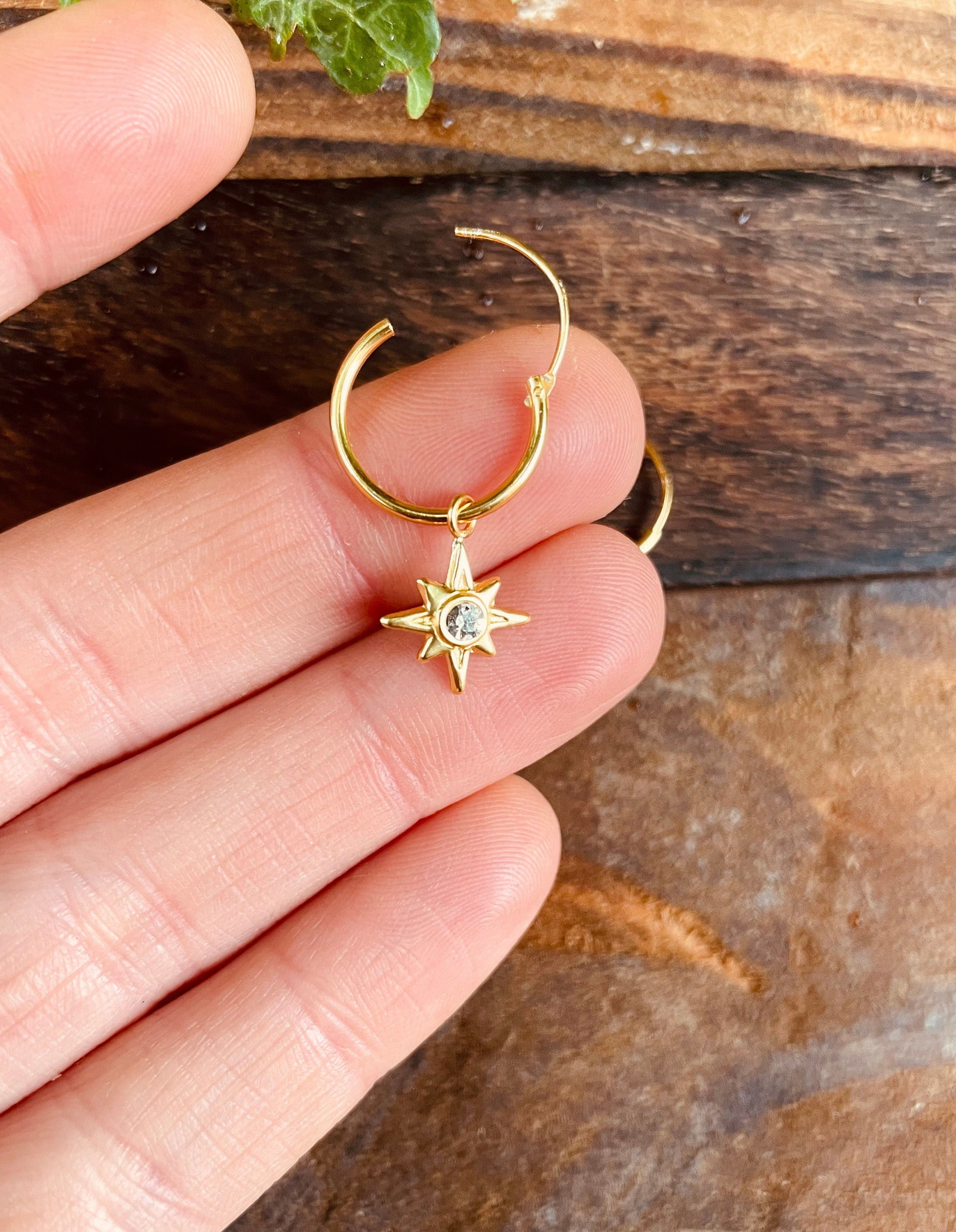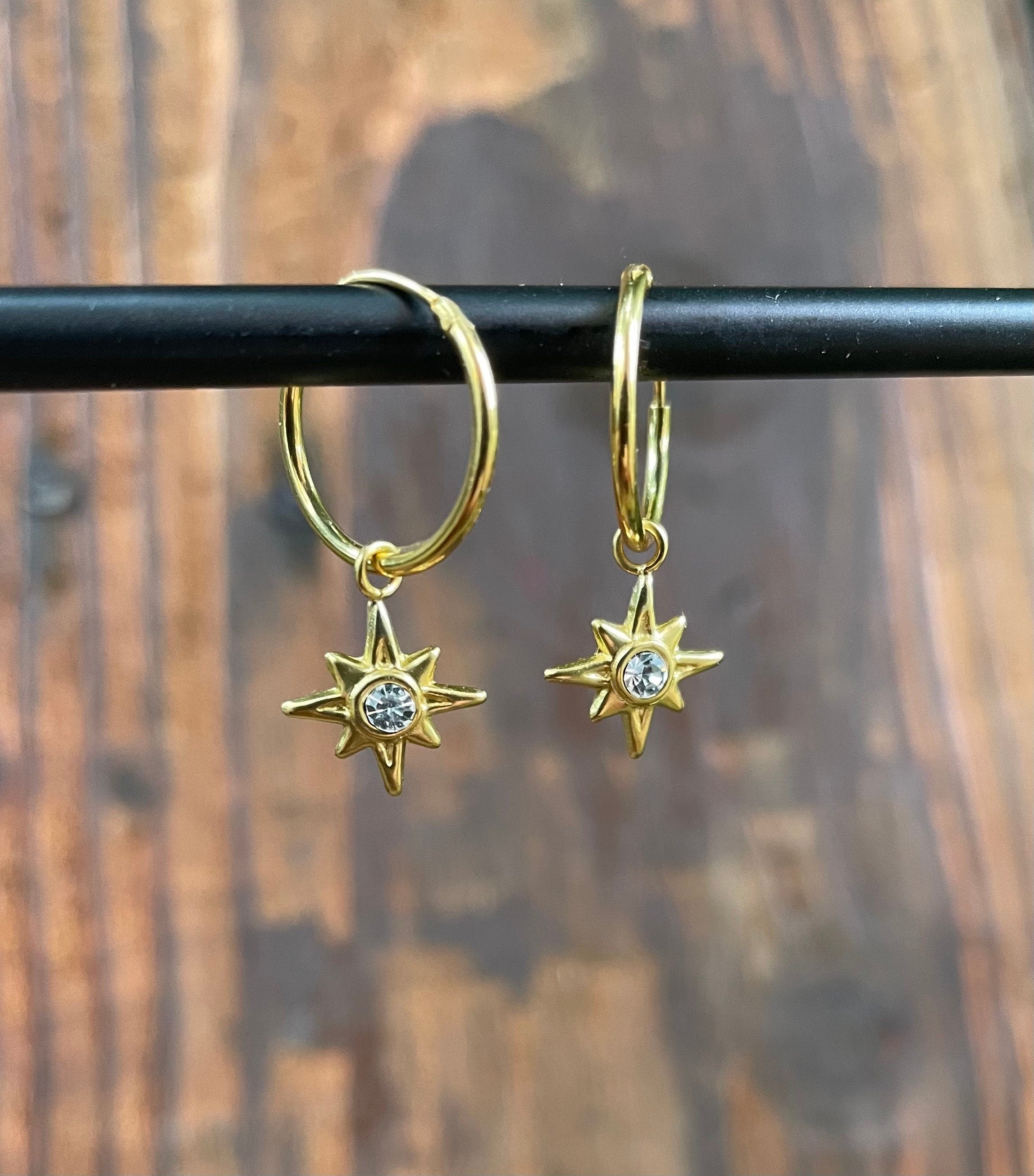 Boucles d'oreilles créoles en argent sterling 925 plaqué or avec étoiles en cristal.