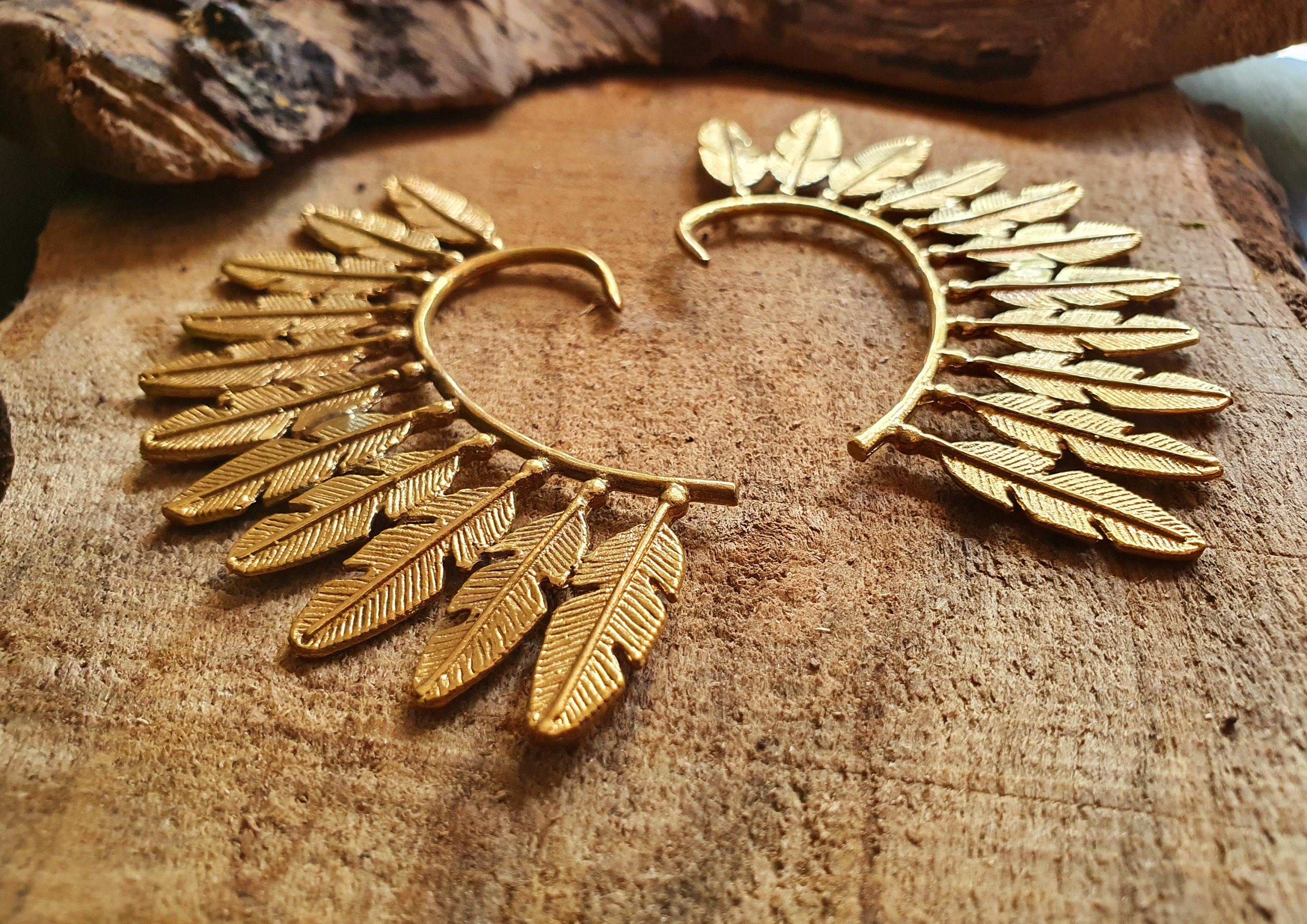 Manchette d'oreille en laiton massif avec motif de plumes décoratives.