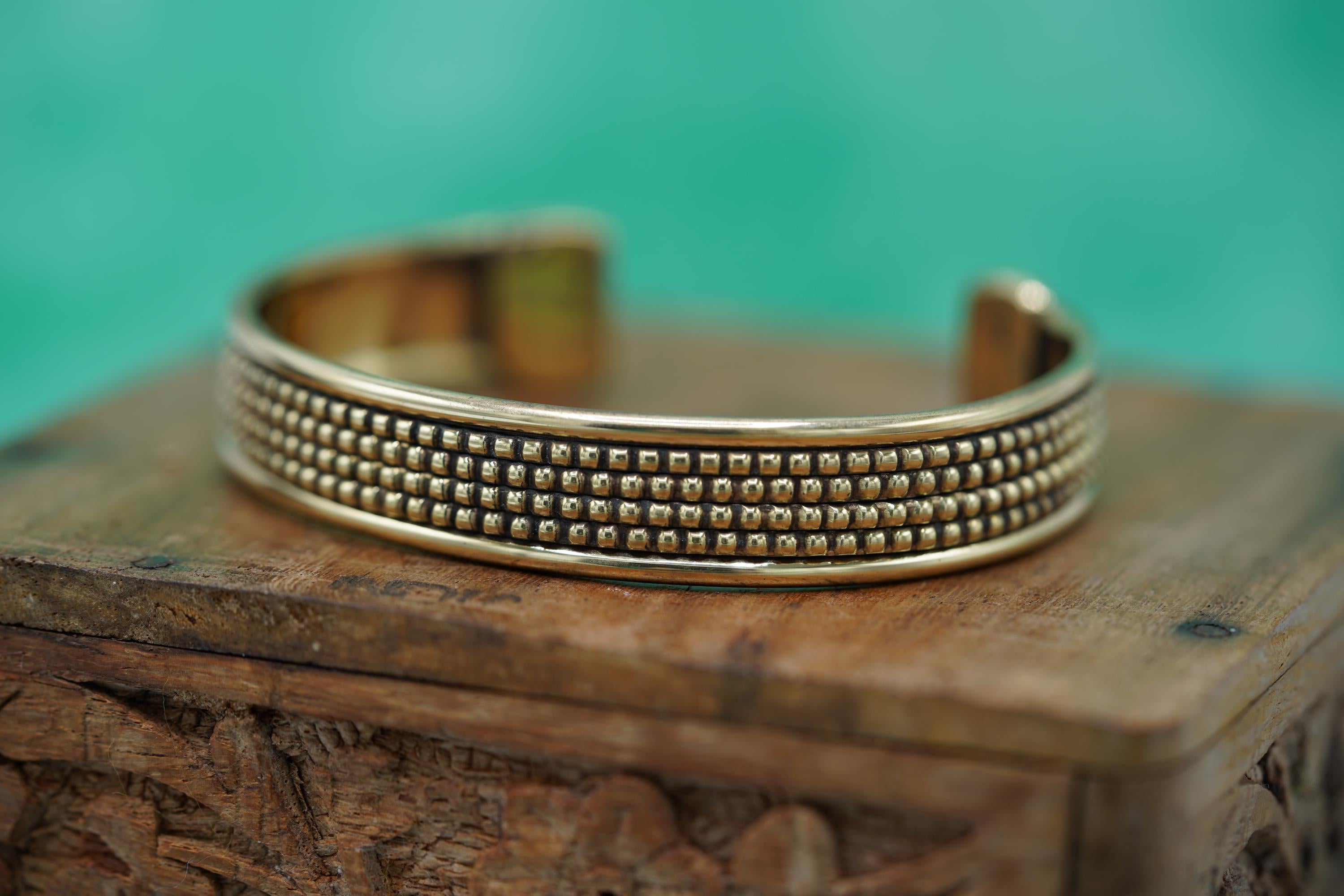 This beautiful bohemian cuff bracelet features a detailed textured beaded pattern, giving it a timeless, handcrafted look. Its warm metallic finish and vintage-inspired design make it the perfect accessory for anyone who loves boho, ethnic, or rustic-chic jewellery.