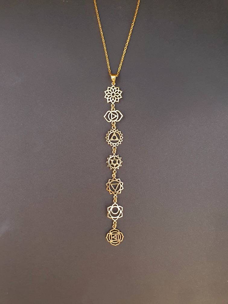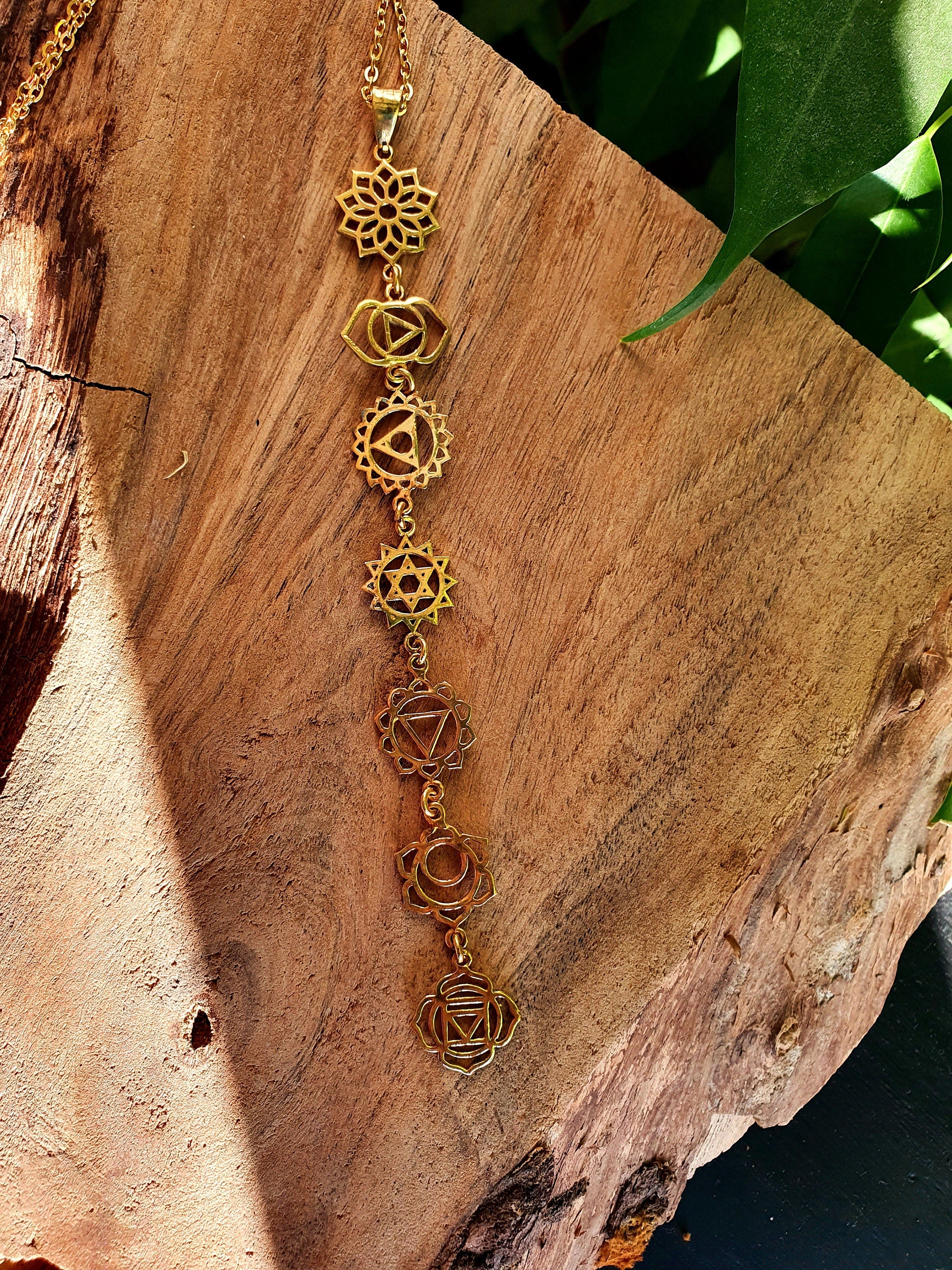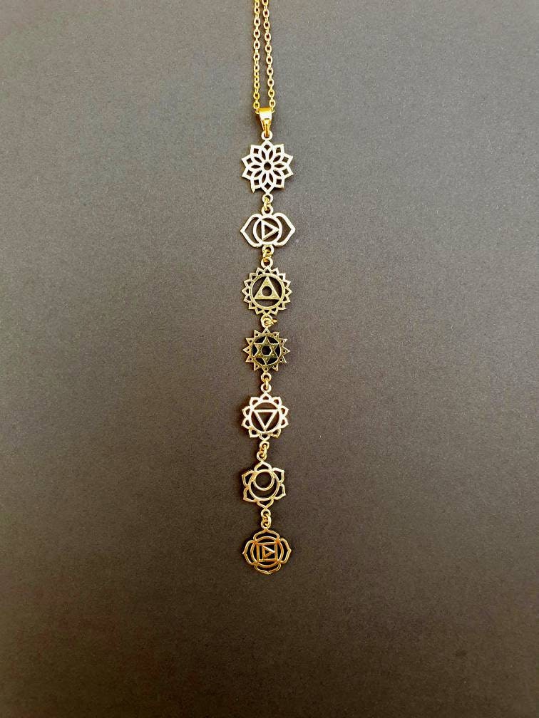 Golden Seven Chakras pendant with choice of chain and optional gift box.