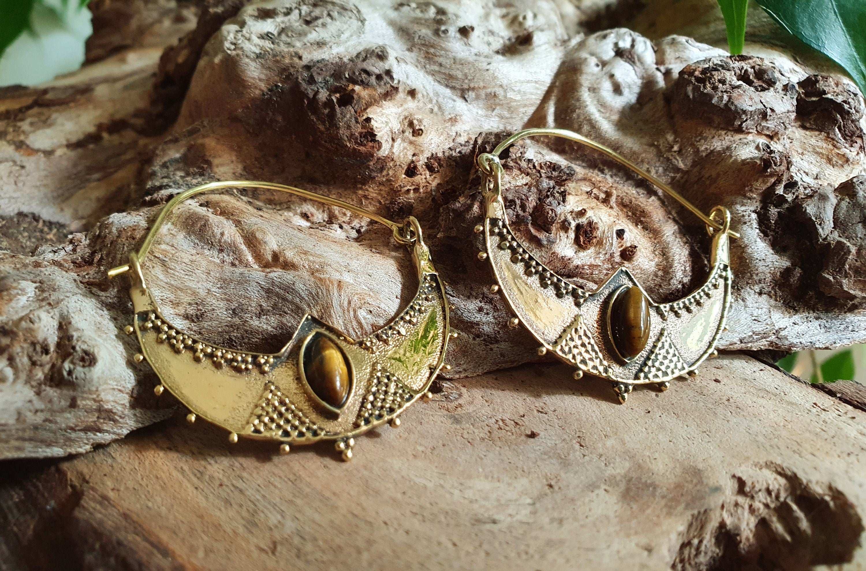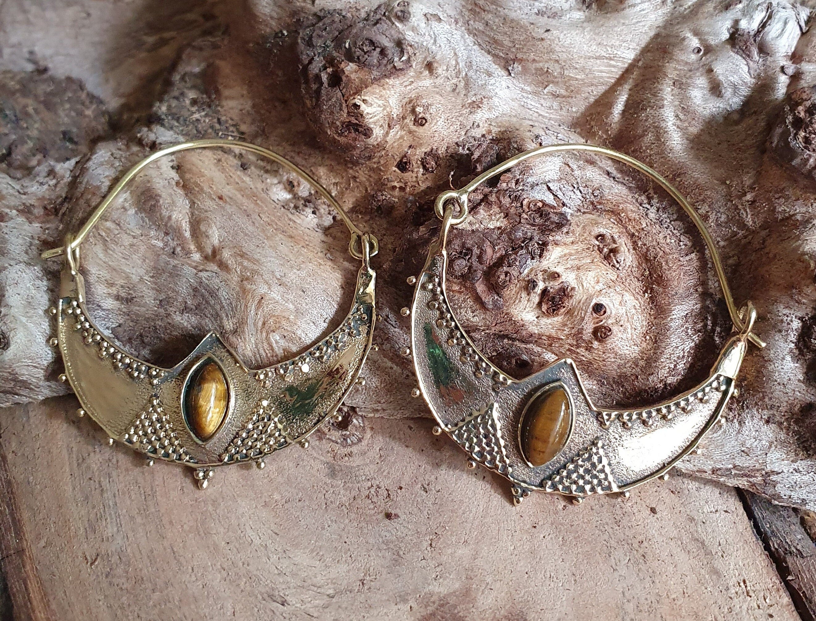 Tiger Eye & Brass Ethnic Hoop Earrings
